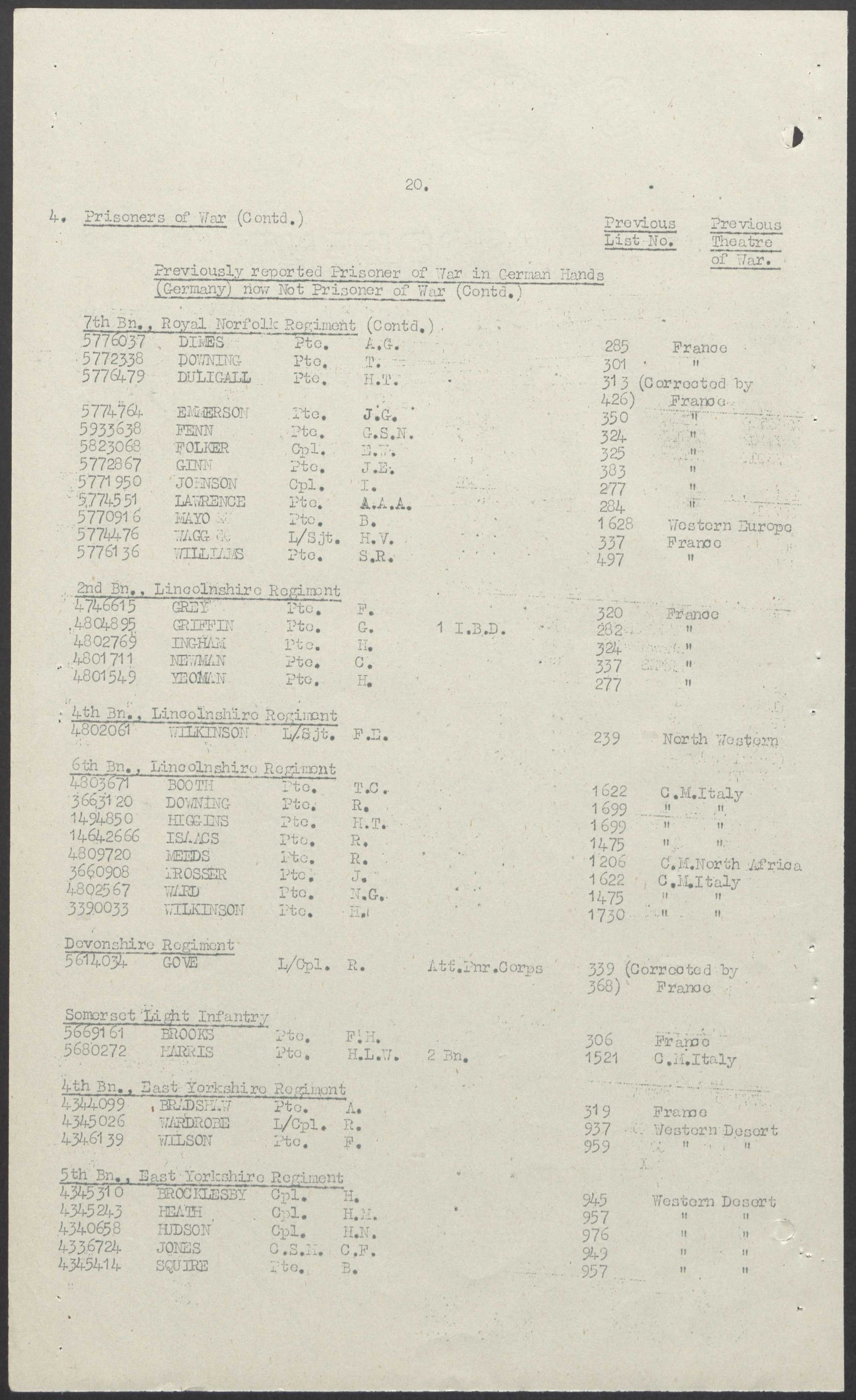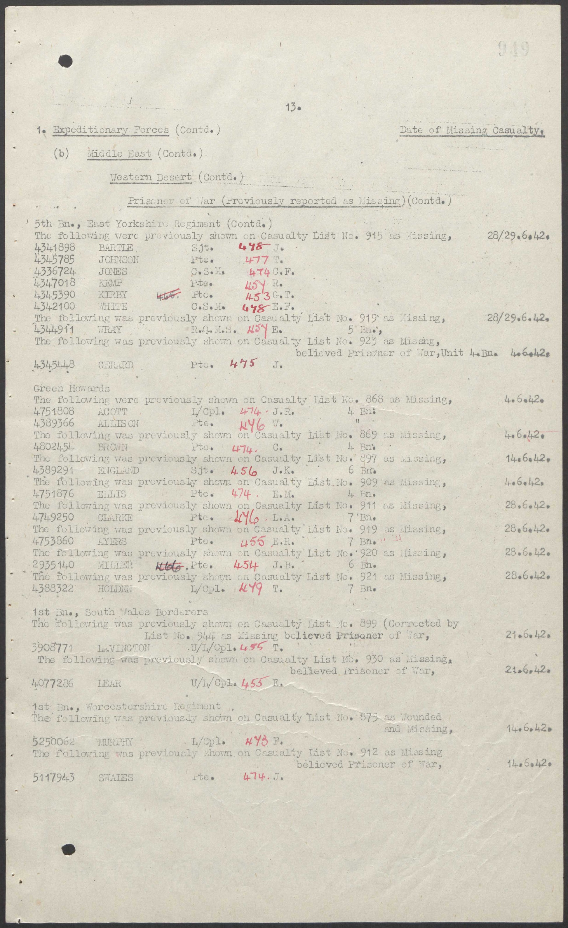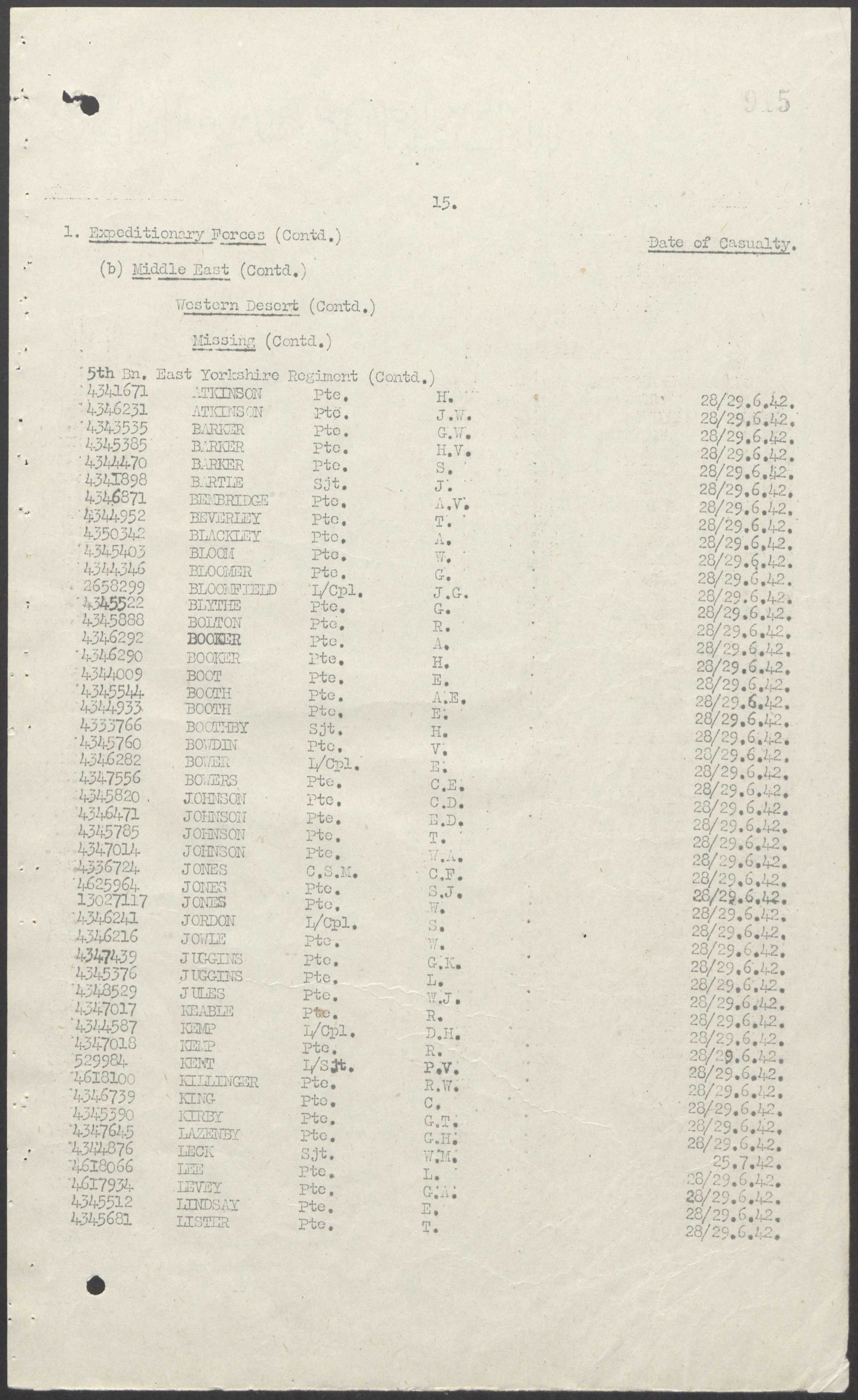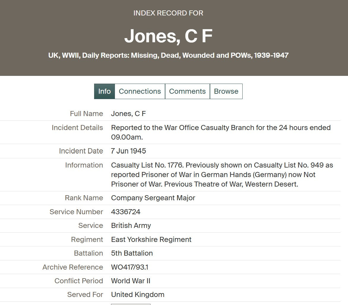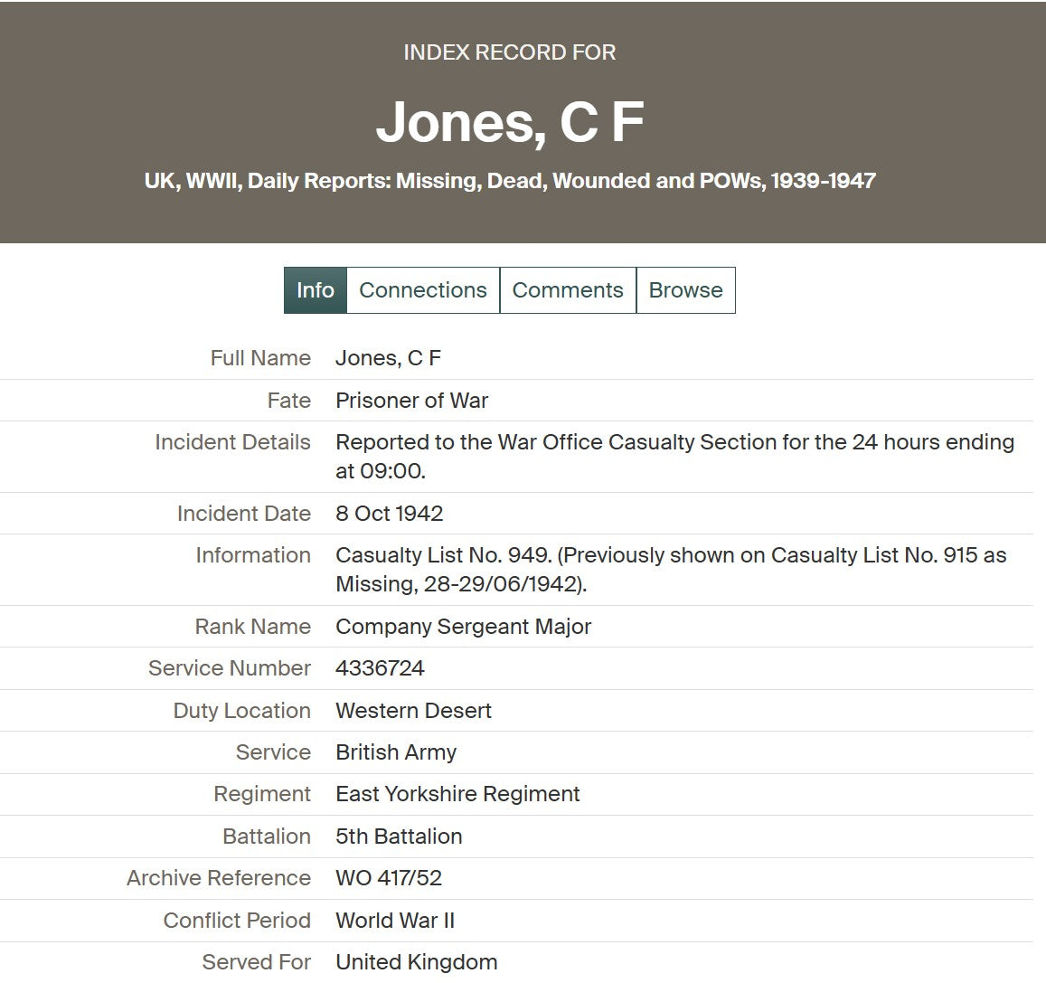 In early 1942, the battalion was serving in the Western Desert, engaged in the bitter fighting that followed Rommel’s offensive towards Tobruk and Gazala. During these operations, the East Yorkshires were heavily involved in defensive actions around Sid el Enish, where Company Sergeant Major Jones was captured on 1 July 1942, during the chaotic retreat following the fall of Tobruk. His War Office casualty report first listed him as missing (June 1942), later confirmed as Prisoner of War in October 1942.