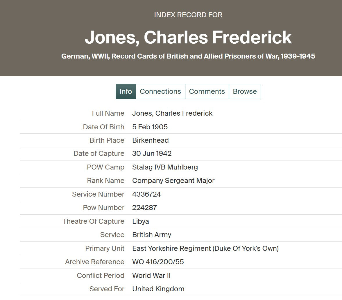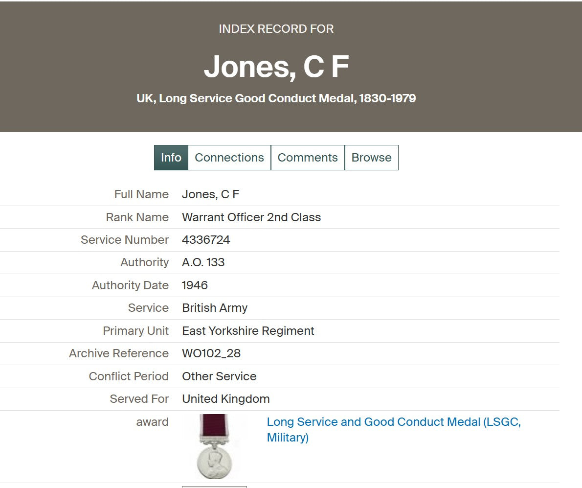Company Sergeant Major Charles Frederick Jones’s story reflects the courage and endurance of the professional British soldier — a Regular who served through the interwar years, fought across the deserts of North Africa, endured imprisonment in Italy and Germany, and returned home with an unblemished record of loyalty and leadership. His long service medal and wartime experiences together represent nearly 25 years of continuous devotion to duty in the East Yorkshire Regiment.