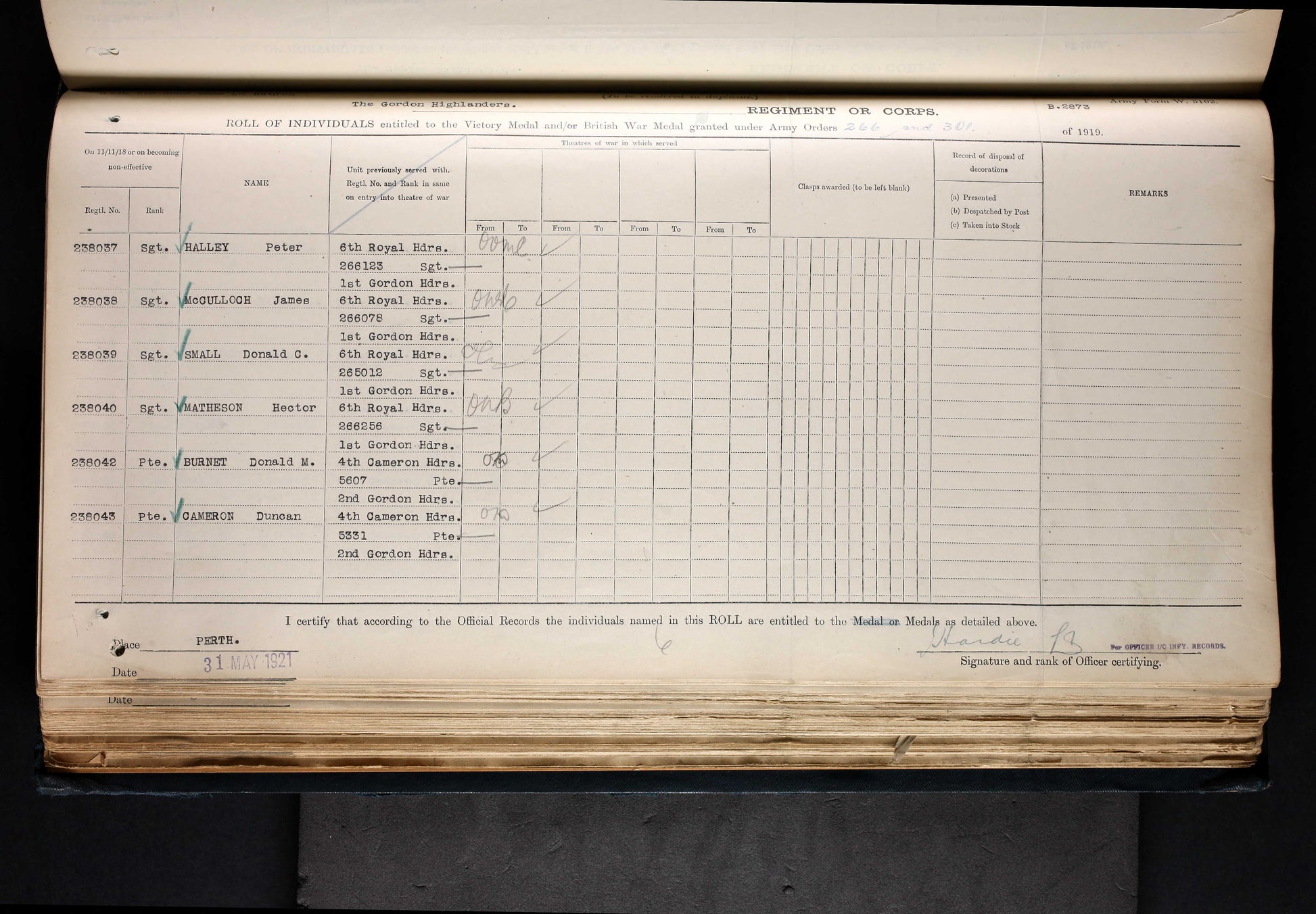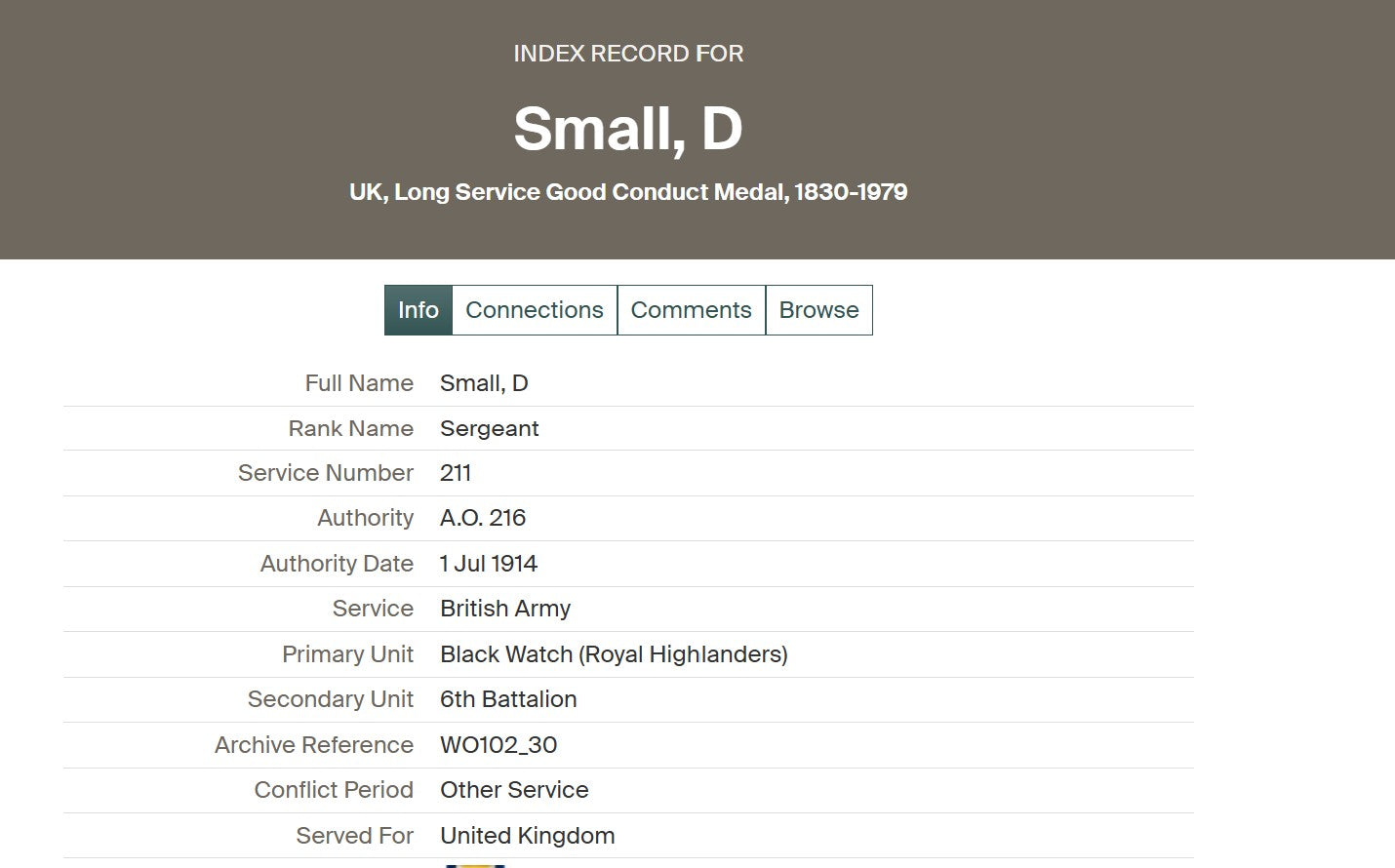 During the Great War he served with the 6th Bn. Black Watch (Royal Highlanders) before transferring to the 1st Battalion, Gordon Highlanders. He attained the rank of Serjeant, service number 238039.