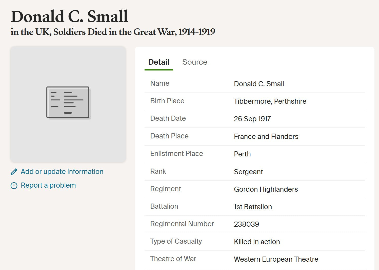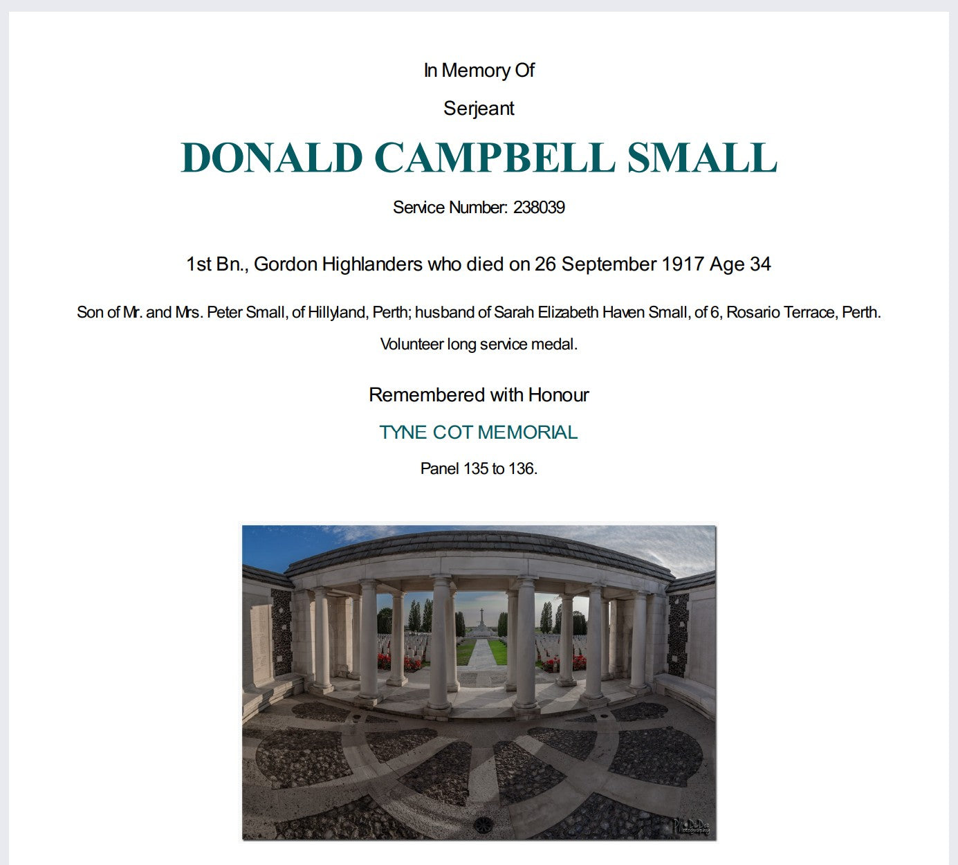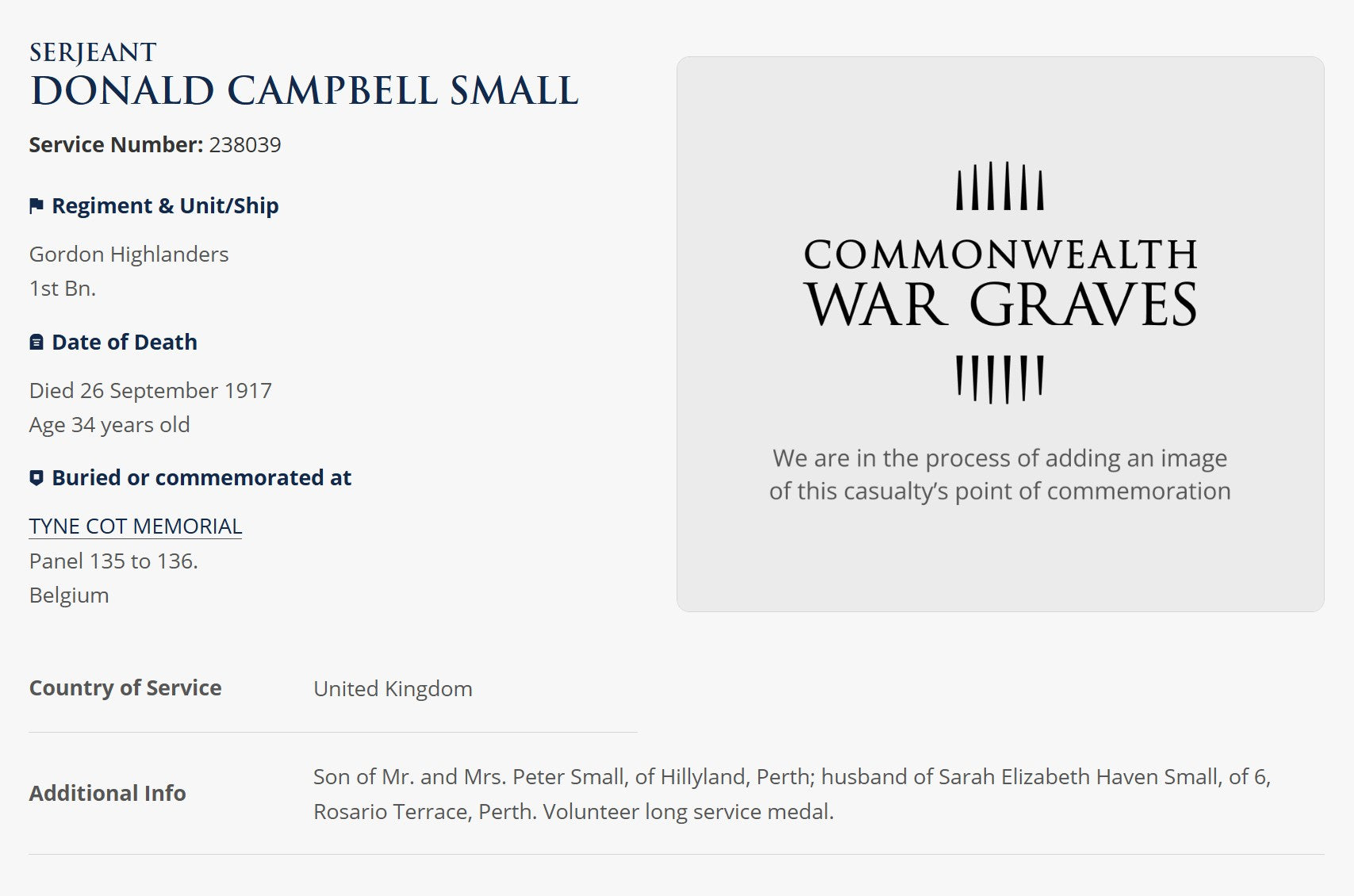 By 1917 he was serving on the Western Front with the 1st Gordons. On 26 September 1917, during operations at Zonnebeke, Belgium, in the Third Battle of Ypres, Serjeant Donald Campbell Small was killed in action, aged 34.