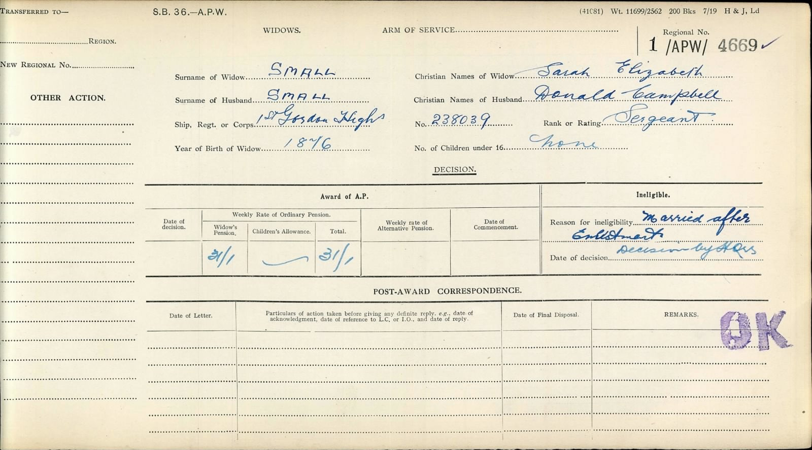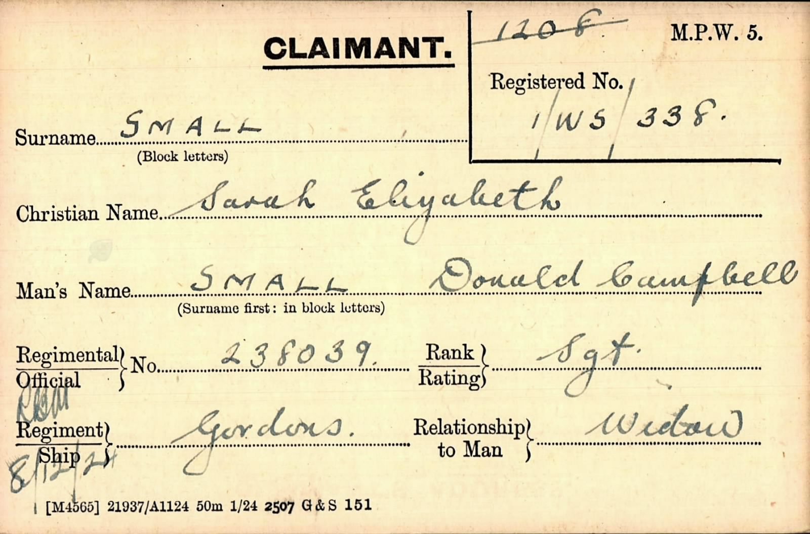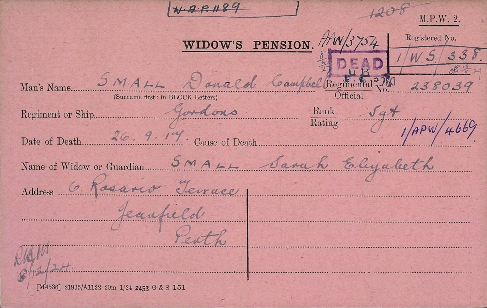 By 1917 he was serving on the Western Front with the 1st Gordons. On 26 September 1917, during operations at Zonnebeke, Belgium, in the Third Battle of Ypres, Serjeant Donald Campbell Small was killed in action, aged 34.