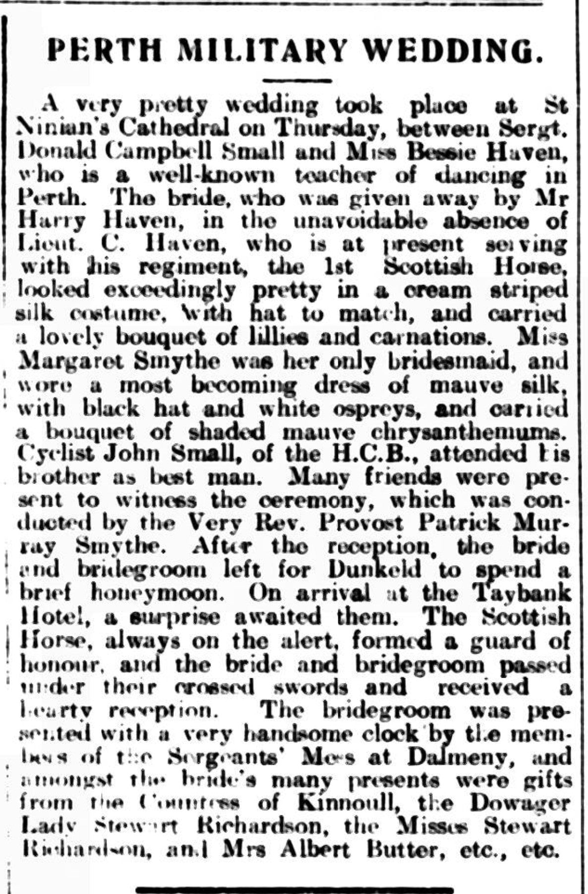 He later settled in Perth and married Sarah Elizabeth Haven, a dressmaker of 6 Rosario Terrace, Jeanfield, Perth, at St Ninian’s Cathedral, Perth, on 14 January 1915. A contemporary newspaper report described the occasion as a “Perth Military Wedding,” noting that Sergeant Small’s wife’s father was serving with the 1st Scottish Horse at the time. The ceremony was conducted by the Very Rev. Provost Patrick Murray Smythe, and members of the Scottish Horse formed a guard of honour for the couple following the reception.