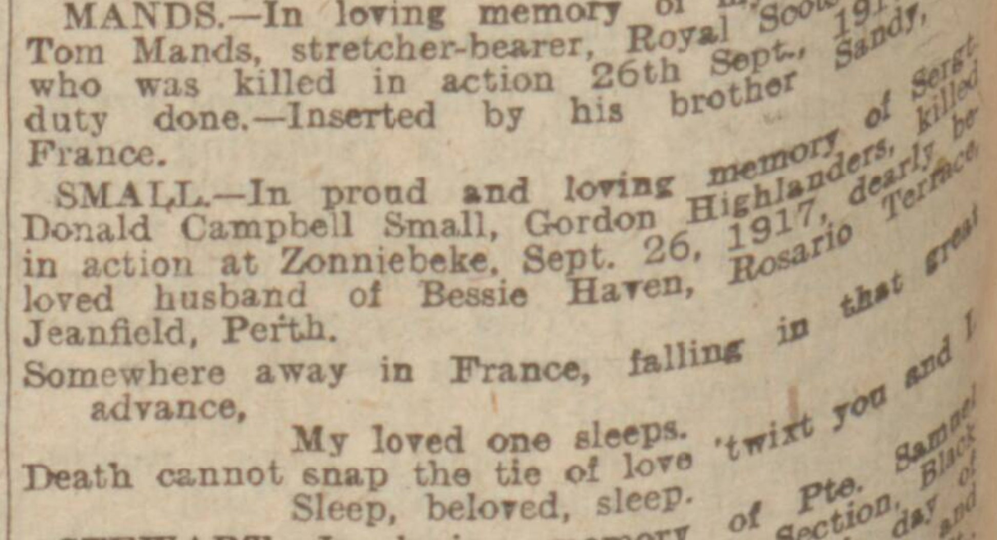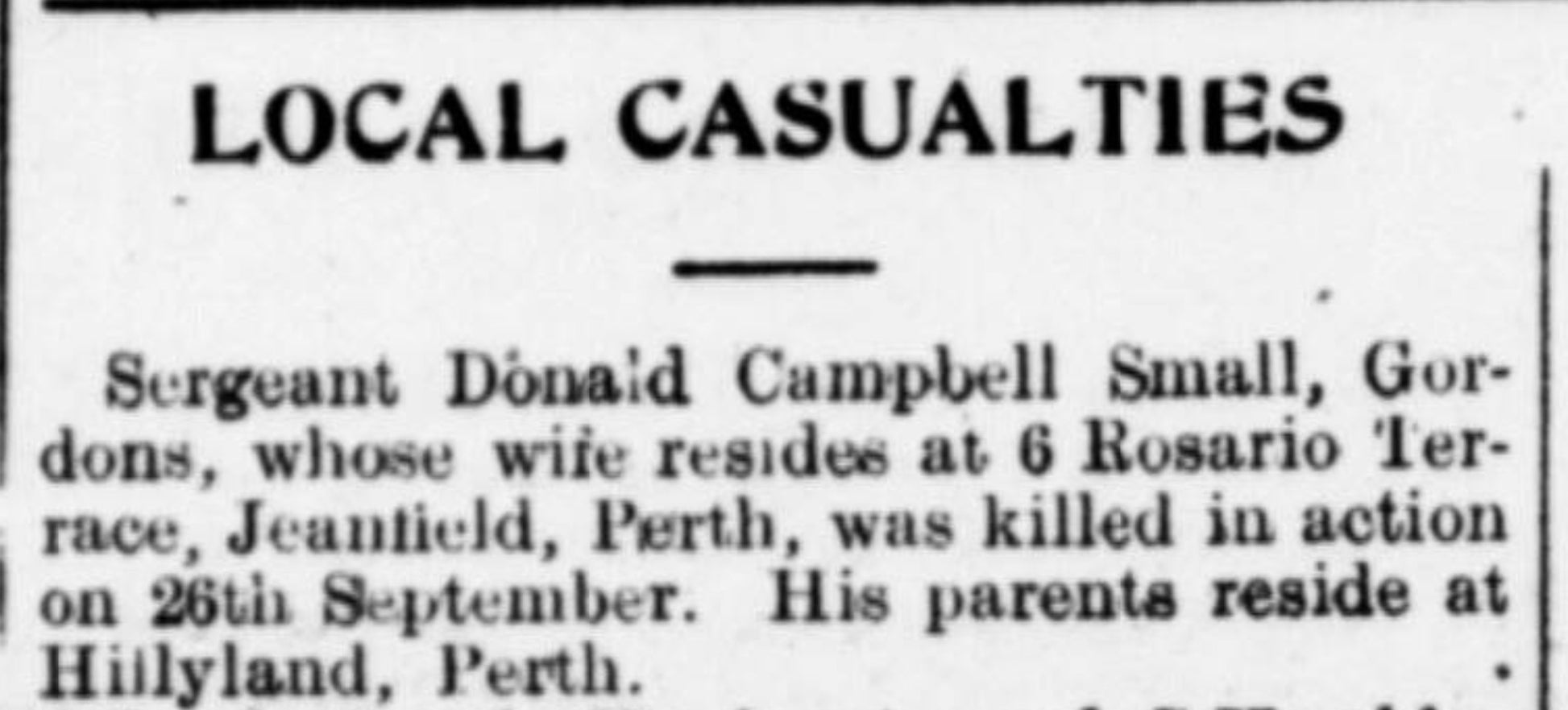 A local casualty report recorded that his wife resided at 6 Rosario Terrace, Jeanfield, Perth, and that his parents were living at Hillyland, Perth. His death was later commemorated in a family memorial notice describing him as killed in action at Zonnebeke on 26 September 1917, the dearly loved husband of Bessie Haven Small of Rosario Terrace, Perth.