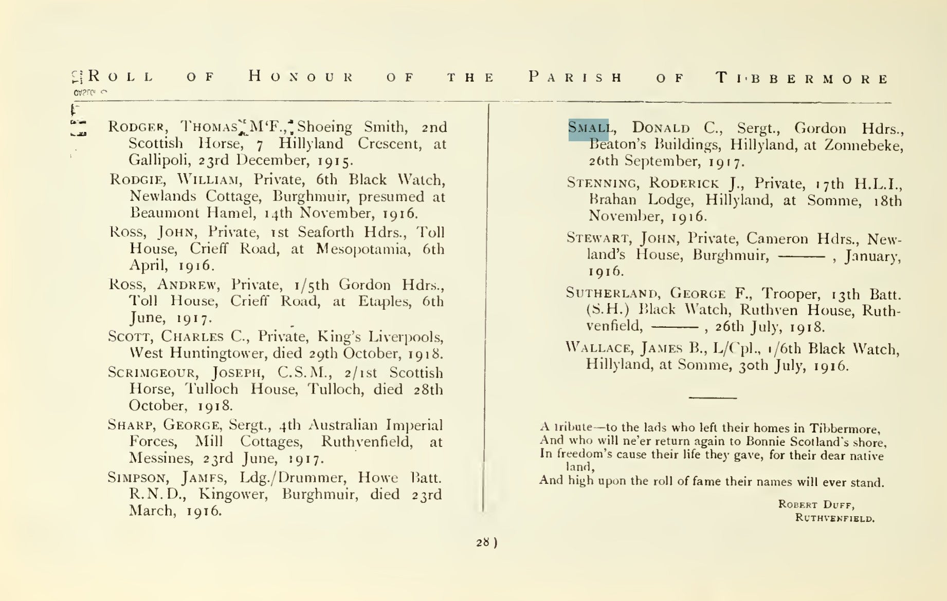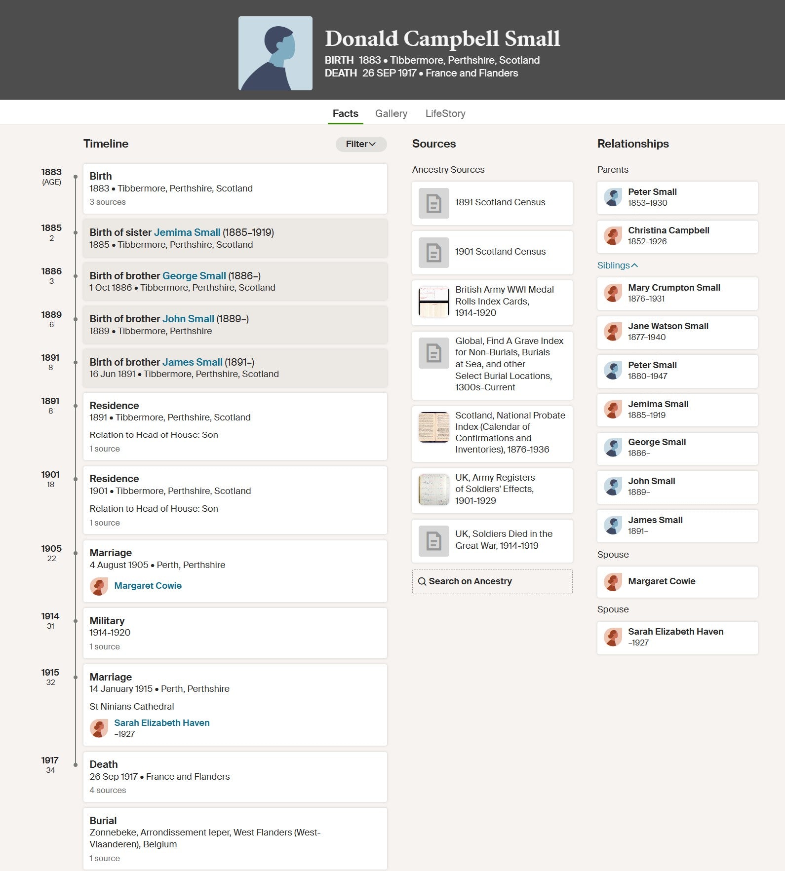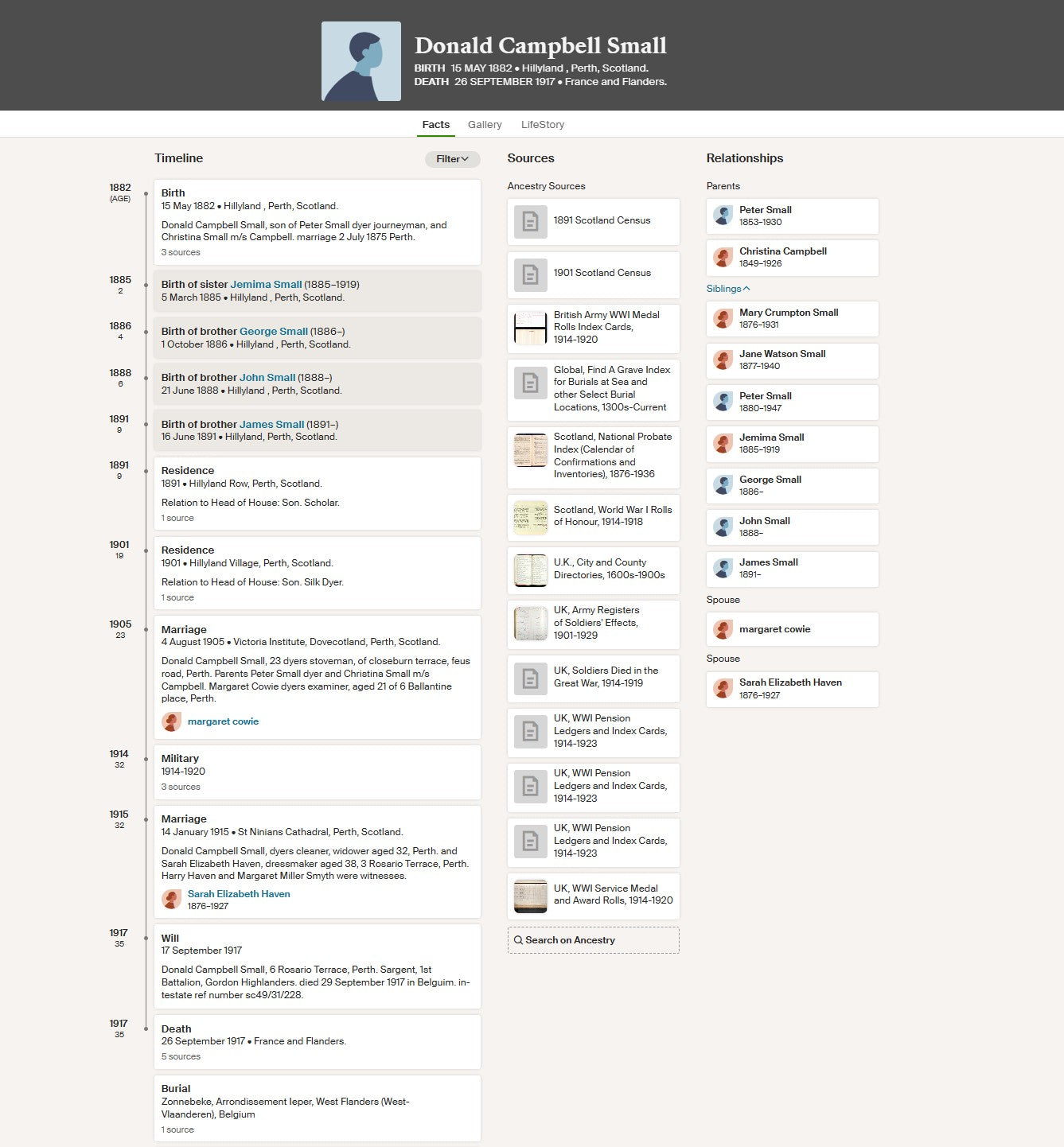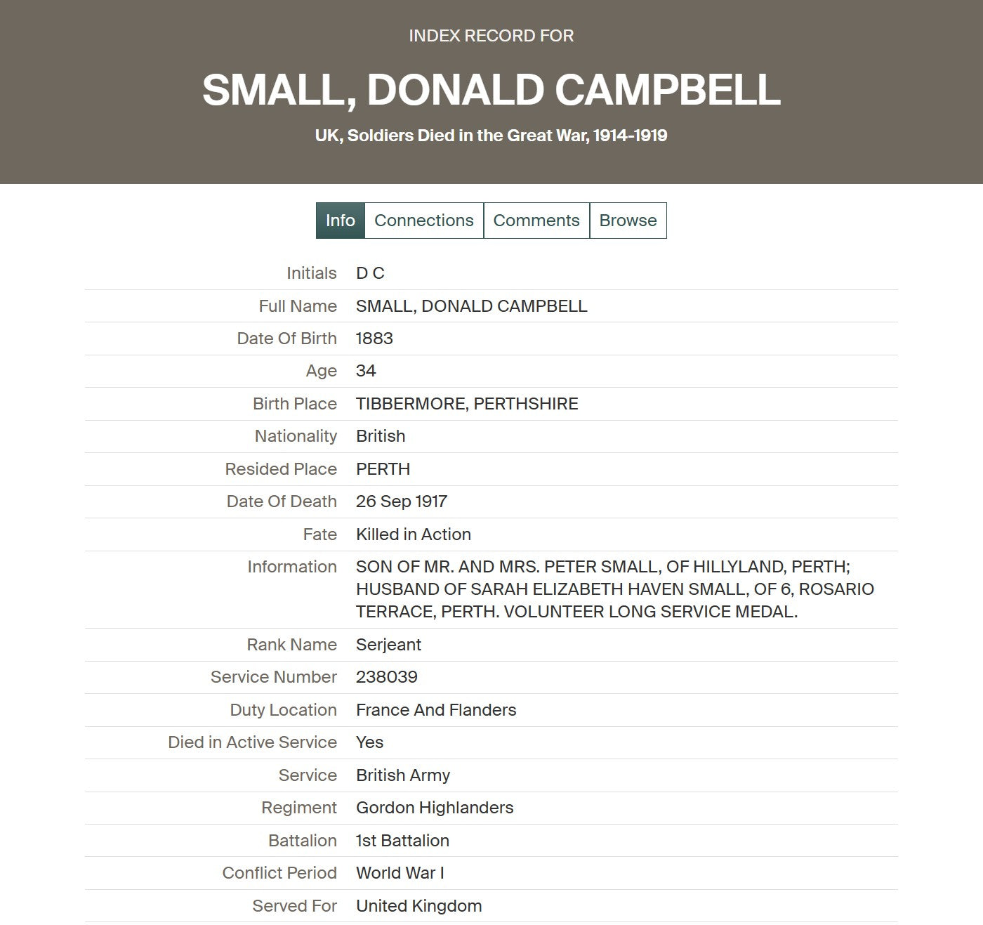Donald Campbell Small’s life reflects that of a Perthshire tradesman-soldier: a skilled worker in the local dyeing trade, long associated with the Volunteer movement, married at the height of the war, and killed in the fighting around Zonnebeke during the grim autumn battles of 1917.