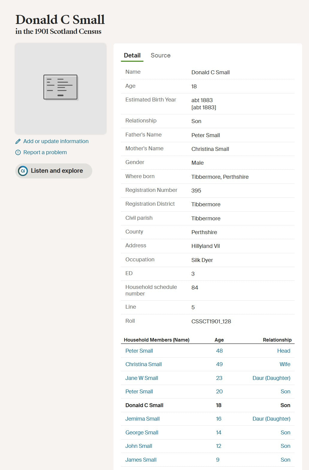 Donald Campbell Small was born on 15 May 1882 at Hillyland, Tibbermore, Perthshire, the son of Peter Small, a dyer, and Christina Small (née Campbell). At the time of the 1901 Census he was residing at Hillyland Village, Perthshire, aged eighteen, and employed as a silk dyer, reflecting his father’s trade.
