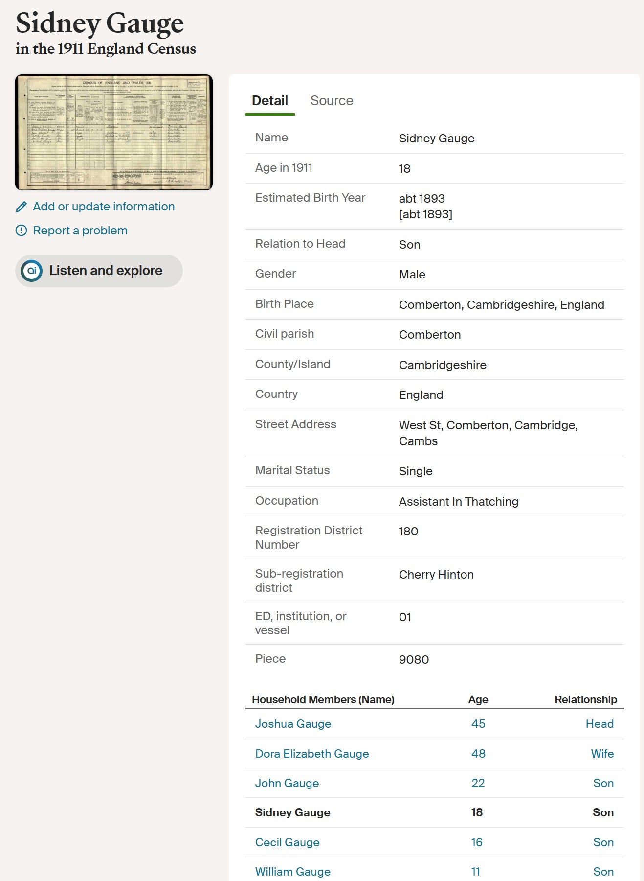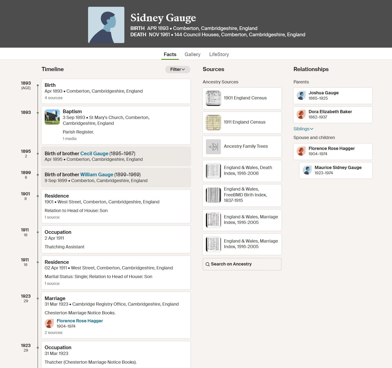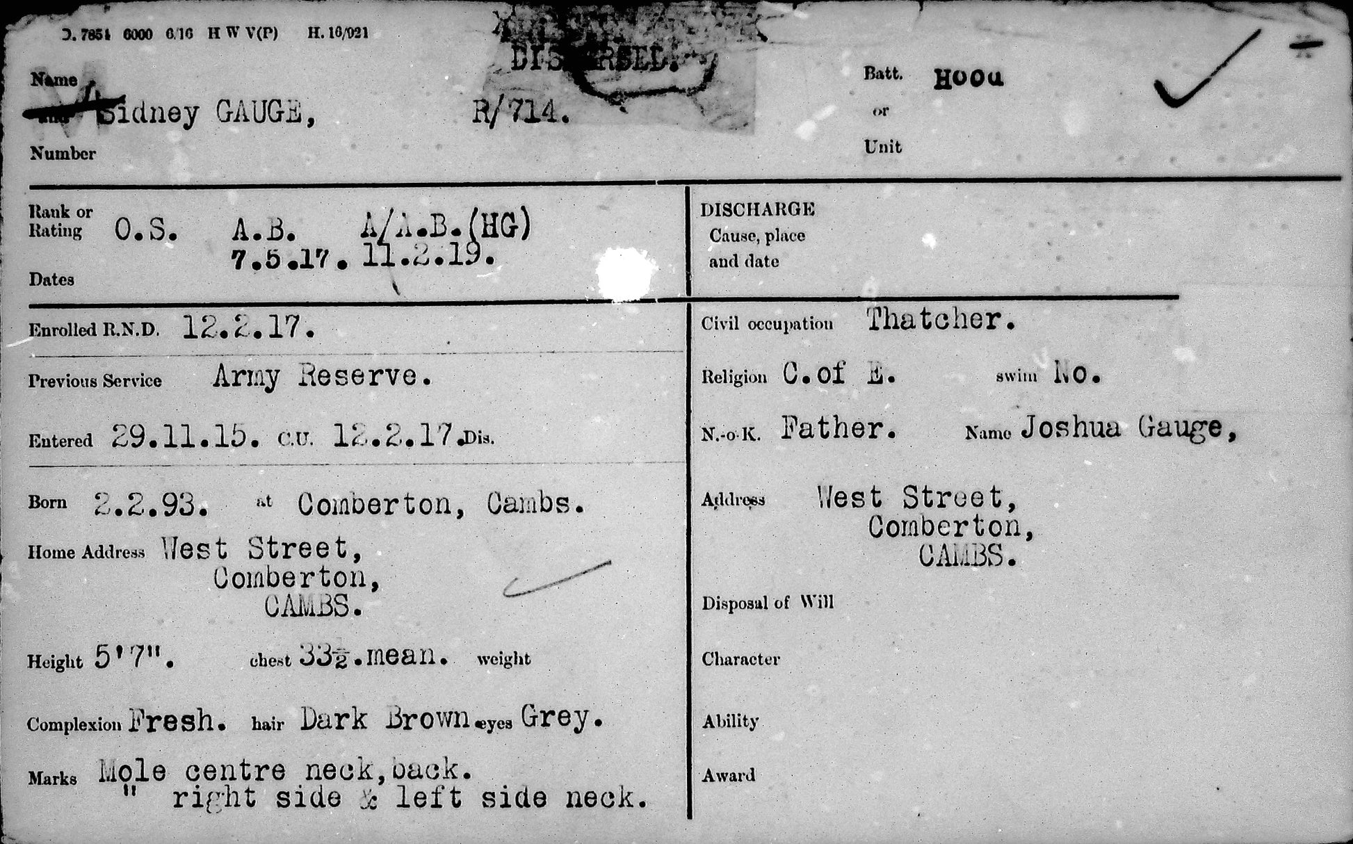 Able Seaman Sidney Gauge was born on 2 February 1893 at Comberton, Cambridgeshire, the son of Joshua and Dora Elizabeth Gauge of West Street, Comberton. He was baptised at St Mary’s Church, Comberton, in September 1893 and grew up in the village, appearing in the 1901 and 1911 Census returns. Before the war he worked as a thatcher, assisting his father in the trade.