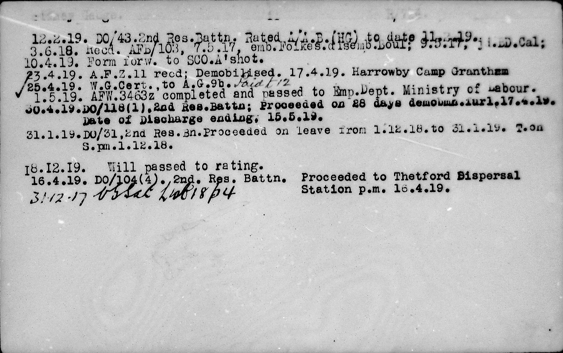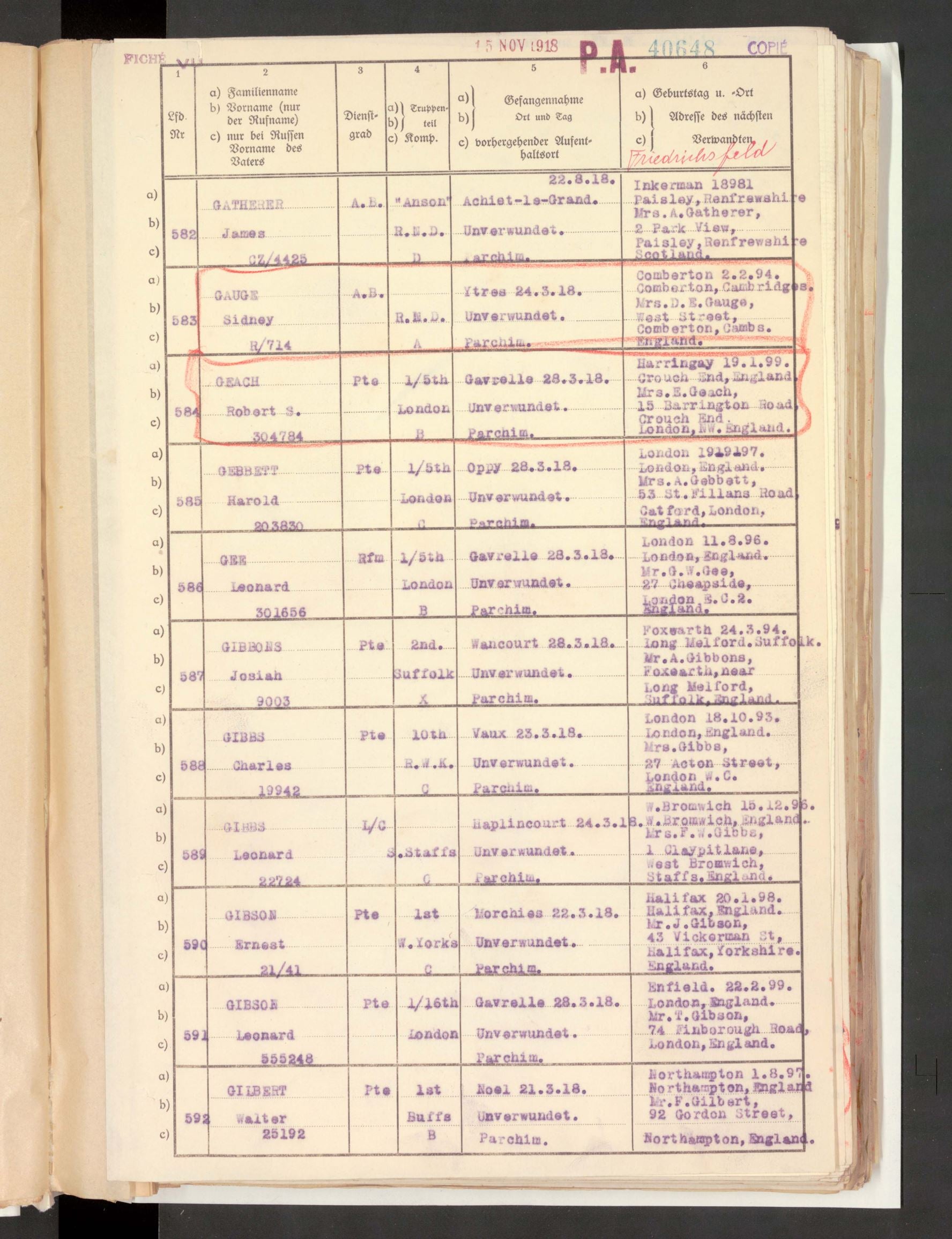 During the heavy fighting of the German Spring Offensive he was reported Missing on 24 March 1918. It was subsequently confirmed that he had been taken Prisoner of War, later officially recorded as “Previously reported Missing, now reported P.O.W. in German hands.” He was held at camps including Limburg and Parchim, and later Friedrichsfeld, before being repatriated on 29 November 1918, arriving back in England after the Armistice.