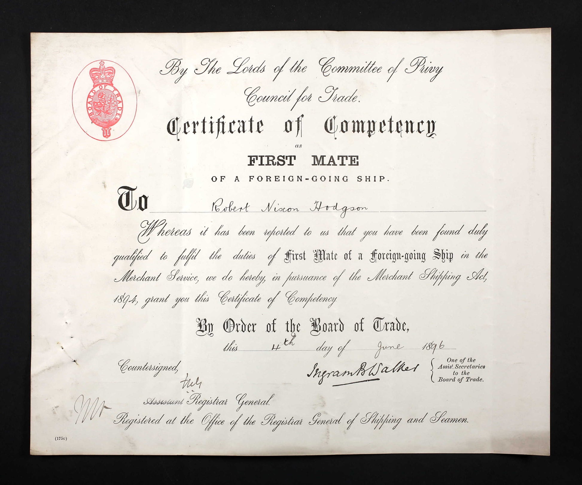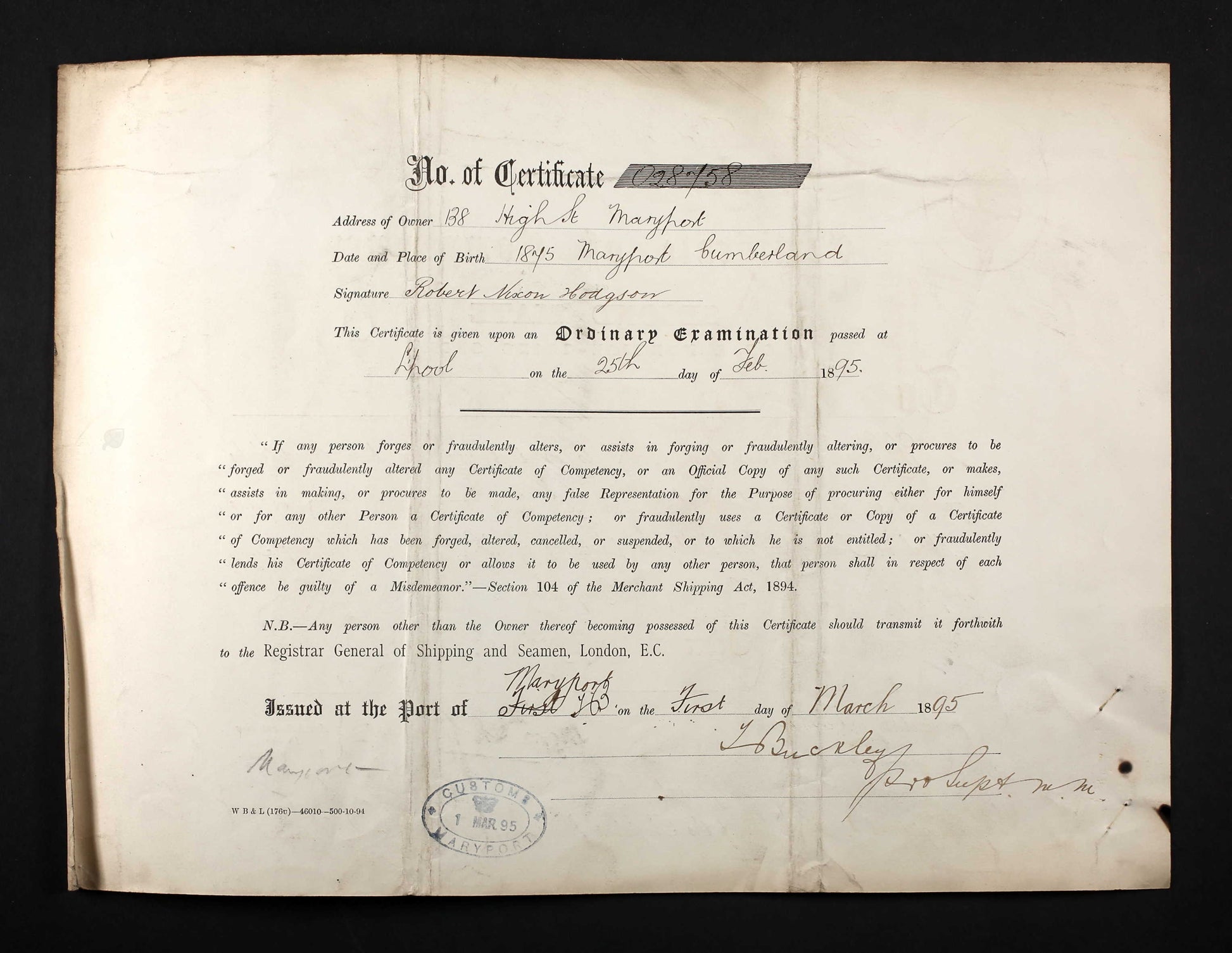 Captain Robert Nixon Hodgson, born in Maryport, Cumberland, in 1874, was a long-serving Master Mariner whose career spanned the late Victorian and First World War eras. He was the son of William Taylor Hodgson, a mariner, and first went to sea in the 1890s, gaining his Second Mate’s Certificate in 1896, First Mate’s in 1898, and Master’s Certificate (No. 028458) at Liverpool in May 1901.