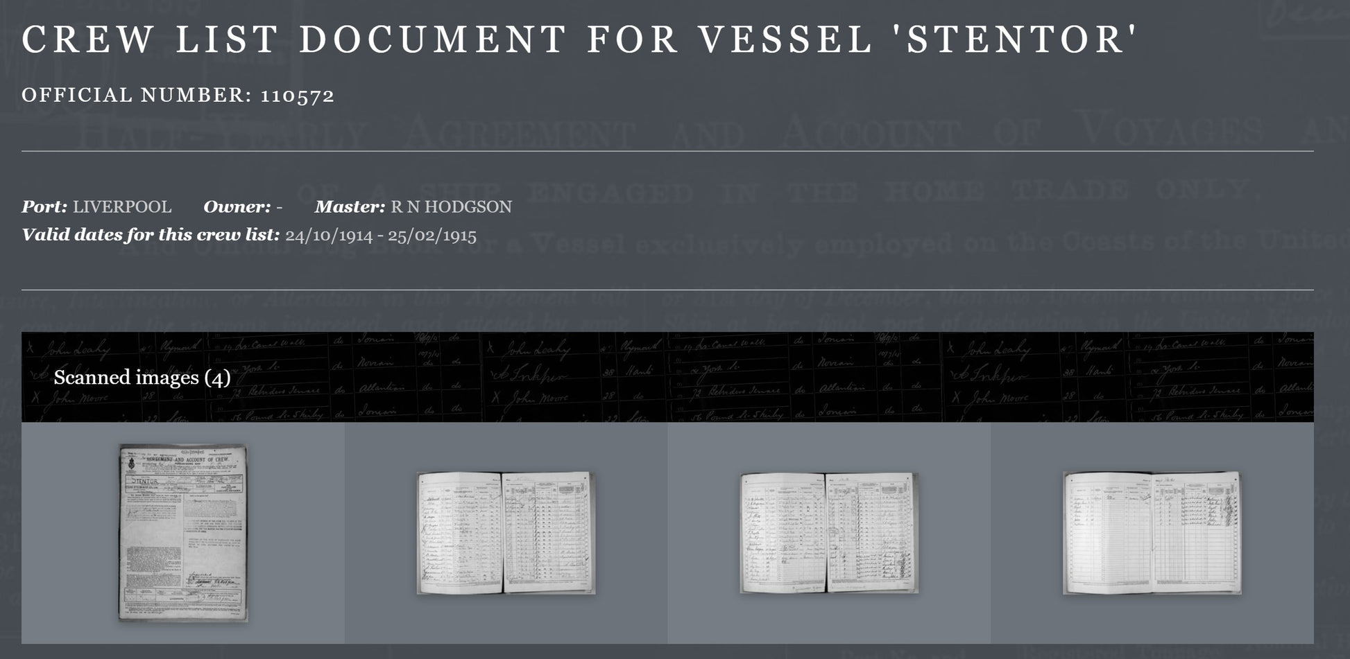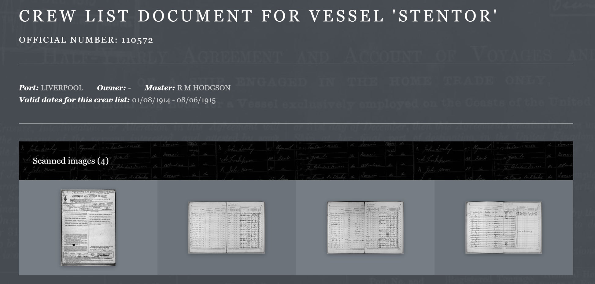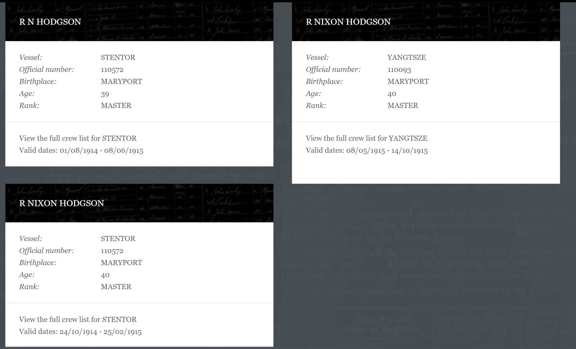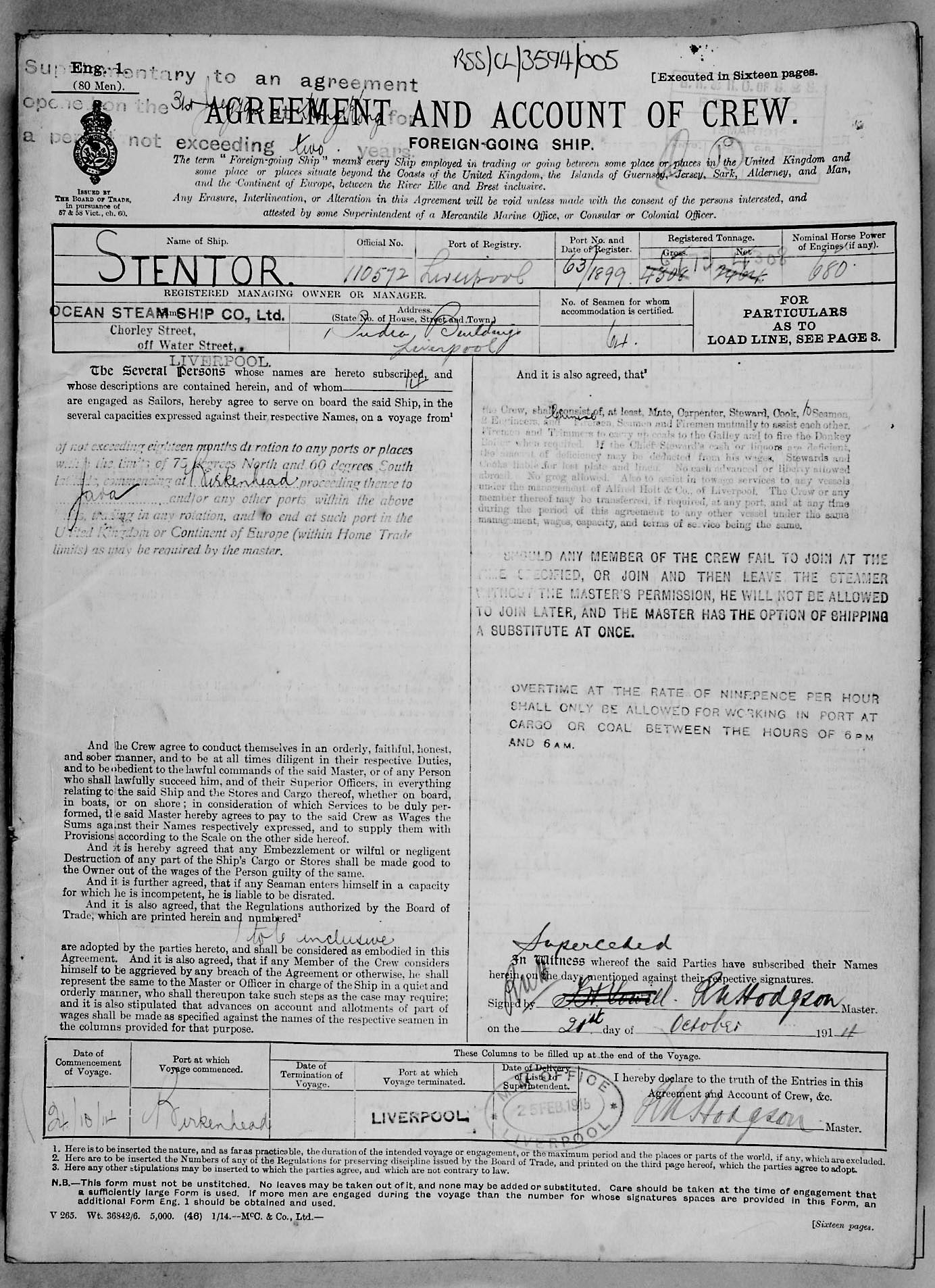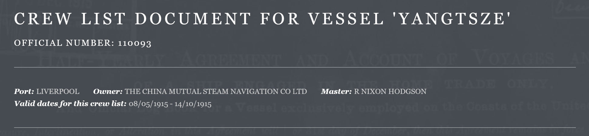 By the outbreak of the First World War, Hodgson was serving as Master in the China Mutual Steam Navigation Co. Ltd. and was in command of the SS Stentor (Official No. 110572) of Liverpool. Crew agreements and Board of Trade records confirm that he commanded Stentor through multiple voyages between August 1914 and February 1915, before taking command of the SS Yangtsze (Official No. 110093) from May to October 1915 — both vessels engaged in hazardous Far Eastern and homeward-bound trade during wartime conditions.