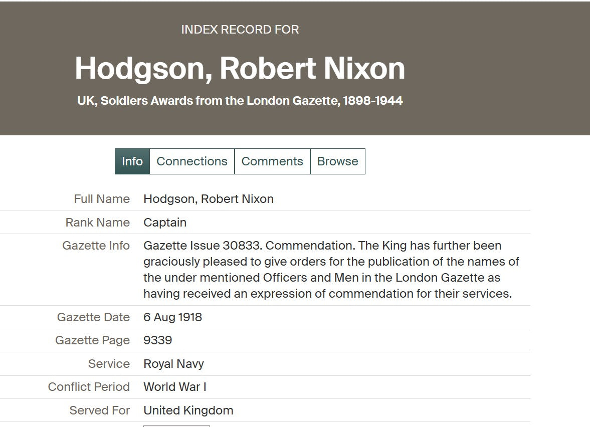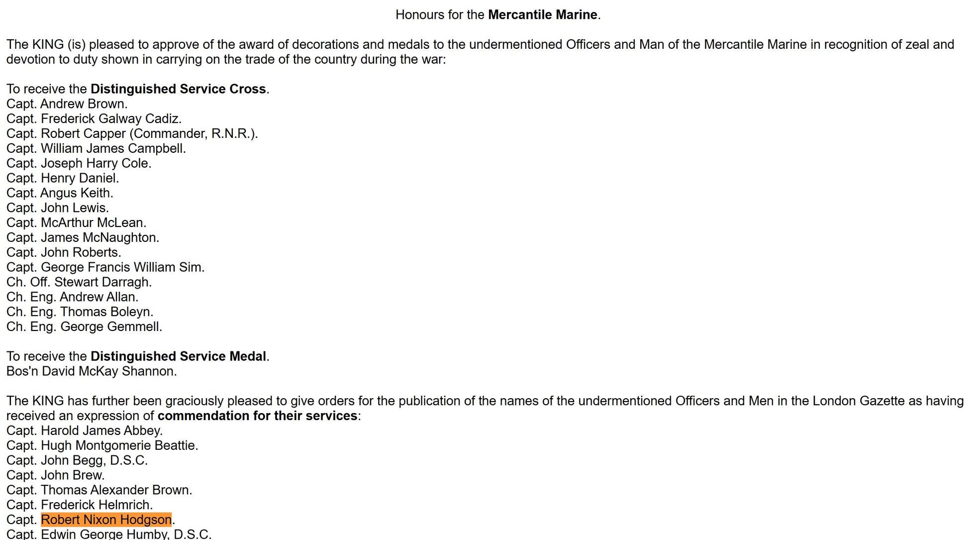 For his “zeal and devotion to duty shown in carrying on the trade of the country during the war,” Captain Hodgson was commended by the King, his name being published in the London Gazette (6 August 1918, p.9339) among a select group of Mercantile Marine officers recognised for distinguished service.