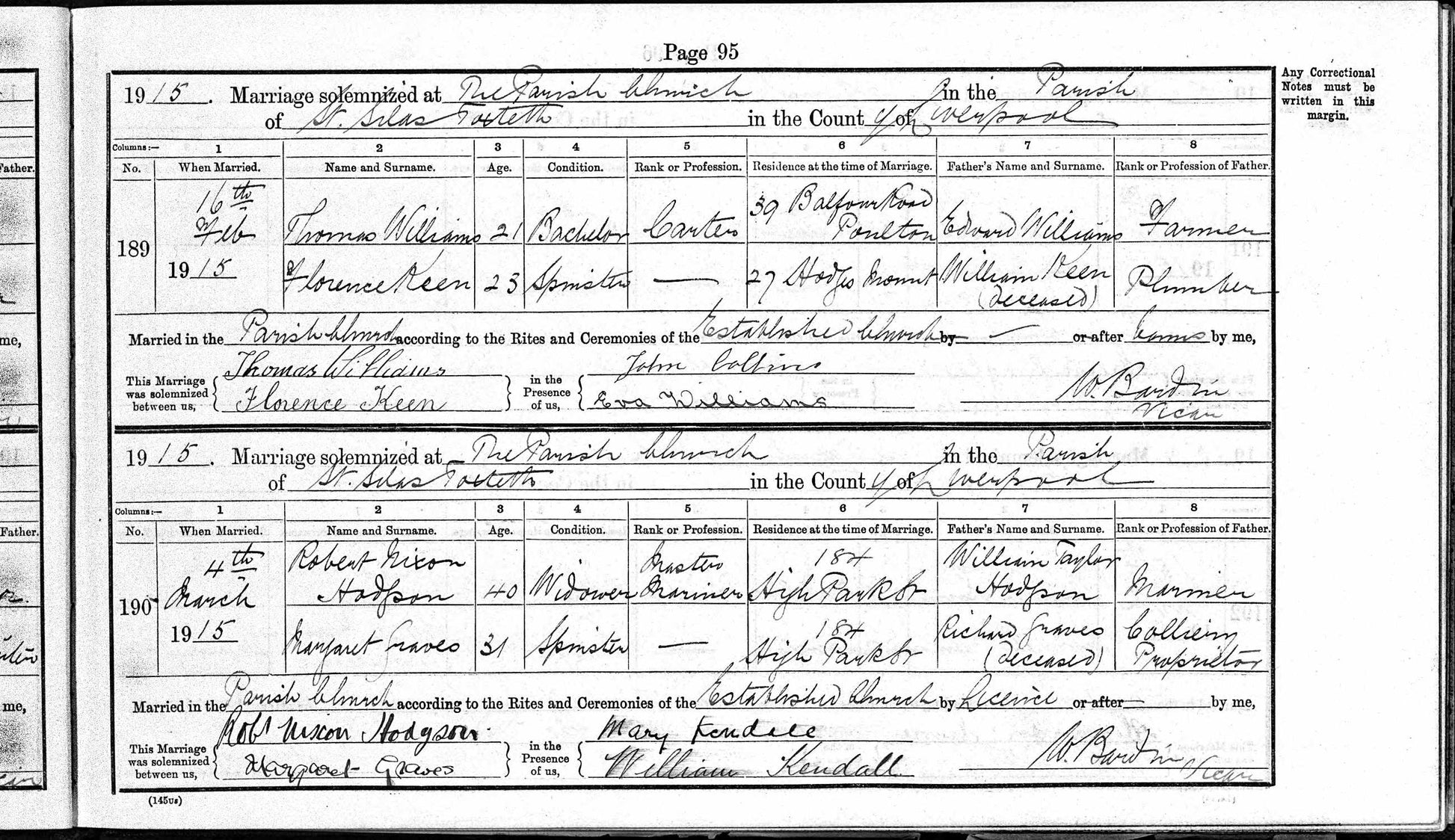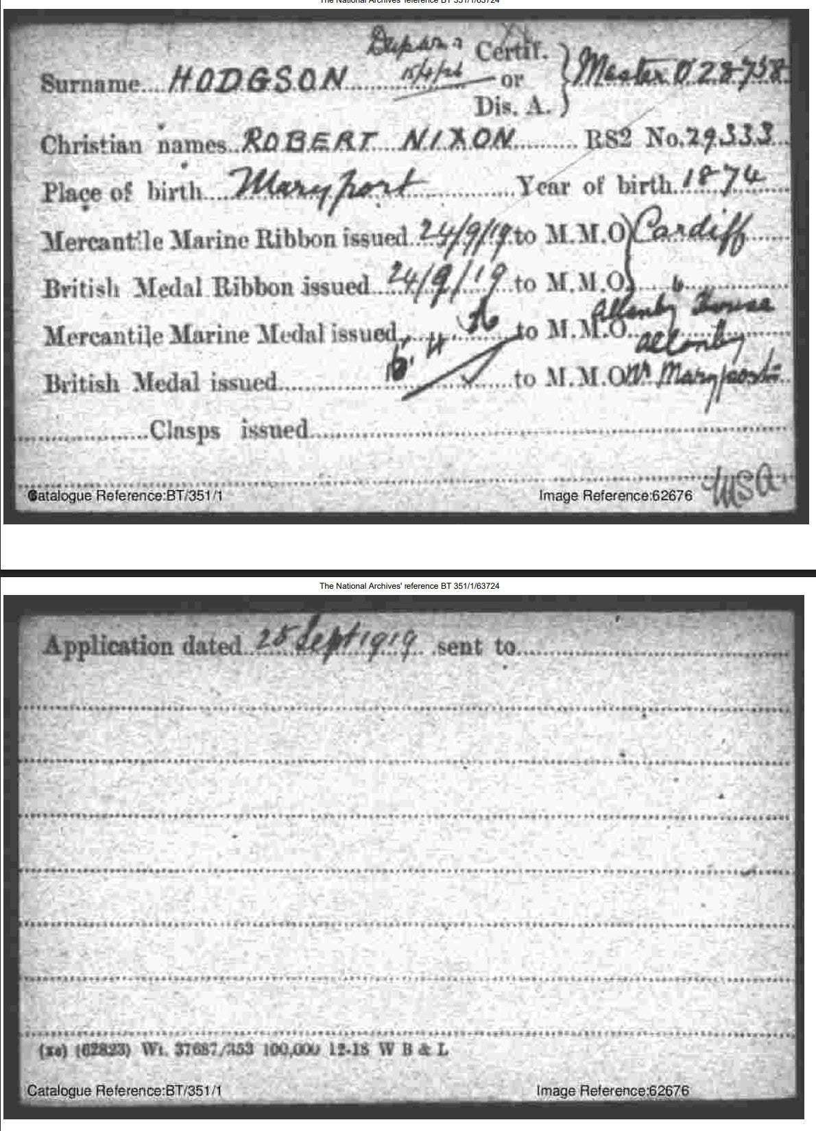Hodgson married twice — first in 1899 to Isabella Hodgson at Cross-Canonby, Cumberland, and again in 1915 to Margaret Graves at Toxteth, Liverpool — and continued to serve at sea after the war. Passenger records show him still active in 1920, sailing to New York aboard the Kroonland of the Red Star Line. His Mercantile Marine Medal and British War Medal were both issued to him via the Mercantile Marine Office, Cardiff, with his application dated 25 September 1919.