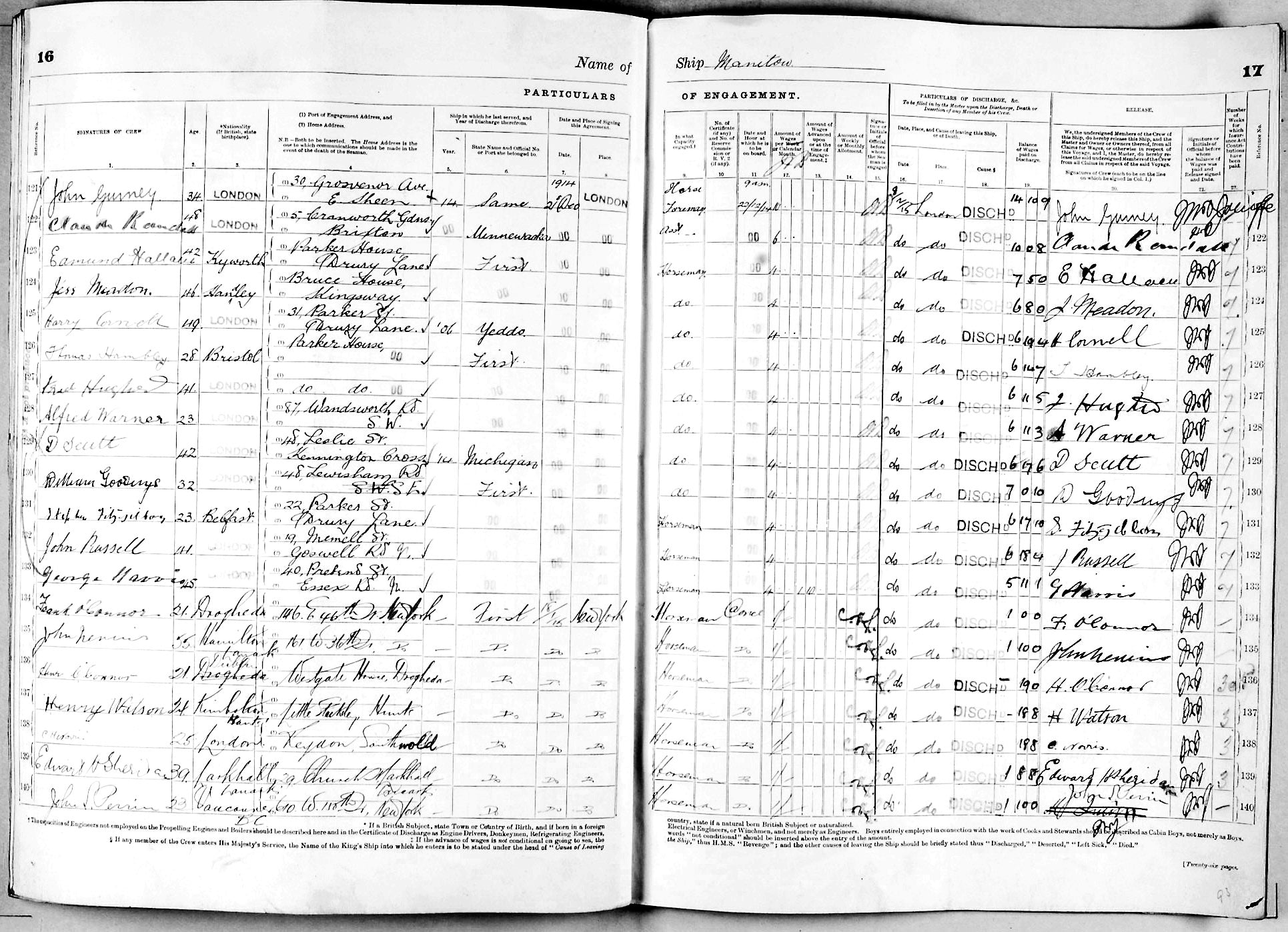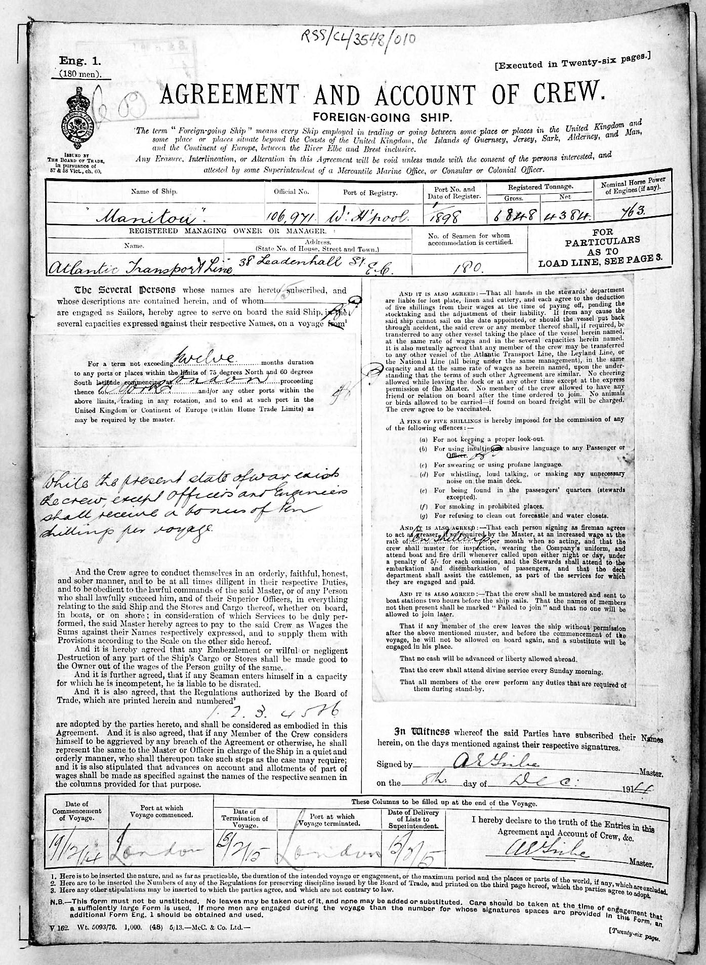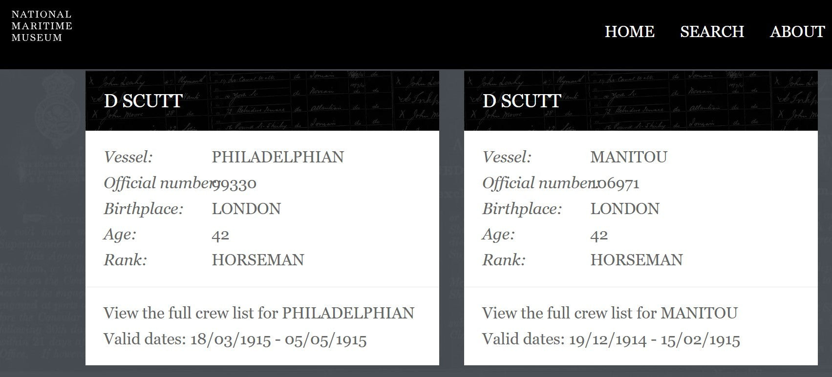 Horseman in the Mercantile Marine during World War One. In 1915 he served on the ships Manitou (19.12.14 to 15.2.15), Philadelphian (18.2.15 to 5.5.15), and then Minnehaha (11.9.15 to 13.1015 and 23.10.15 to 22.11.15 and again in Dec 1915). Sometimes as Scott or Scutt. Needs more research