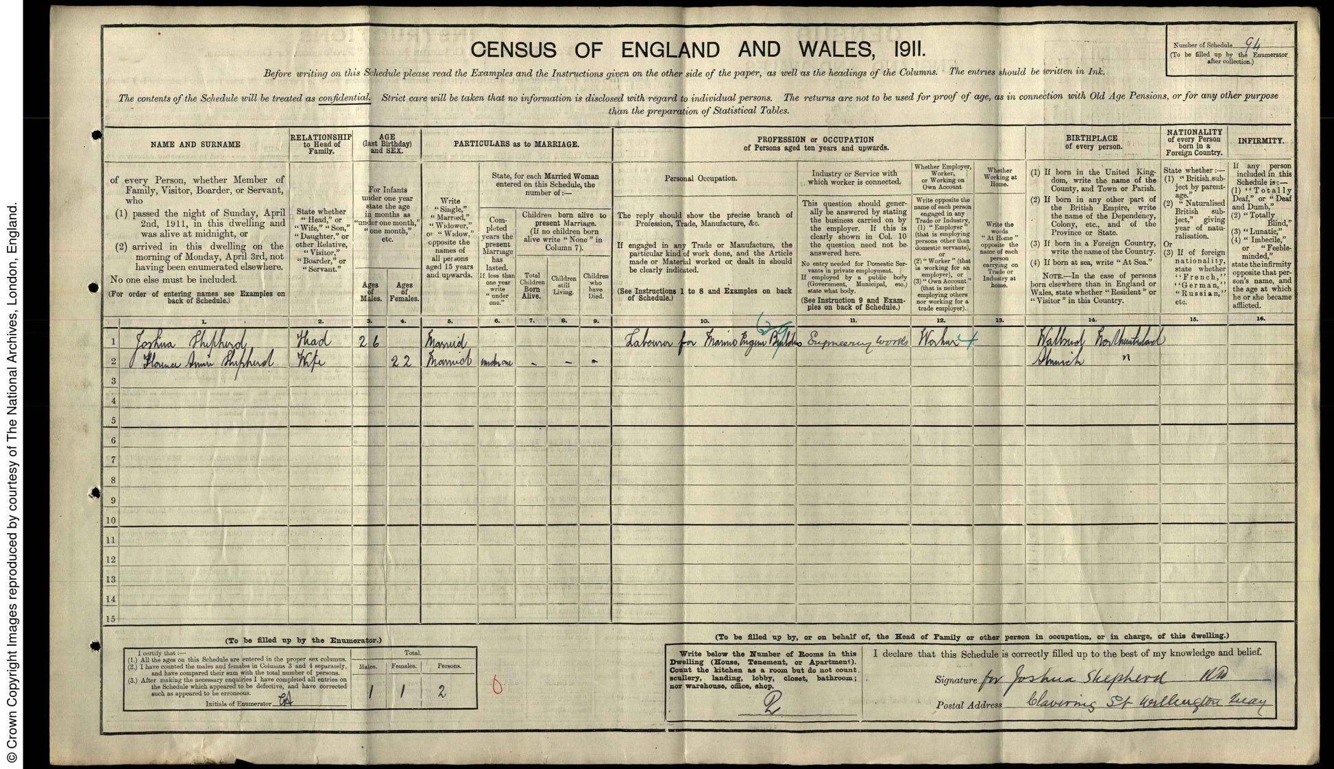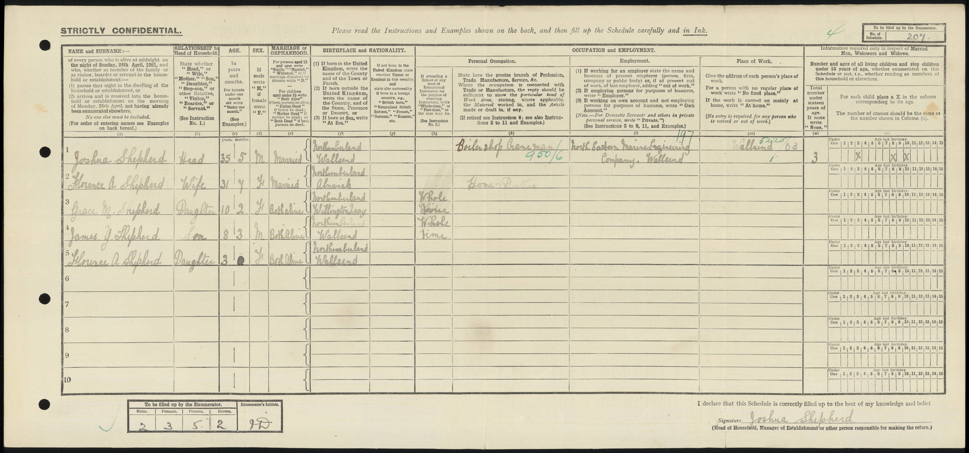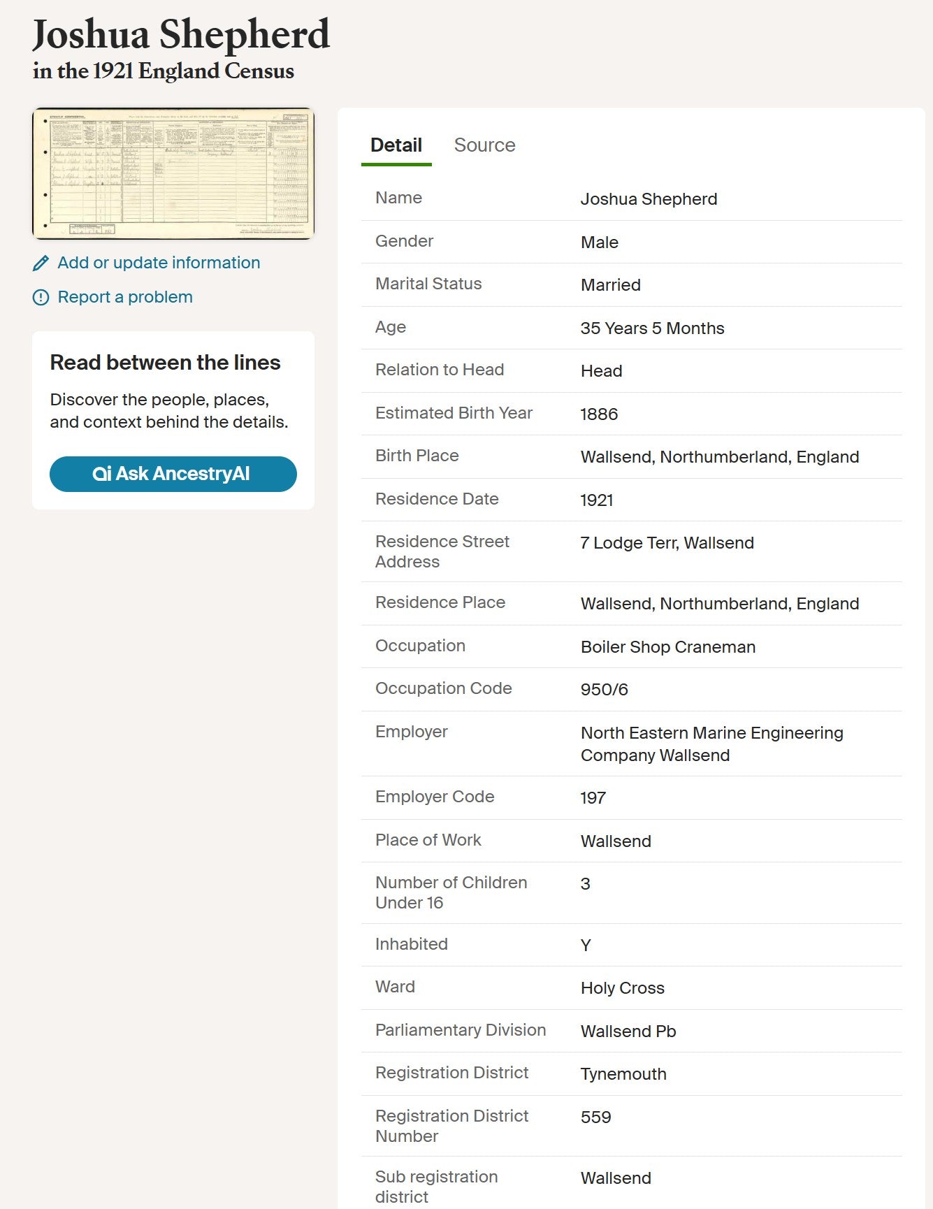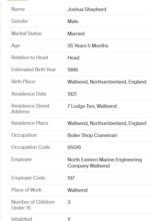 In the 1921 Census, Shepherd is recorded living at 7 Lodge Terrace, Wallsend, employed as a Boiler Shop Craneman with the North Eastern Marine Engineering Company, a major shipbuilding and marine engine firm based in Wallsend.
