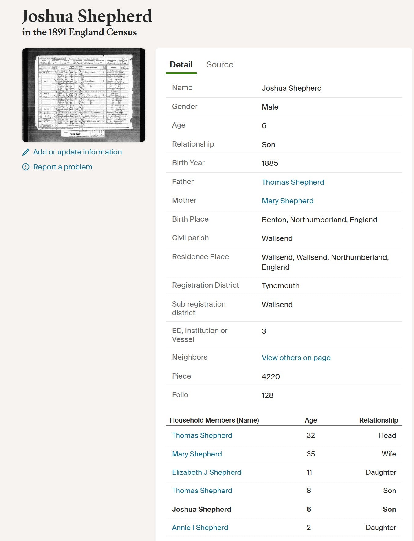 Joshua Shepherd was born on 13 January 1885 at Wallsend, Northumberland, the son of Thomas and Mary Shepherd. The 1891 Census records him living with his family in Wallsend, where his father worked locally.