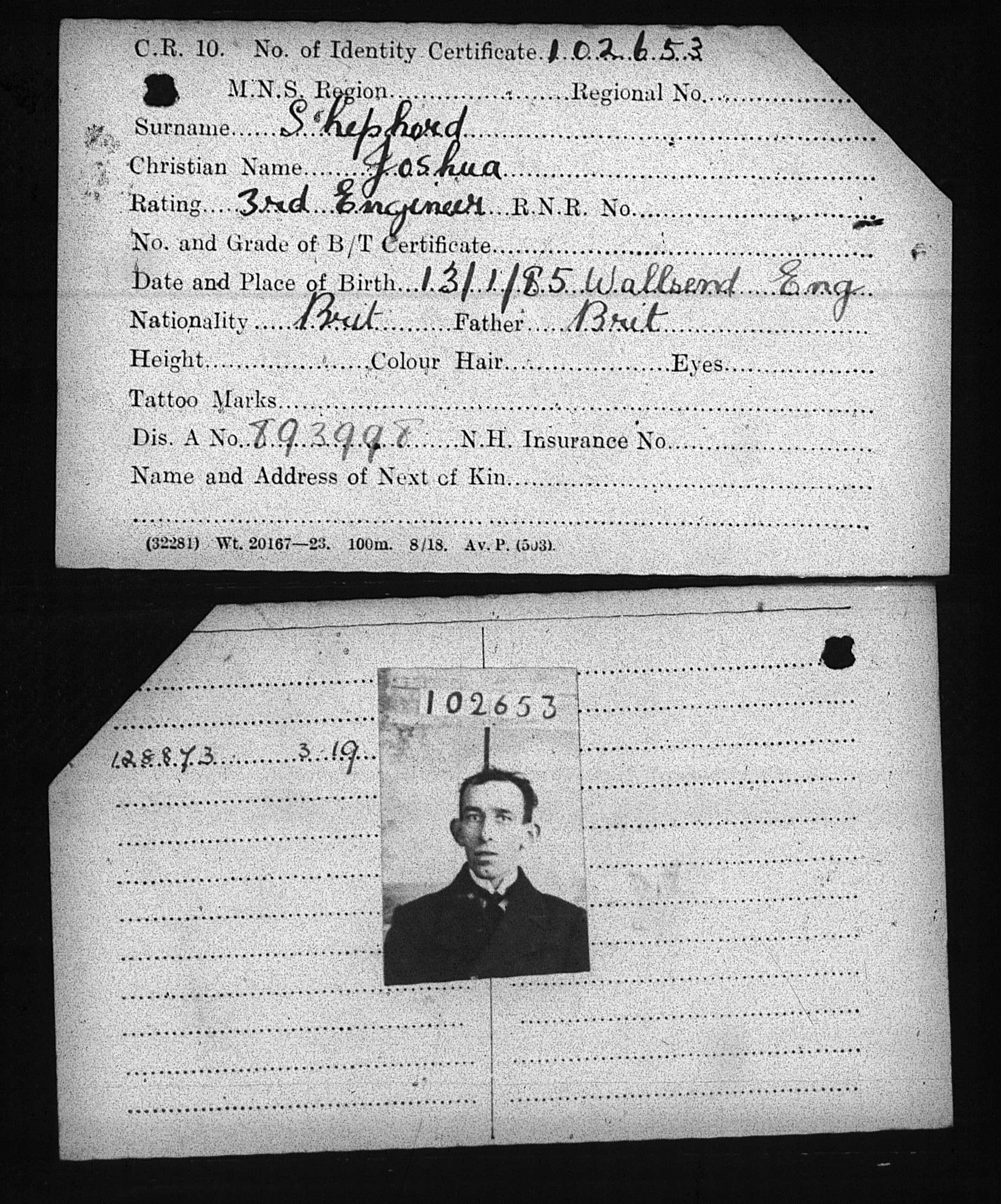By 1911, Shepherd was married to Florence Ann Shepherd and residing at Clarence Street, Wellington Quay, Wallsend, working as a labourer for a marine engine fitter. His professional career progressed, and by the time of the First World War, he was serving as a 3rd Engineer in the Mercantile Marine, as confirmed by his CR10 identity card (No. 102653), which includes a photograph of him.