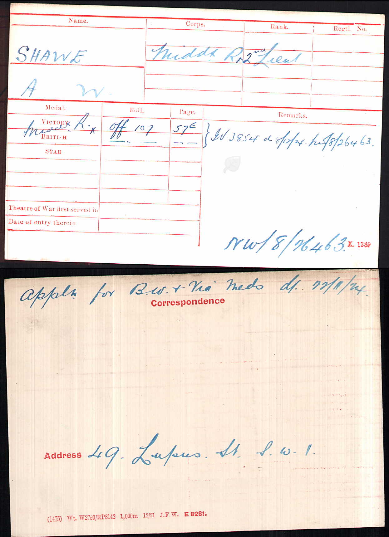 British War Medal – 2. LIEUT. A. W. SHAWE.