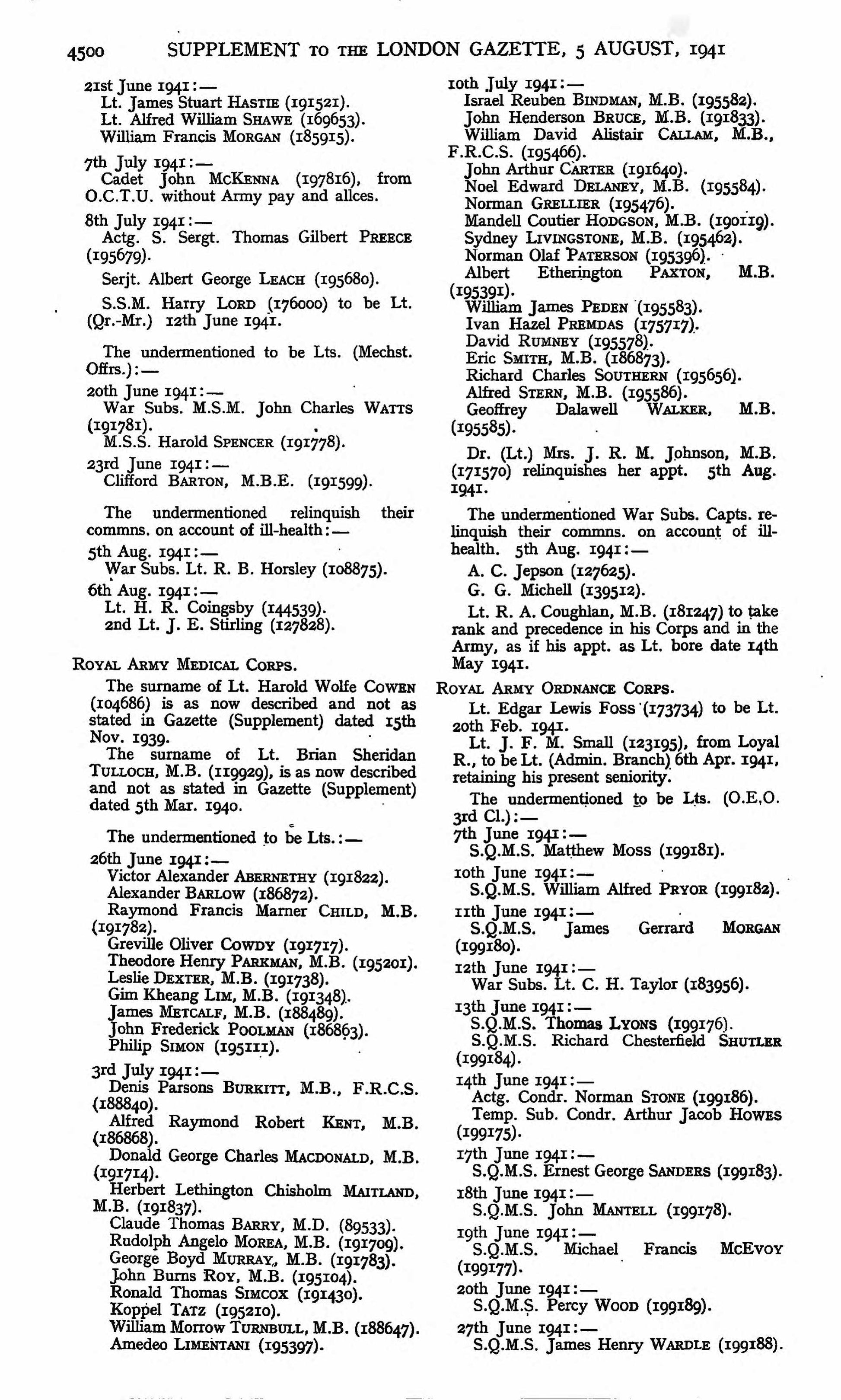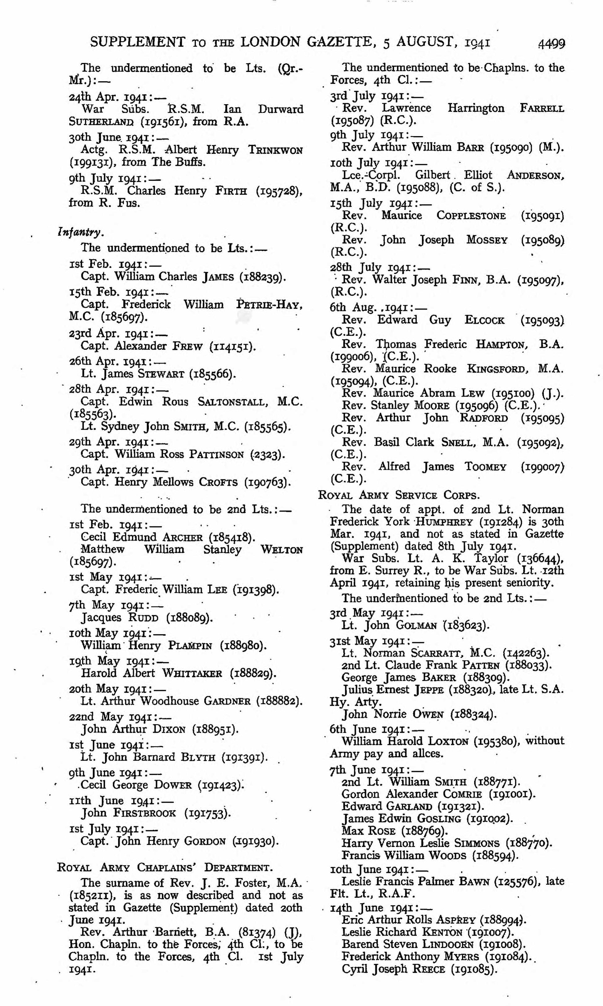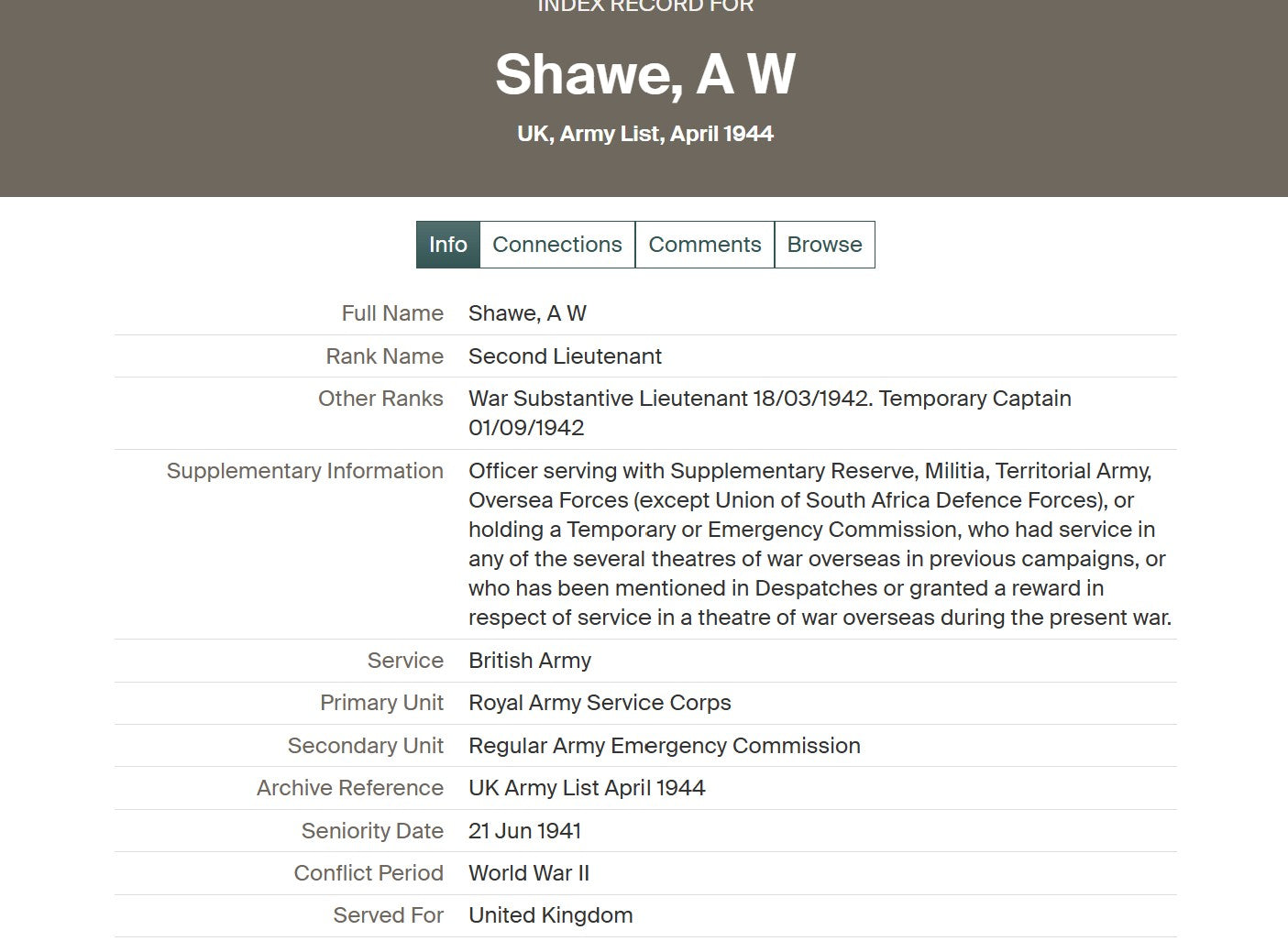 In the inter-war period he remained associated with London and later Surrey. Following the outbreak of the Second World War he again served, this time with the Royal Army Service Corps (RASC). Army List entries show him holding a commission with seniority from 21 June 1941, and by 18 March 1942 he was a War Substantive Lieutenant, later serving as a Temporary Captain (1 September 1942).