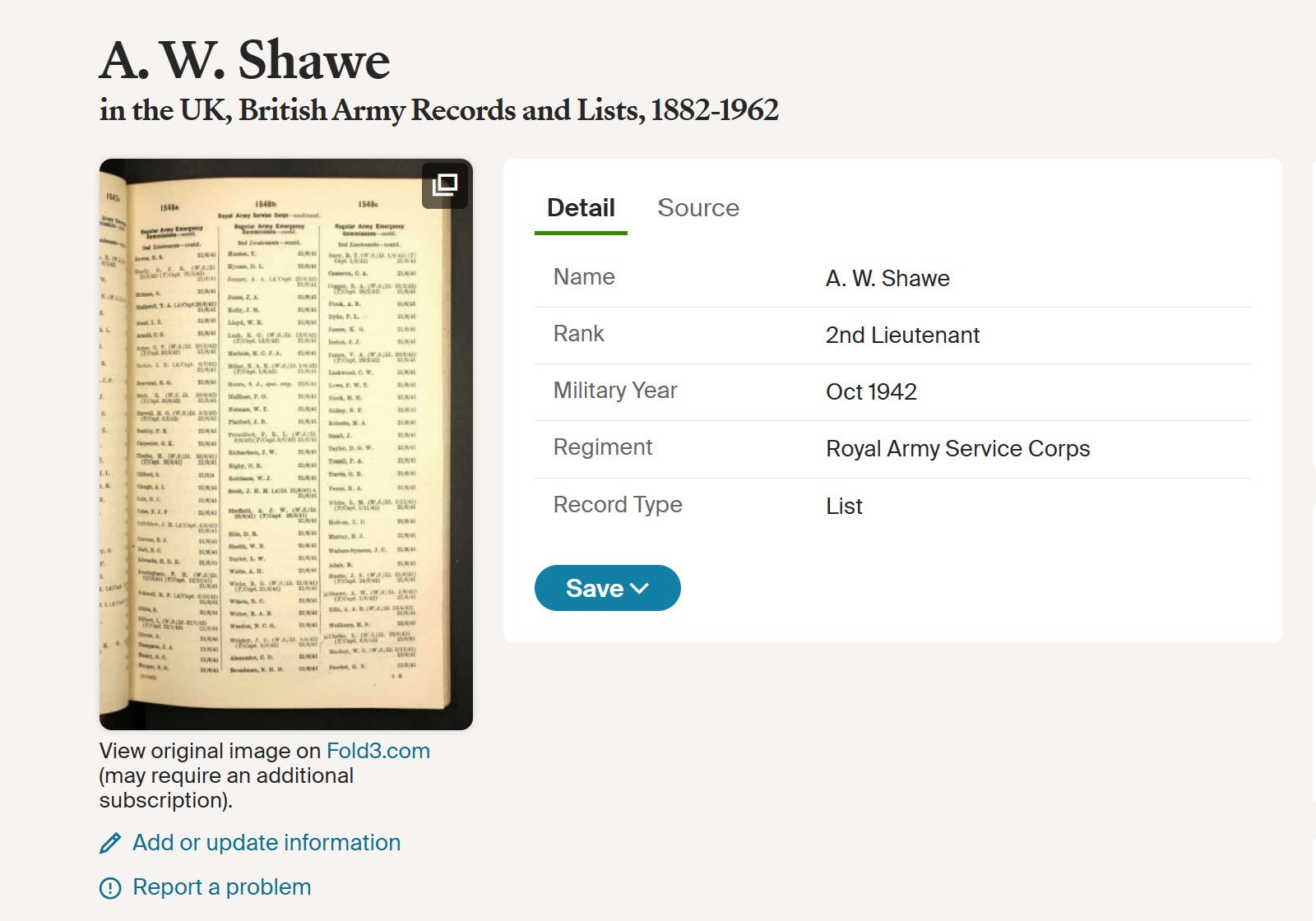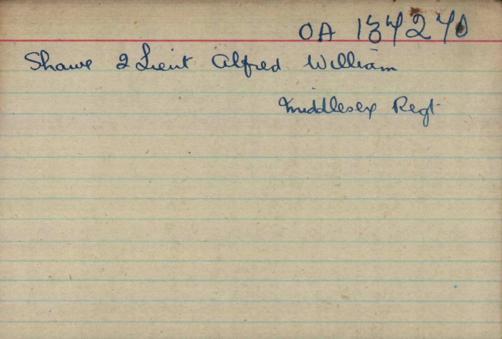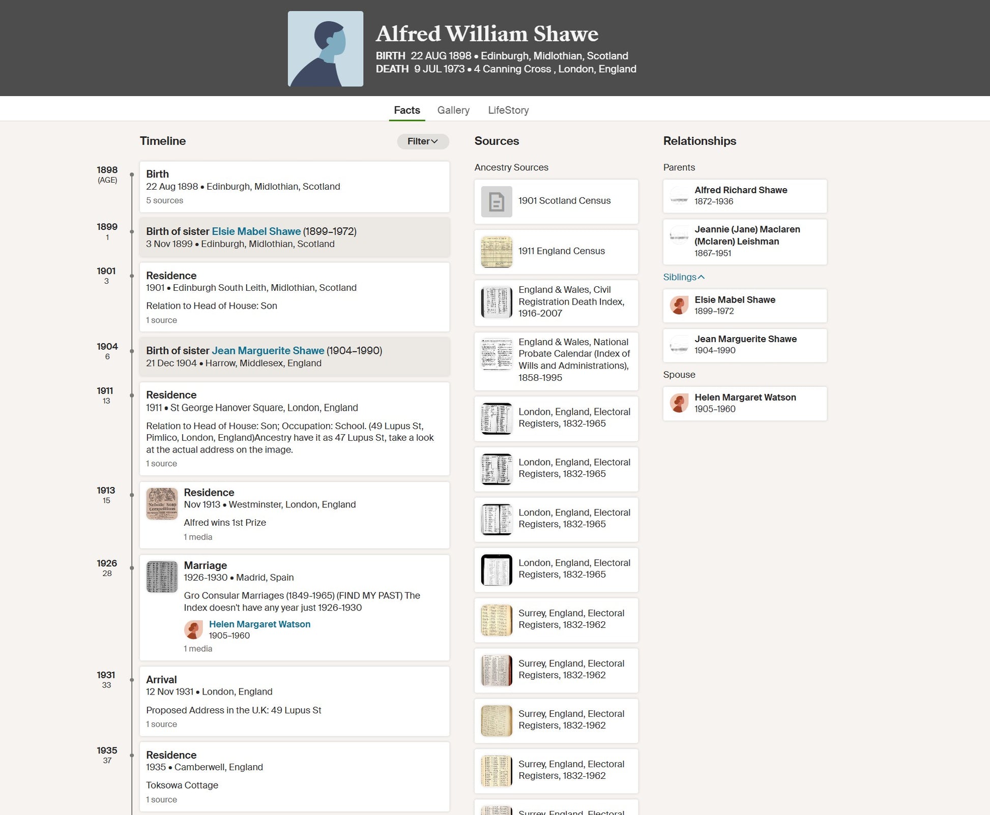 Alfred William Shawe was born on 22 August 1898 at Edinburgh, Midlothian, the son of Alfred Richard Shawe and Jeannie (Jane) Maclaren (MacLaren) Leishman. By 1911 the family were residing in London, and the address later closely associated with him was 49 Lupus Street, Westminster, which would remain the family home for many years and to which his First World War medals were sent.