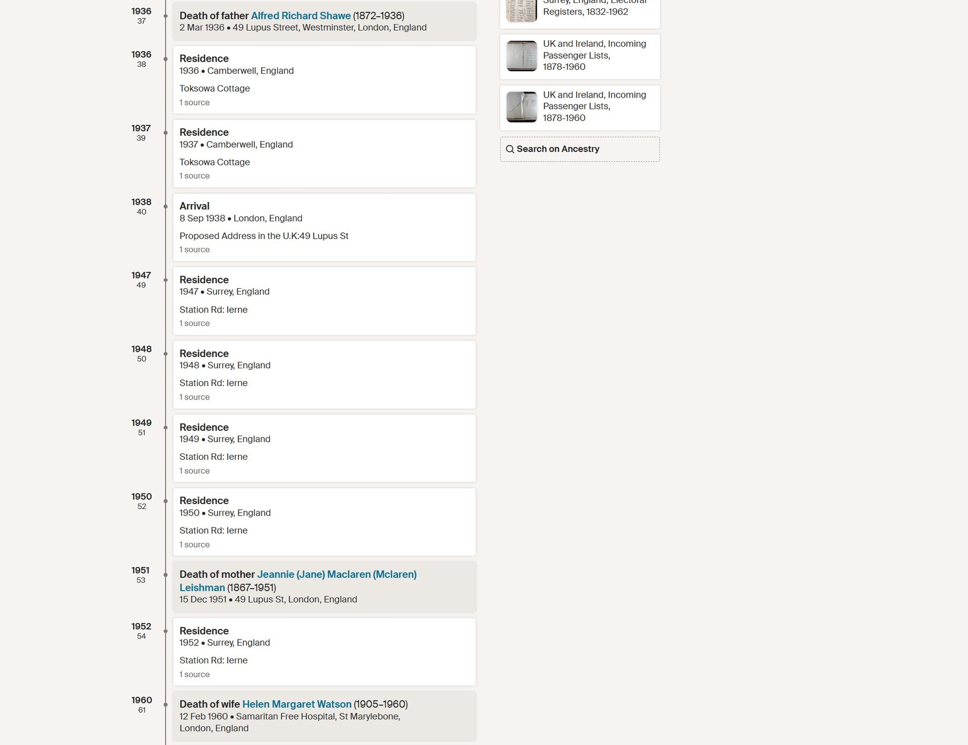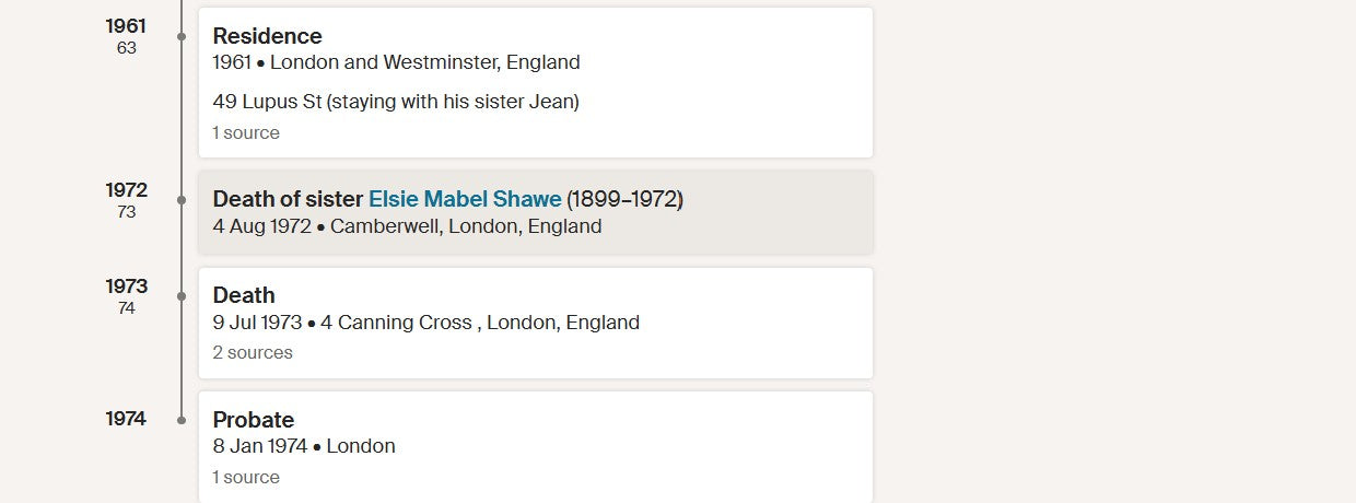 Alfred William Shawe died on 9 July 1973 at 4 Canning Cross, London, aged seventy-four. Probate was granted in London in January 1974.