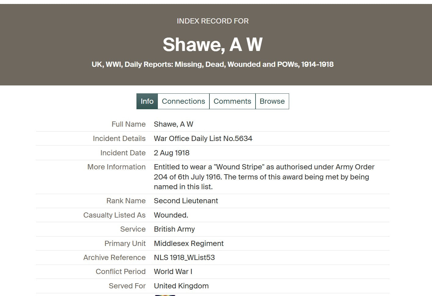 He first appeared in the War Office Daily List No. 5634 (2 August 1918) as wounded, qualifying him for the authorised Wound Stripe under Army Order 204 of 6 July 1916. He was again listed as wounded in War Office Daily List No. 5694 (12 October 1918), confirming a second occasion of injury before the Armistice.
