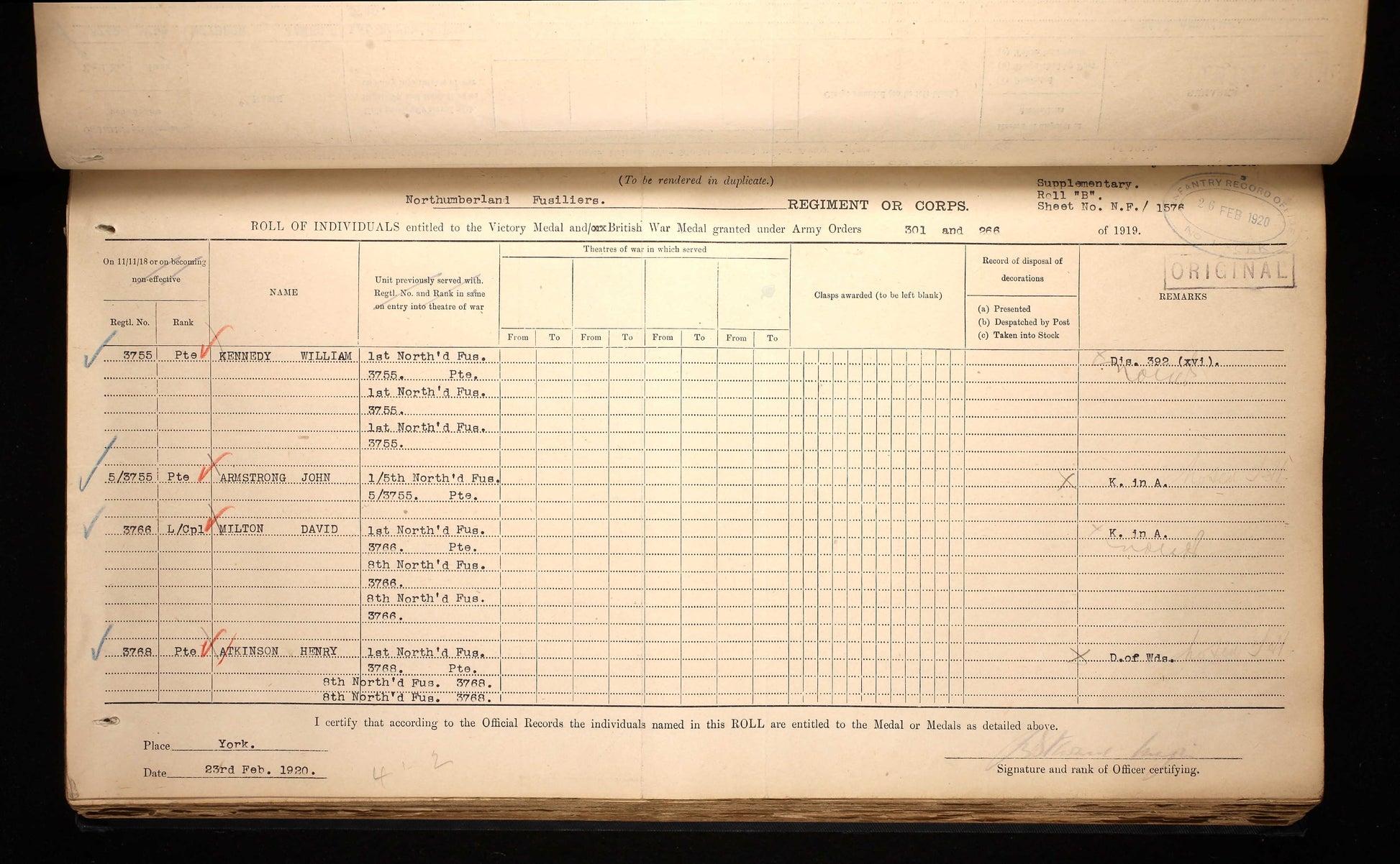 First World War Medals – Private Henry Atkinson, 8th Northumberland Fusiliers – Died of Wounds Somme 1916