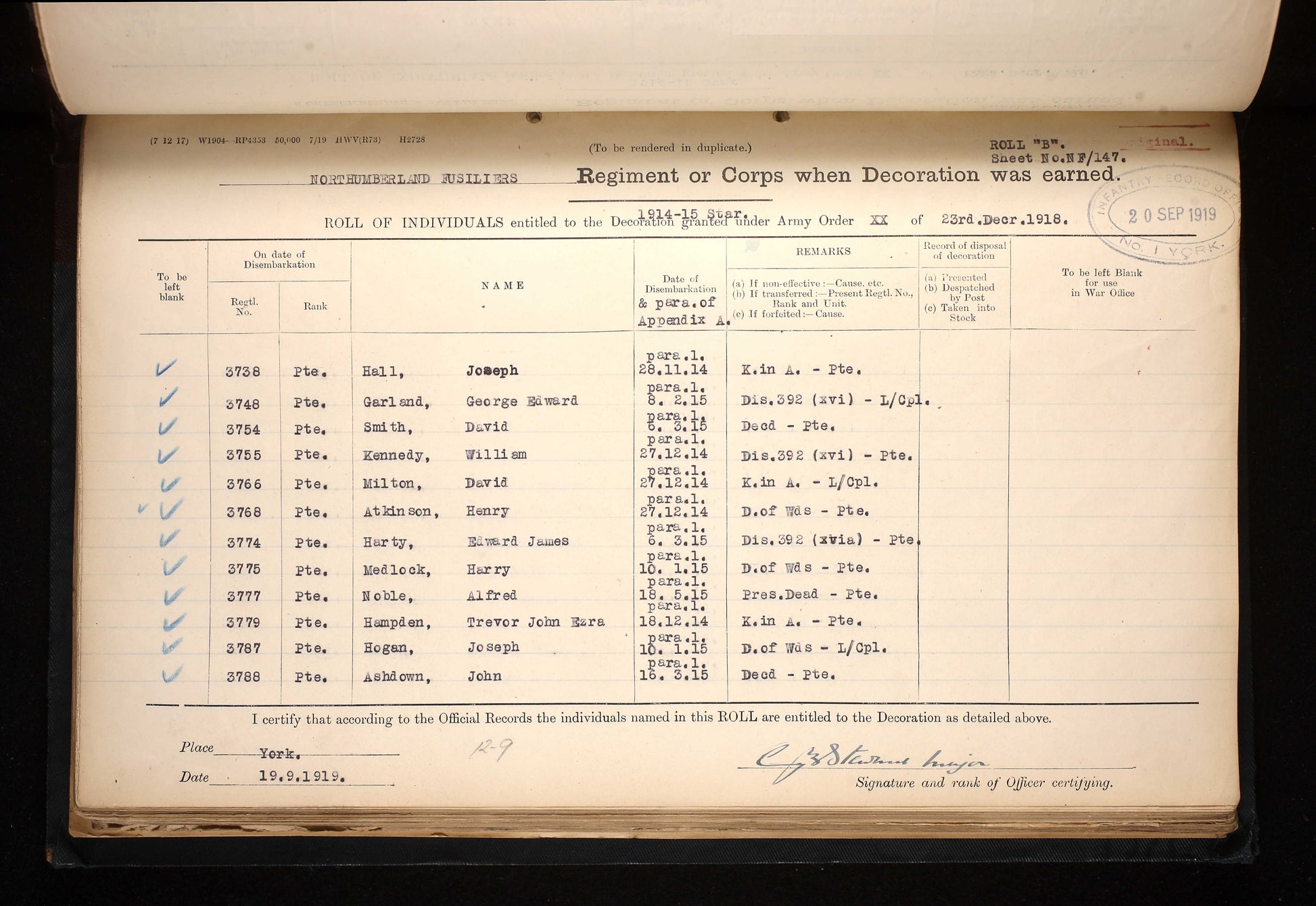 1914-15 Star – 3768 PTE H. ATKINSON. NORTH'D FUS: