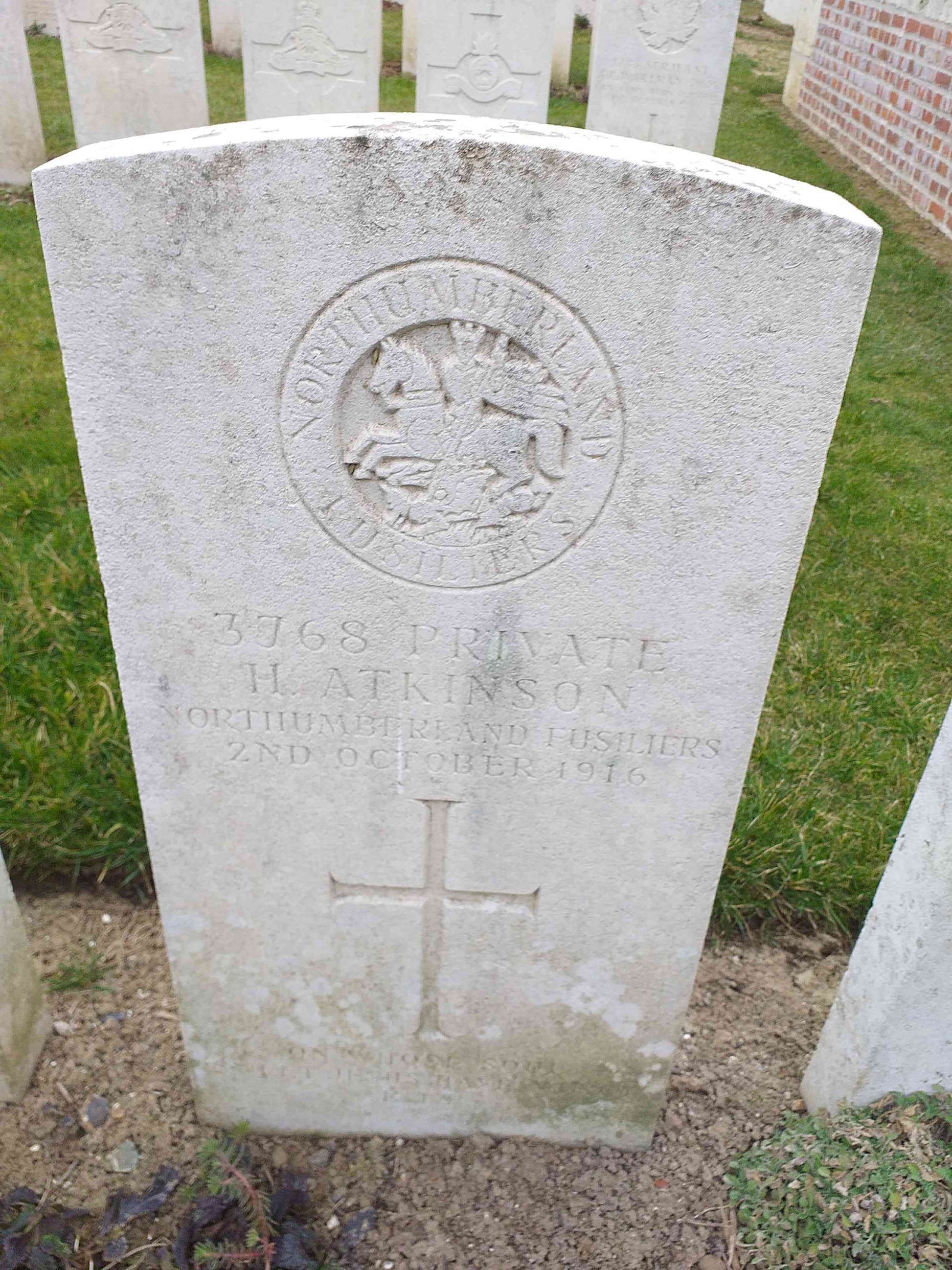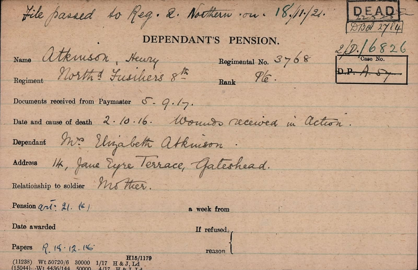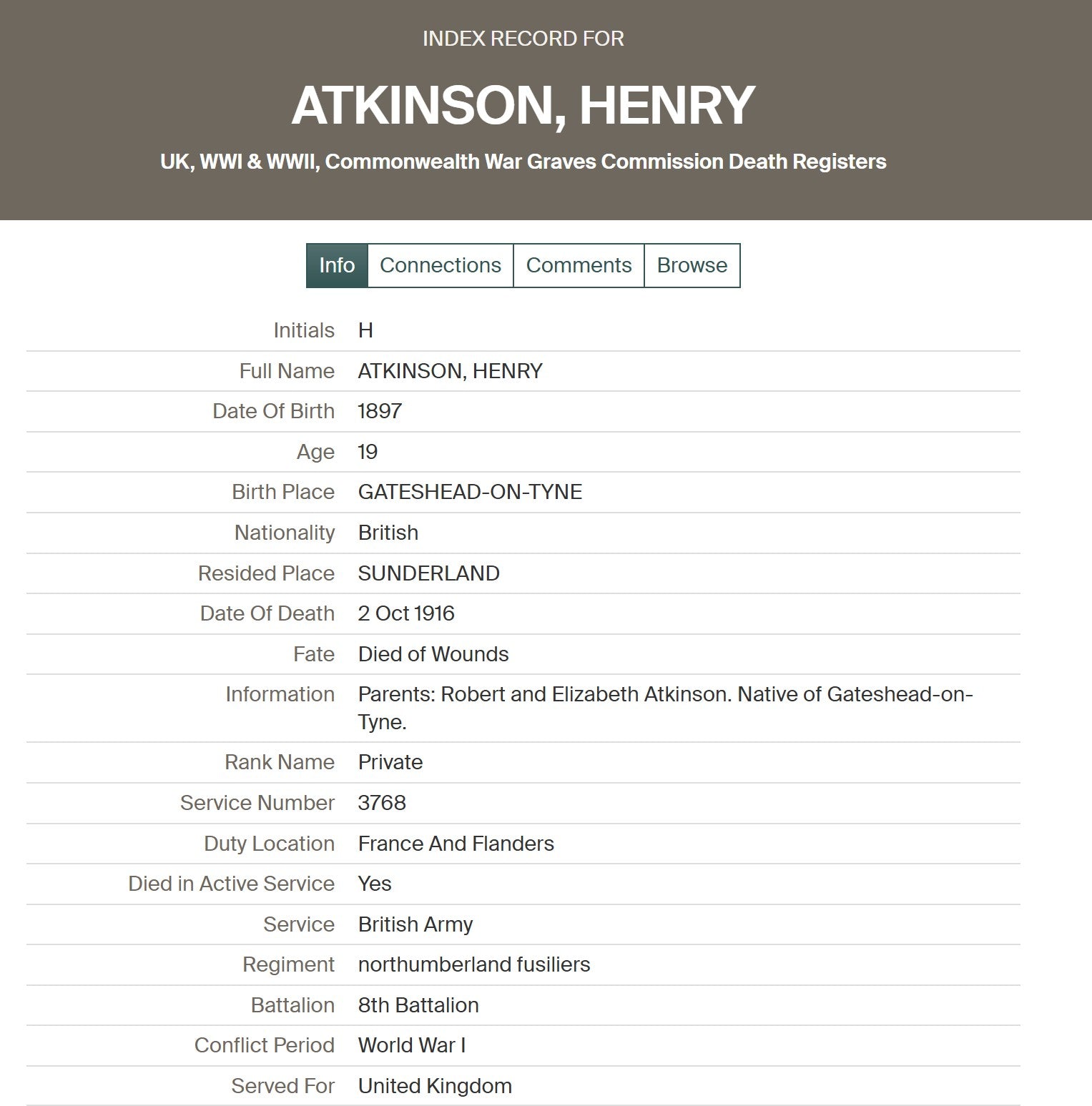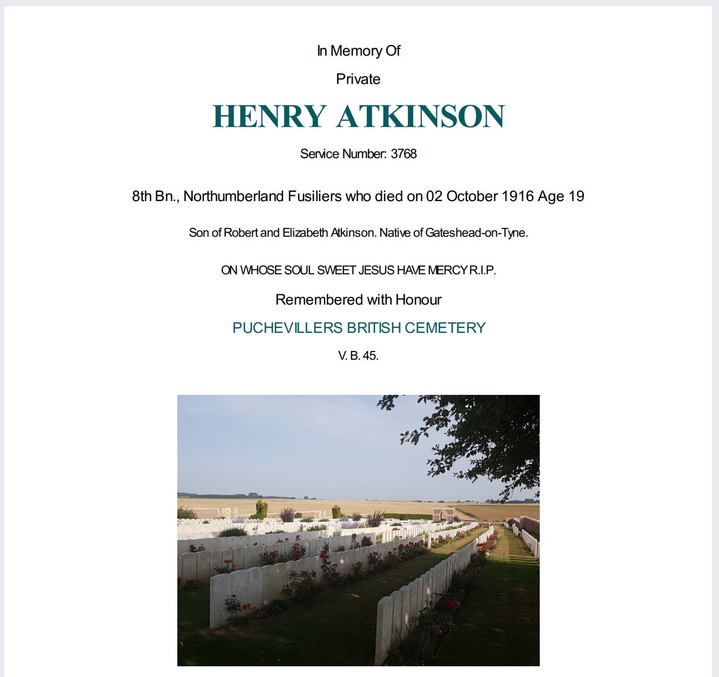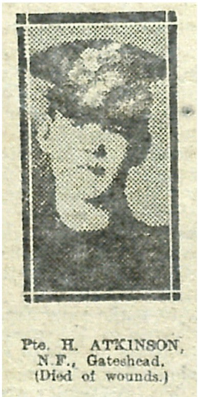 Henry Atkinson was born in 1897 at Gateshead-on-Tyne, the son of Robert and Elizabeth Atkinson, and later resided in Sunderland. In 1911 he was living at 14 Jane Eyre Terrace, Sunderland Road, Gateshead, working as a coal miner driver underground, one of a large Tyneside family.