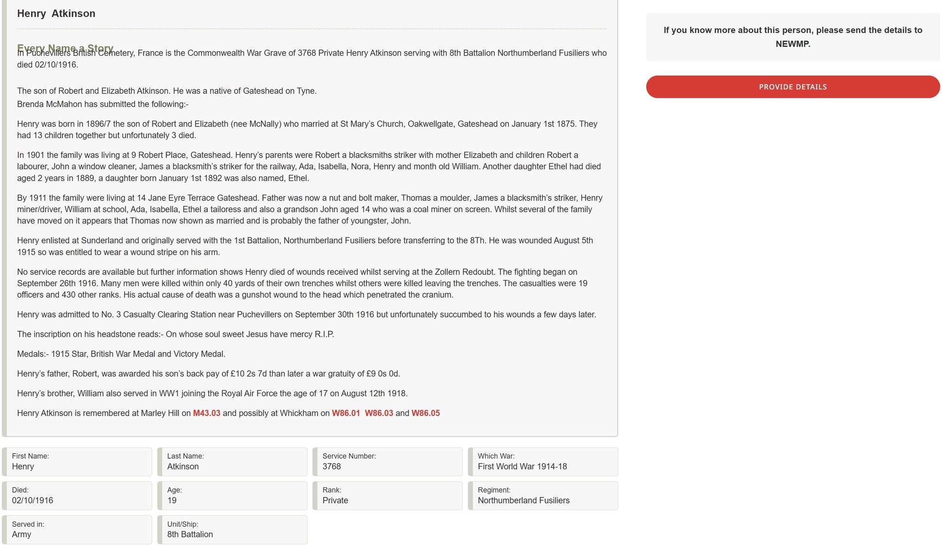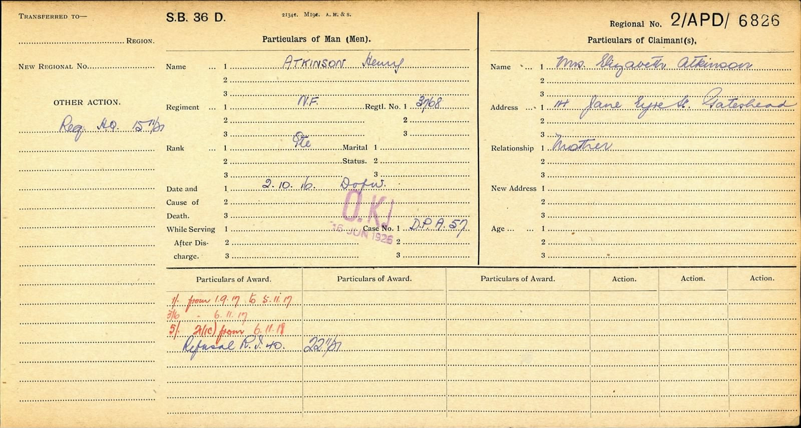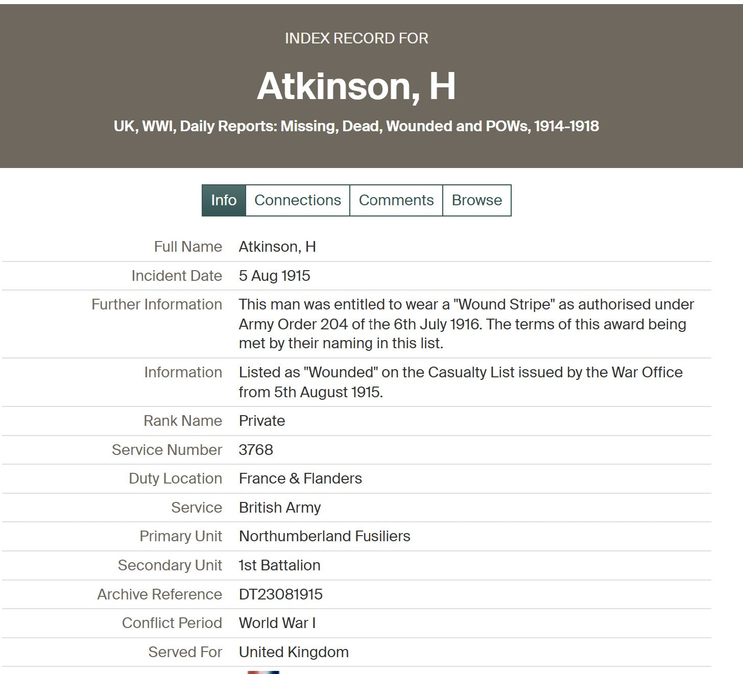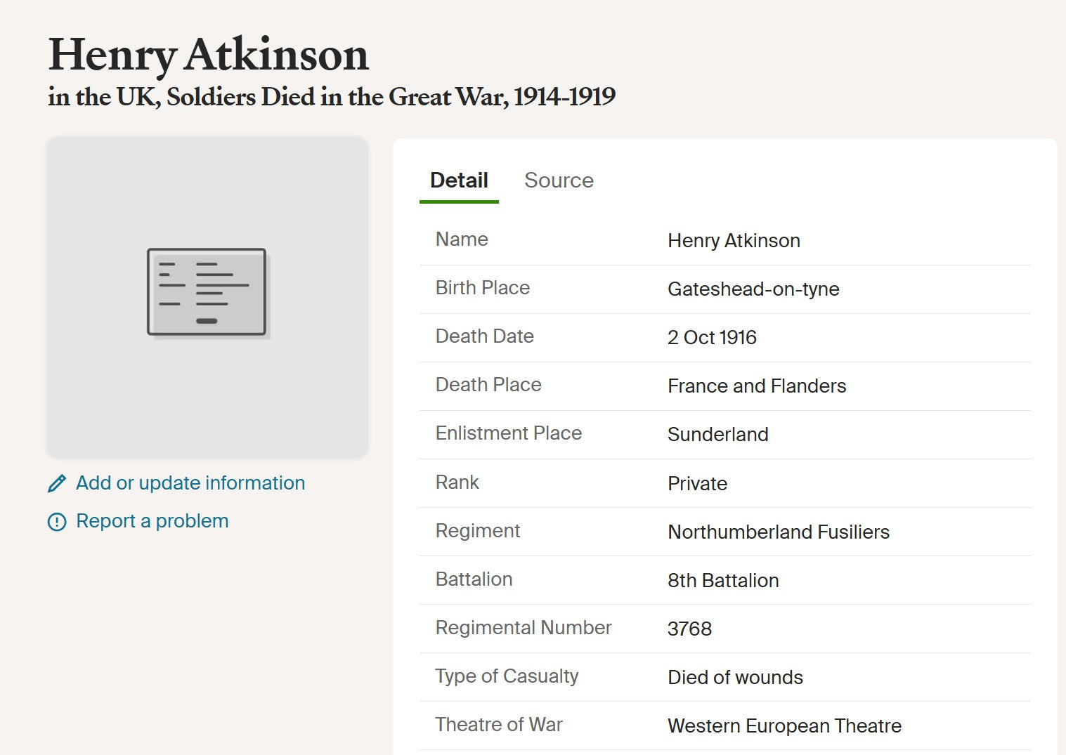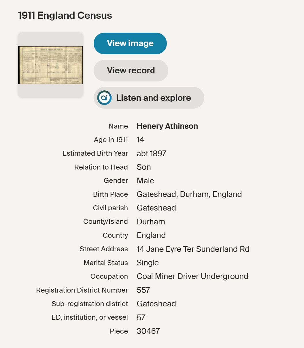 Henry Atkinson was born in 1897 at Gateshead-on-Tyne, the son of Robert and Elizabeth Atkinson, and later resided in Sunderland. In 1911 he was living at 14 Jane Eyre Terrace, Sunderland Road, Gateshead, working as a coal miner driver underground, one of a large Tyneside family.