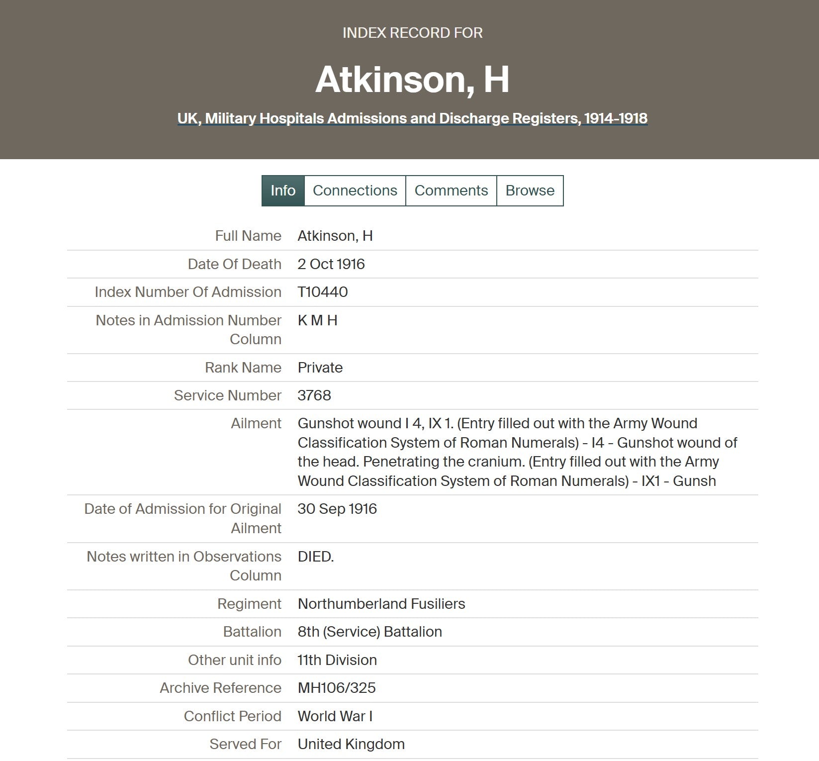 During the Battle of the Somme, the 8th Battalion was heavily engaged in late September 1916, including the fighting around Zollern Redoubt and the Ovillers sector. Henry was severely wounded during this period, suffering a gunshot wound to the head penetrating the cranium. He was admitted to a Casualty Clearing Station near Puchevillers on 30 September 1916, but died of his wounds on 2 October 1916, aged just 19.