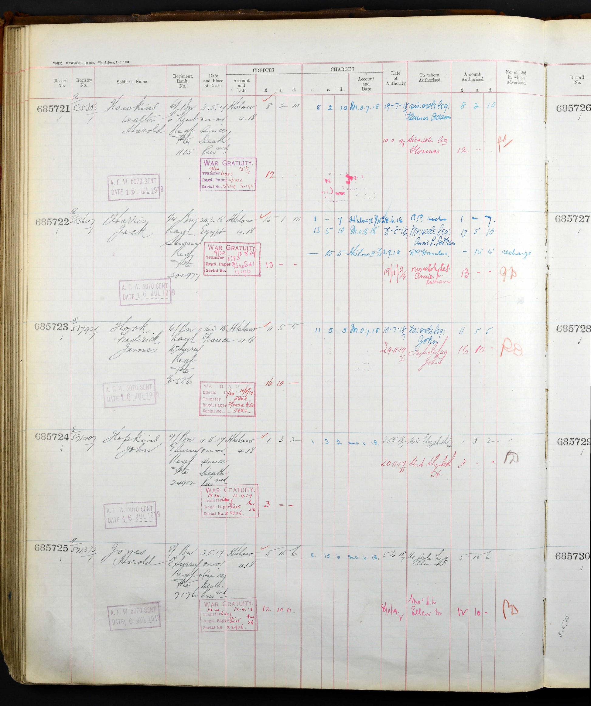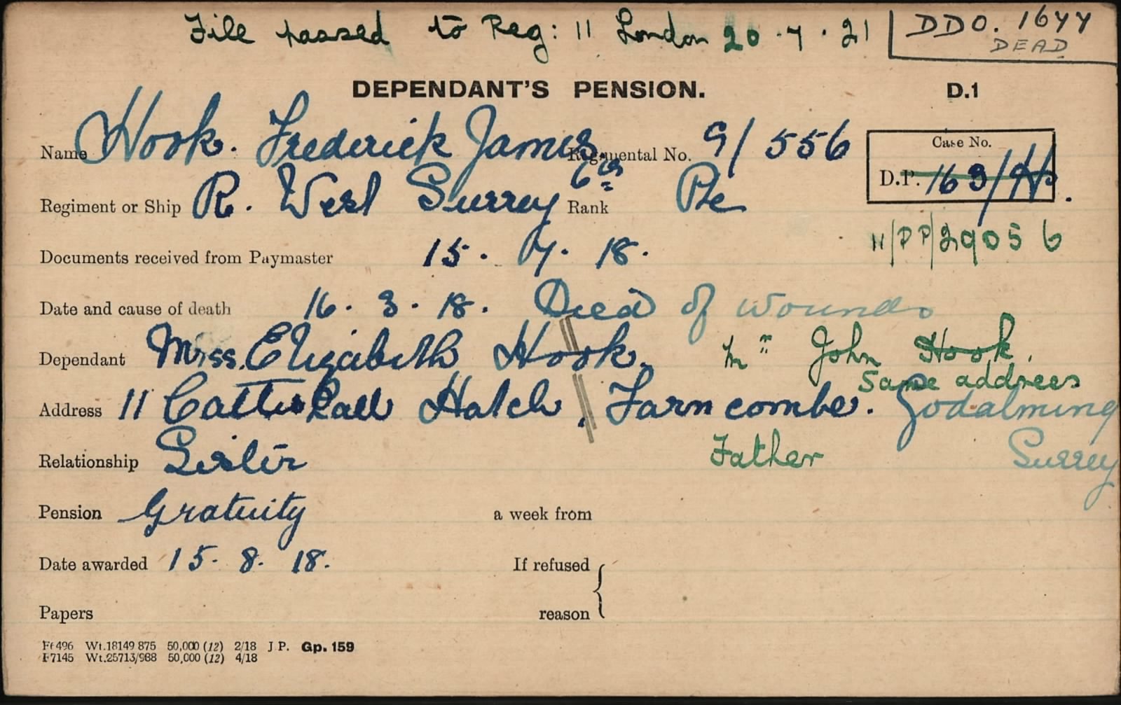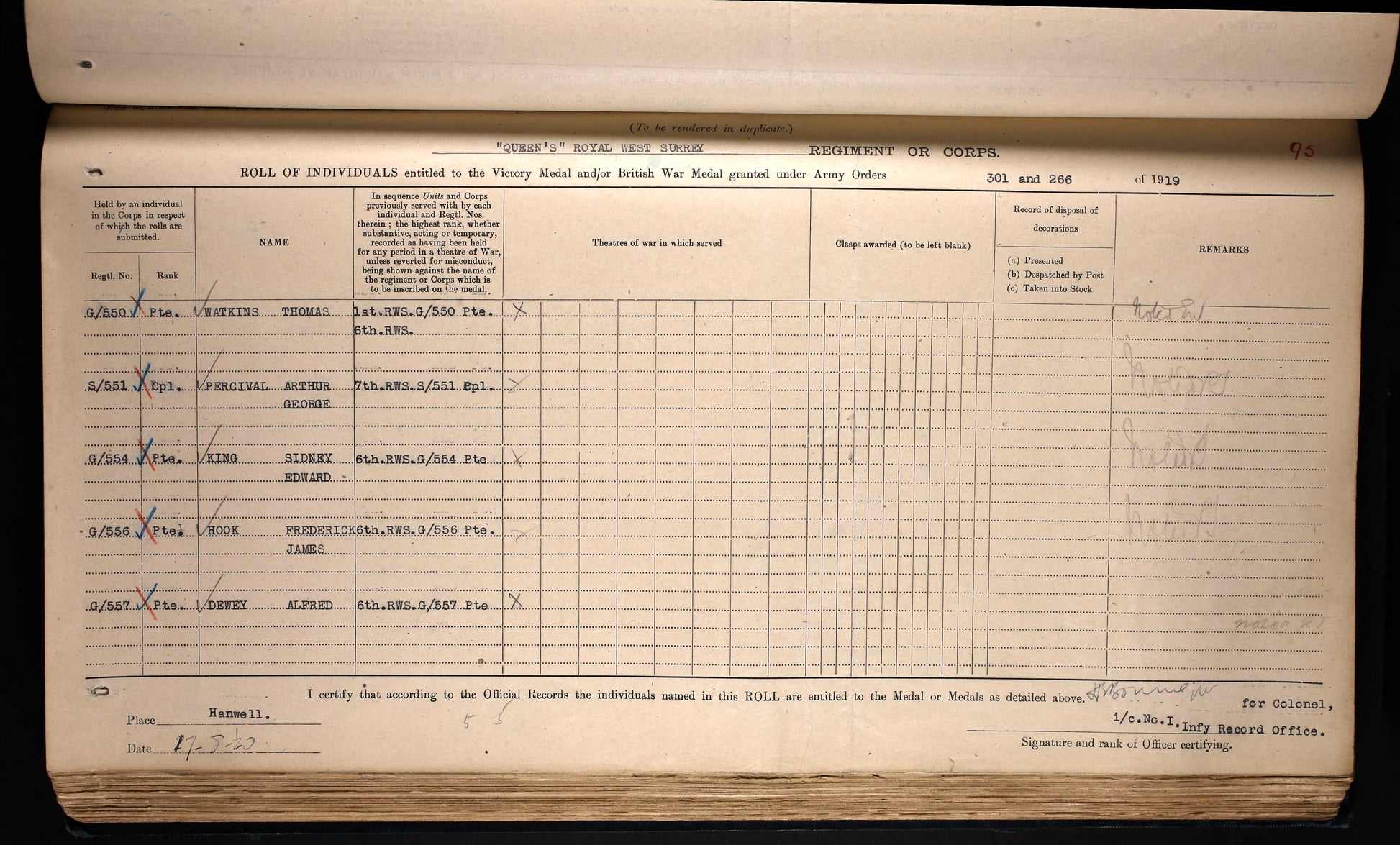 British War Medal - G-556 PTE. F. J. HOOK. THE QUEEN'S R.