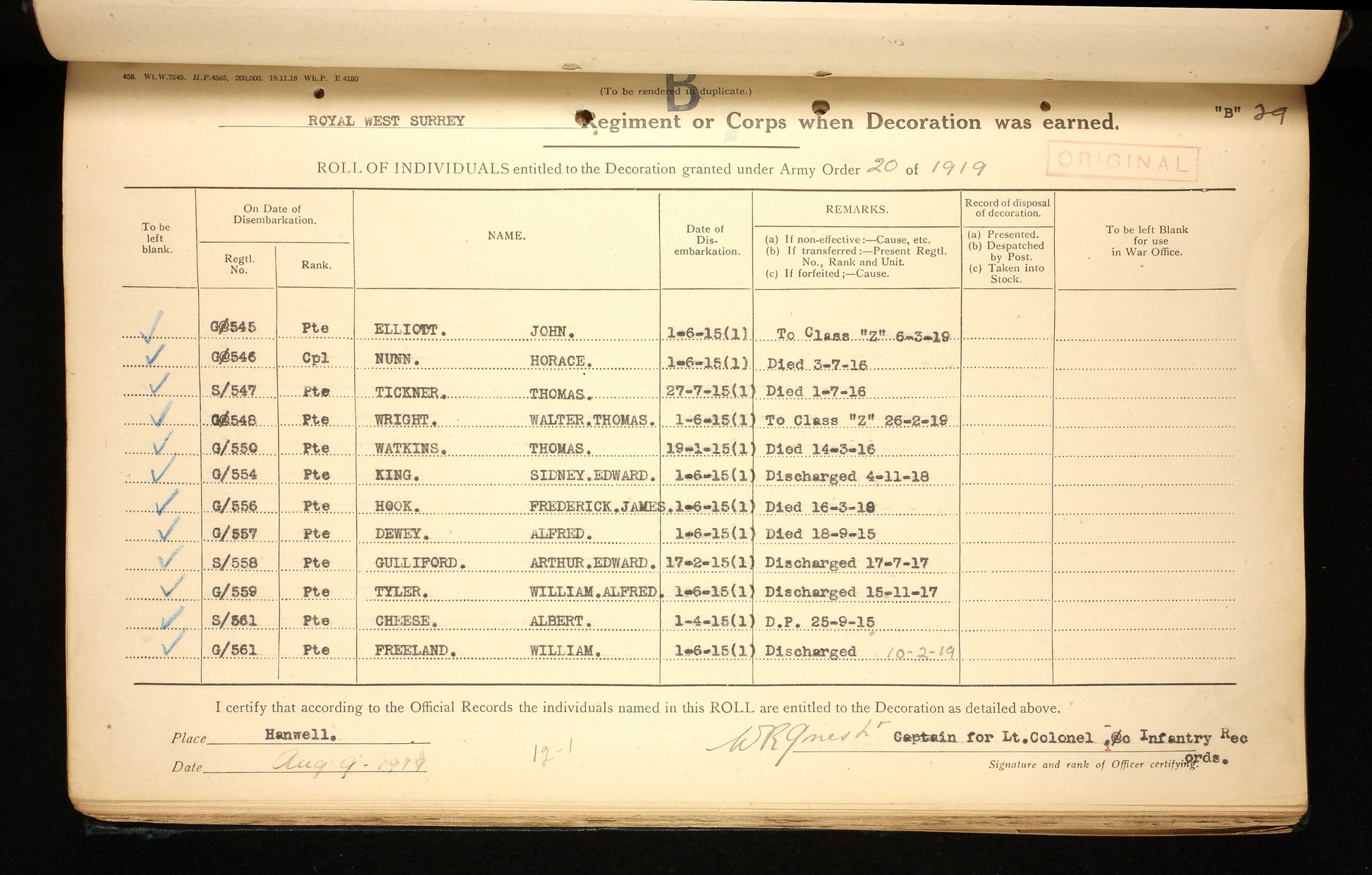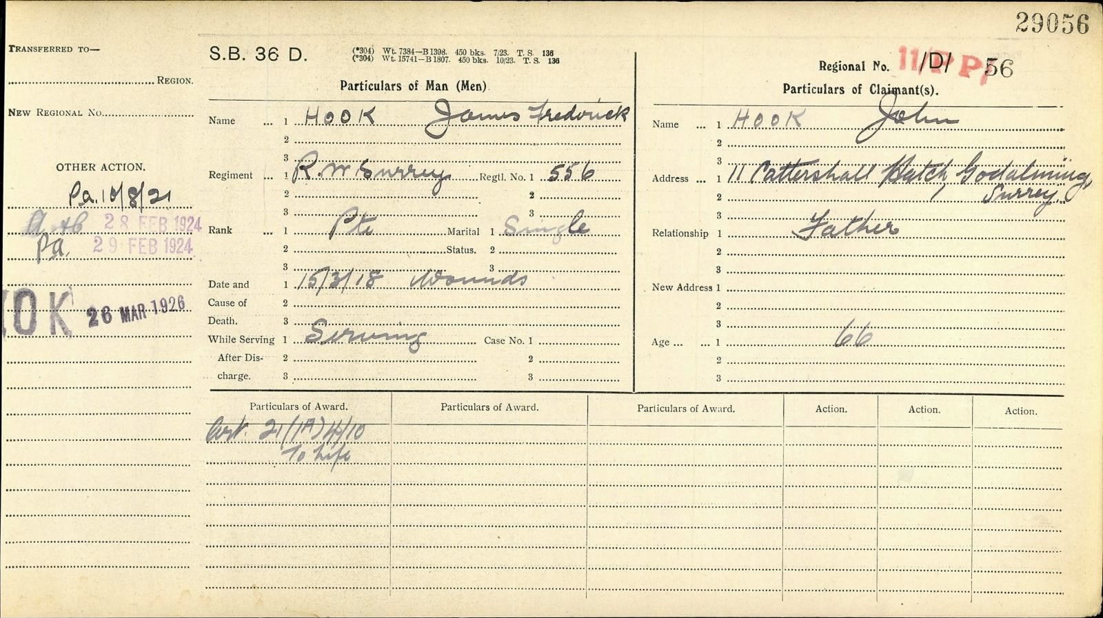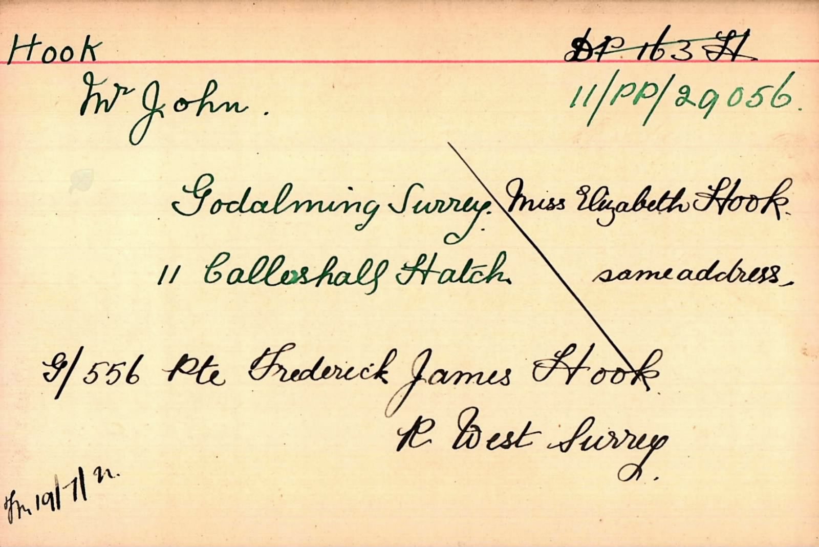 Medals come with original First World War West Surrey cap badge and Pte. Hook's ID Disc