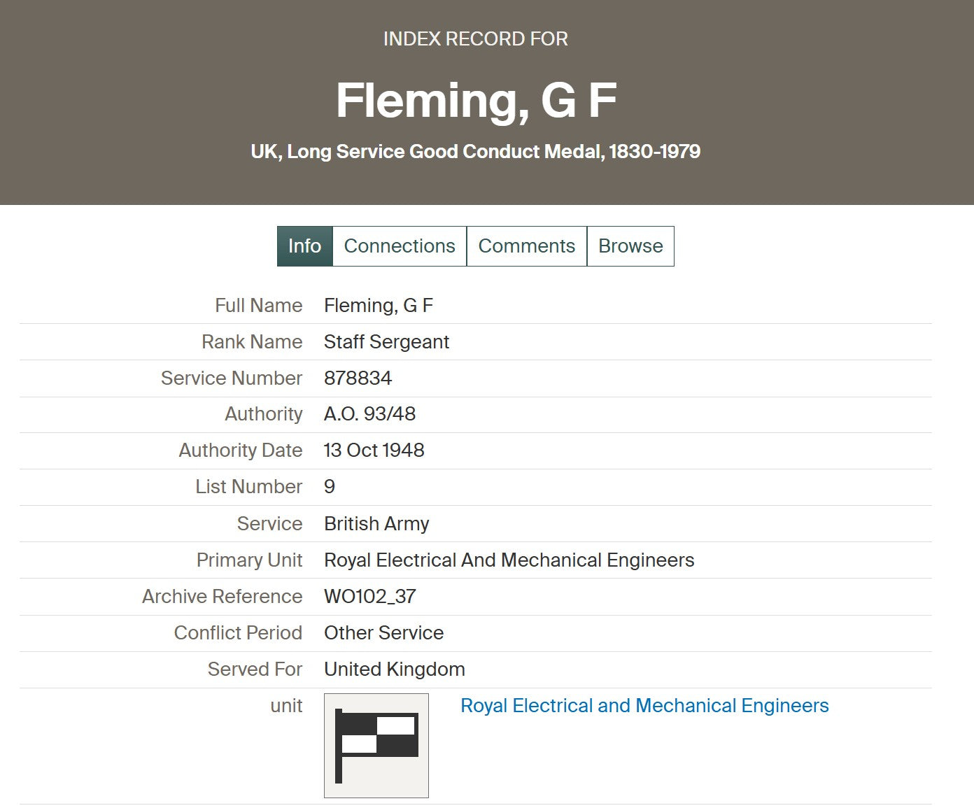Fleming recovered and remained in service, later transferring from the Royal Artillery to the newly-formed Royal Electrical and Mechanical Engineers (REME). His post-war career was long and distinguished: by 1948 he held the rank of Staff Sergeant, and by 1953 he was a Warrant Officer Class II, qualifying for the Queen Elizabeth II Coronation Medal while serving with REME (Territorial Army).