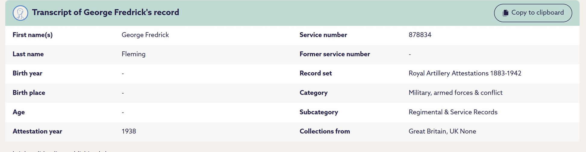 George Frederick Fleming attested for the Royal Artillery in 1938, receiving the service number 878834. He was serving as a Gunner in 302 Battery, 99th (London Welsh) Heavy Anti-Aircraft Regiment, Royal Artillery (TA) at the outbreak of the Second World War.