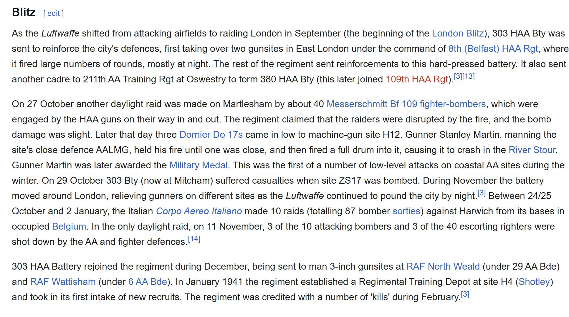 Through late 1940 and early 1941 the regiment took repeated part in the London Blitz, with 303 Battery detached to reinforce the capital’s defences while 302 Battery continued to protect airfields and coastal sites. Wilhelmshaven-based bombers and Italian aircraft flying from occupied Belgium were among the hostile forces encountered, with the regiment credited with multiple aircraft “kills”.