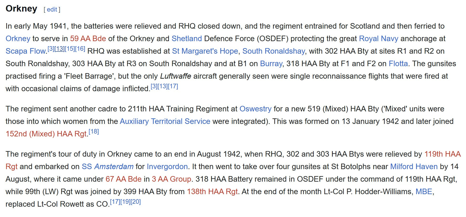 In May 1941, the regiment left the south-east and embarked for Orkney, joining the Orkney & Shetland Defence Force (OSDEF) under 59 AA Brigade, tasked with protecting the Royal Navy fleet anchorage at Scapa Flow – one of the most strategically important naval bases in Europe. 302 Battery manned gunsites on South Ronaldshay (positions R1 & R2), where they trained for “Fleet Barrage” fire and engaged occasional Luftwaffe reconnaissance aircraft.