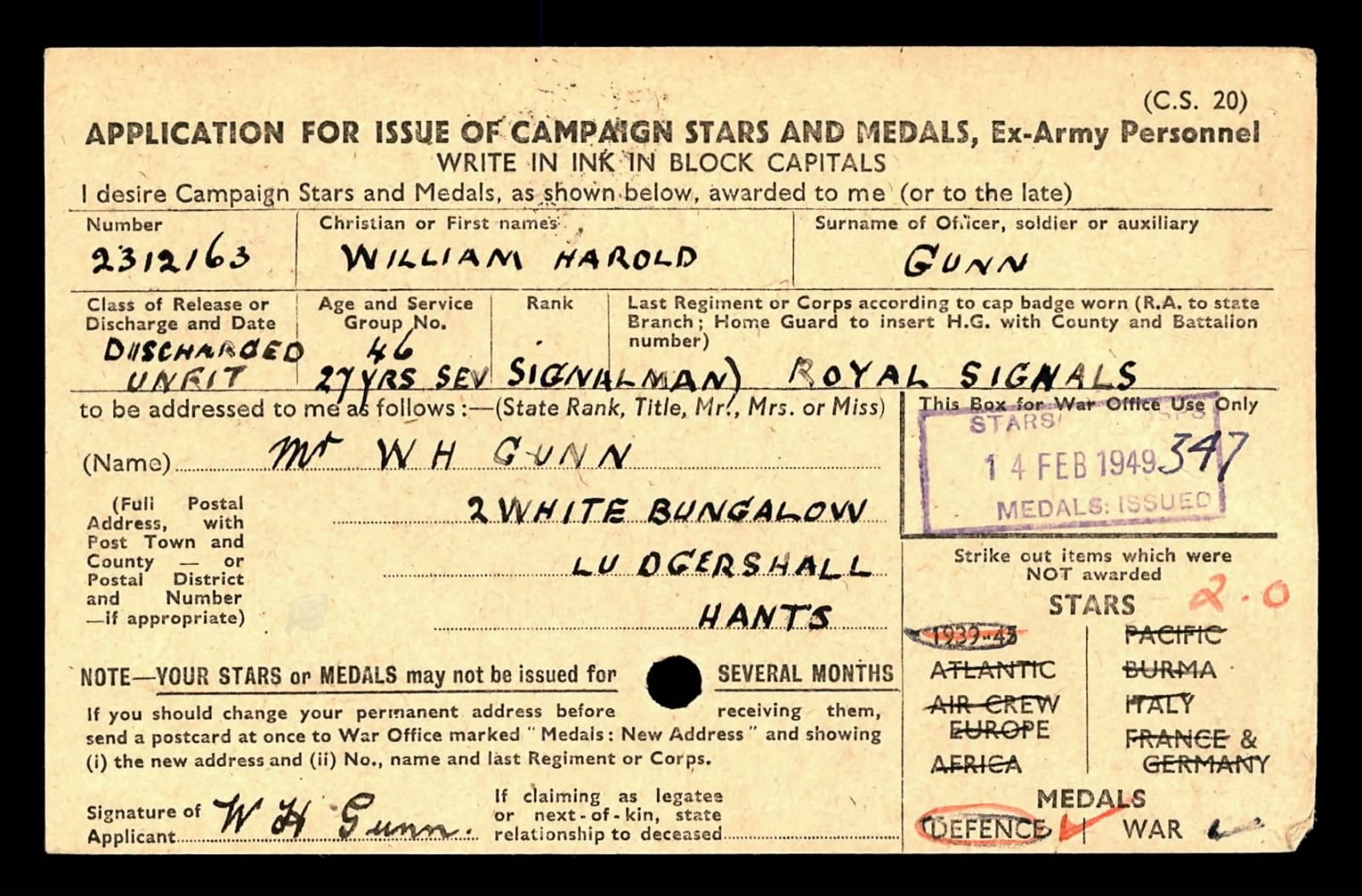 He remained with the Royal Signals through the Second World War, by which time he had completed 27 years’ service. A War Office medal application form dated 14 February 1949 records him as “DISCHARGED – UNFIT”, giving his home address as 2 White Bungalow, Ludgershall, Hampshire, and confirming his entitlement to the Defence Medal and War Medal for WWII service. His signature, “W. H. Gunn”, appears at the foot of the form.