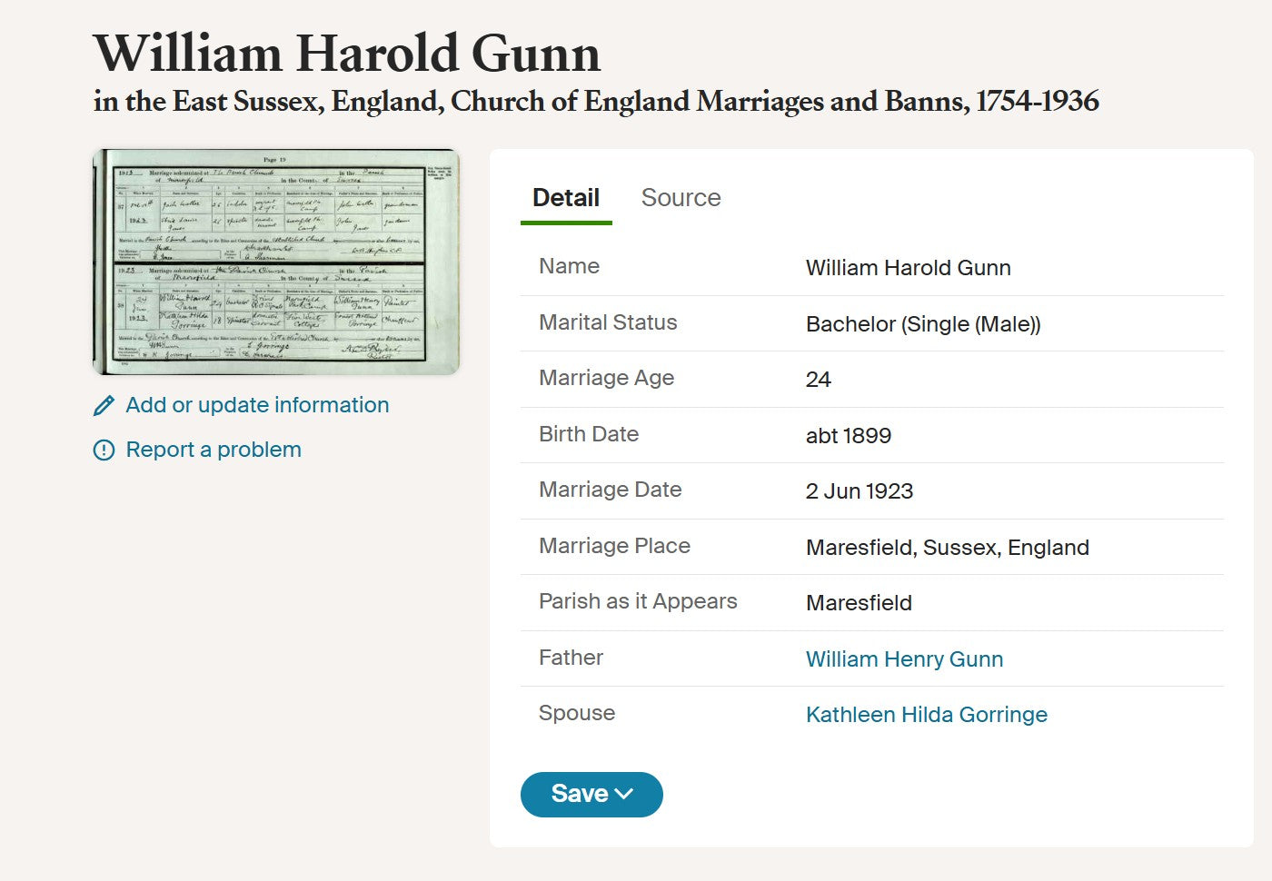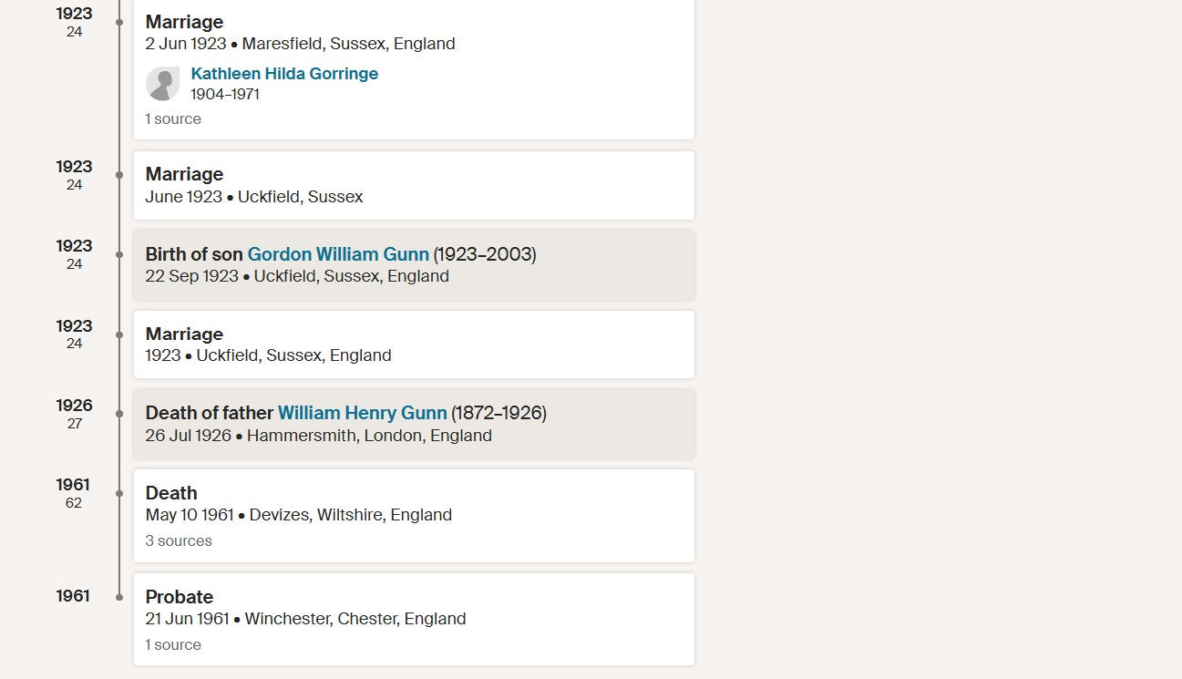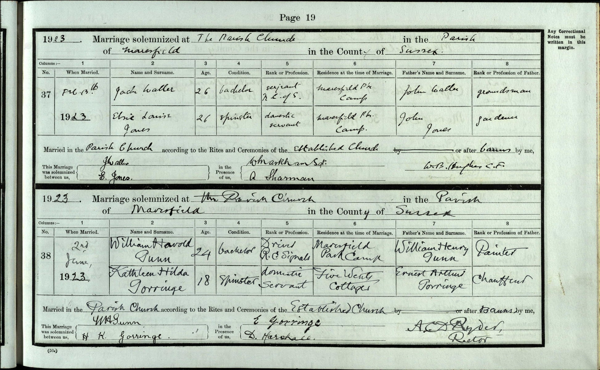 On 2 June 1923, William married Kathleen Hilda Gorringe, an 18-year-old domestic servant, at Maresfield Parish Church. He was then aged 24 and described as being with the Royal Corps of Signals at Maresfield Park Camp. The couple’s first child, Gordon William Gunn, was born later that year in Uckfield, Sussex.