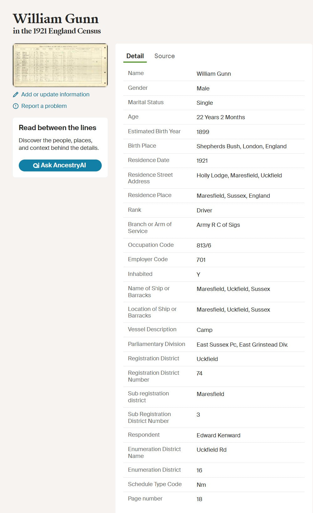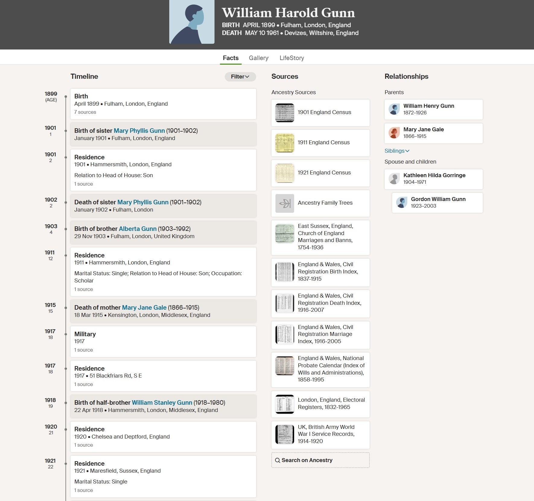 Signalman William Harold Gunn (2312163), Royal Corps of Signals, was born in April 1899 at Fulham, London, the son of William Henry Gunn, a painter, and his wife Mary Jane Gunn (née Gale). He spent his early childhood in Hammersmith, appearing in both the 1901 and 1911 censuses at the family home there, the latter listing him as a schoolboy shortly before the death of his mother in 1915.