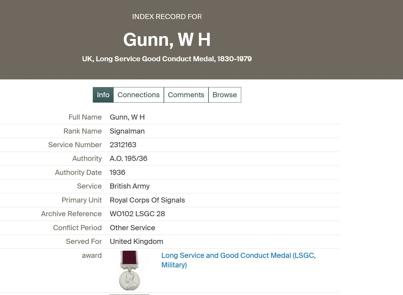 After many years of continuous service, Gunn qualified for the Long Service & Good Conduct Medal (Military), which was awarded to him in 1936 under Army Order 195/36. His medal index confirms his full name as Gunn, W. H., his rank as Signalman, and his service number 2312163.