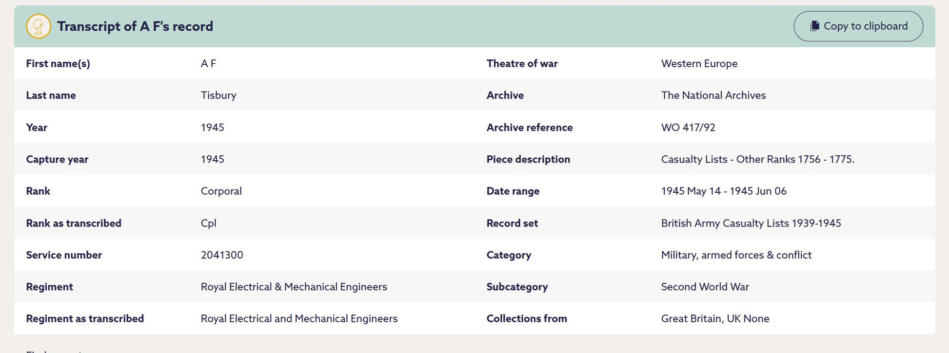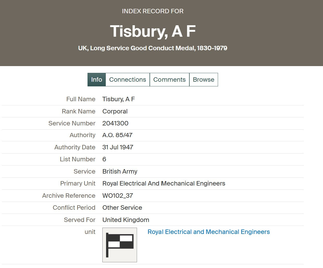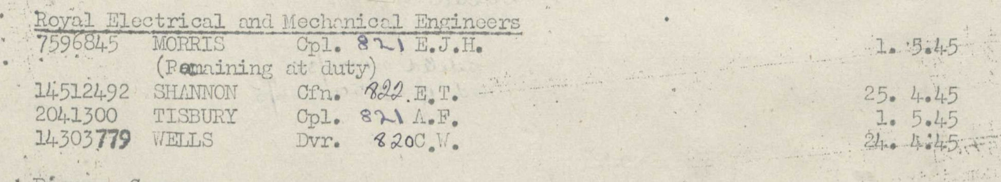 During the Second World War, Tisbury served with the Royal Electrical and Mechanical Engineers (REME), the corps responsible for the repair, recovery and maintenance of the Army’s increasingly complex mechanical and electrical equipment. He rose to the rank of Corporal, service number 2041300, and served in the Western Europe theatre during the final phases of the campaign.