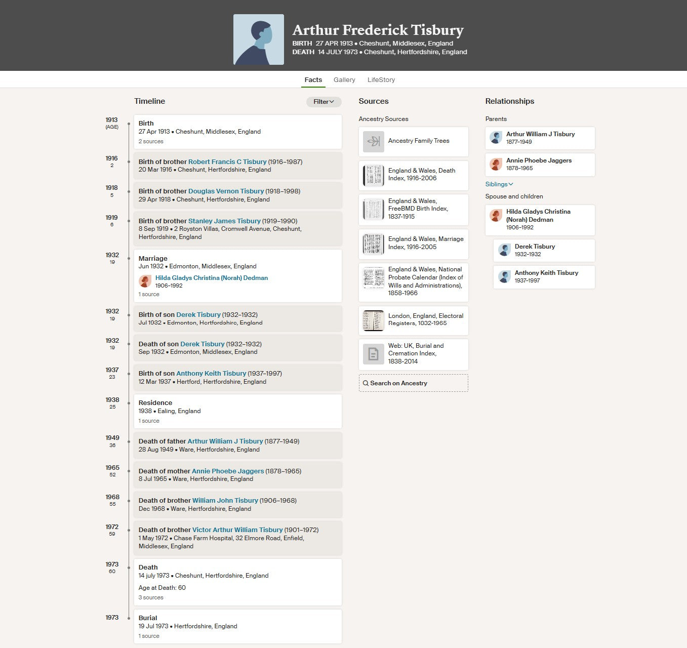 Arthur Frederick Tisbury was born on 27 April 1913 at Cheshunt, Middlesex, the son of Arthur William J. Tisbury and Annie Phoebe Tisbury (née Jaggers). He grew up in the Cheshunt area alongside several siblings and married Hilda Gladys Christina (Norah) Dedman in 1932. The couple later had two sons, one of whom died in infancy. Prior to and after the war, Tisbury remained closely associated with Hertfordshire and Middlesex.