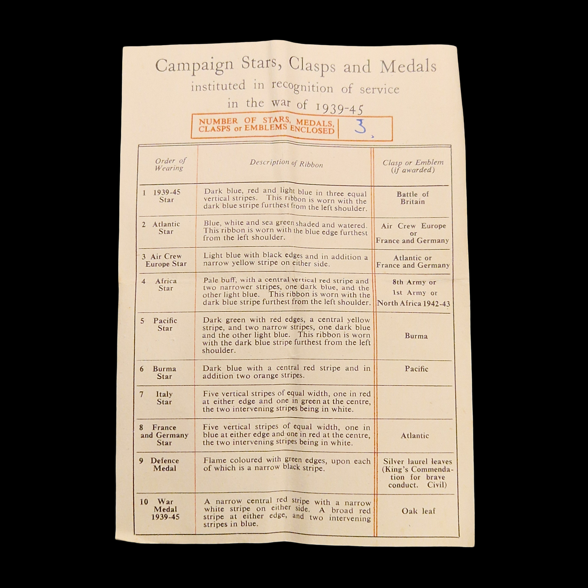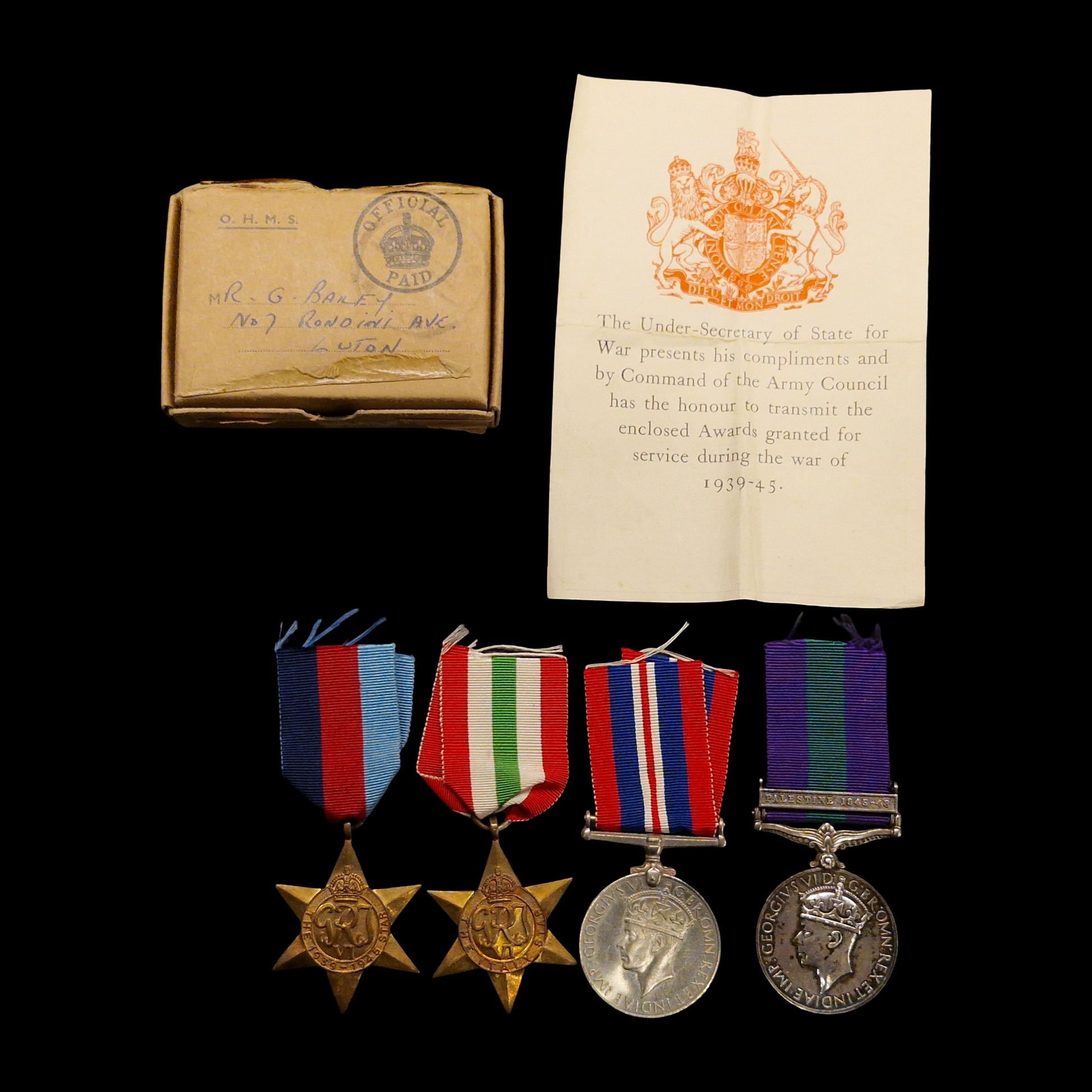 Bailey served during the Second World War and the immediate post-war period, earning the 1939–45 Star, Italy Star, and War Medal 1939–45. His service continued into Britain’s post-war commitments overseas, and he was later awarded the General Service Medal (1918) with clasp “Palestine 1945–48”, recognising his participation in operations during the British Mandate of Palestine. His medal issue is complete with the original named box and forwarding slip, addressed to Mr G. Bailey, 7 Rondini Avenue, Luton, providing excellent provenance and a direct link to the recipient.