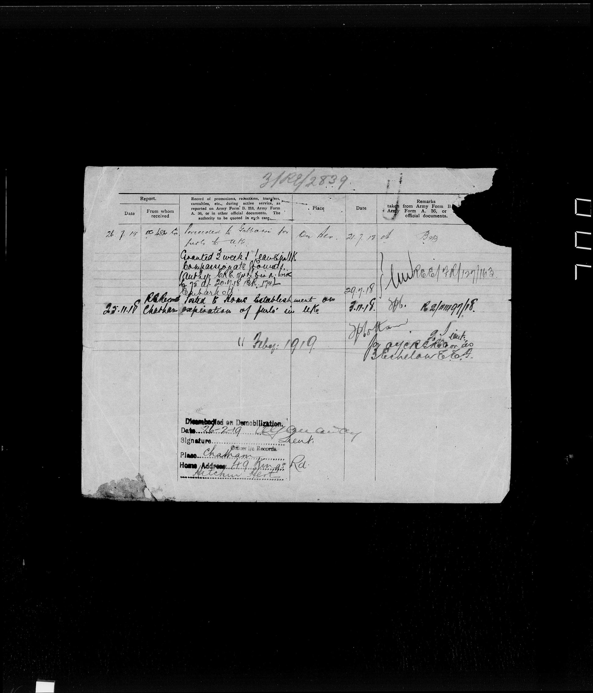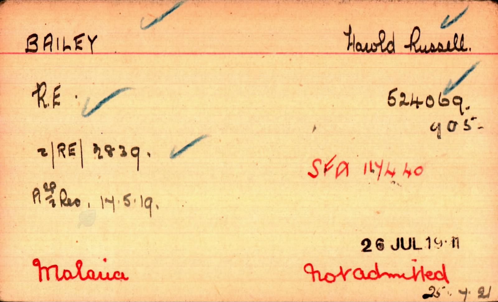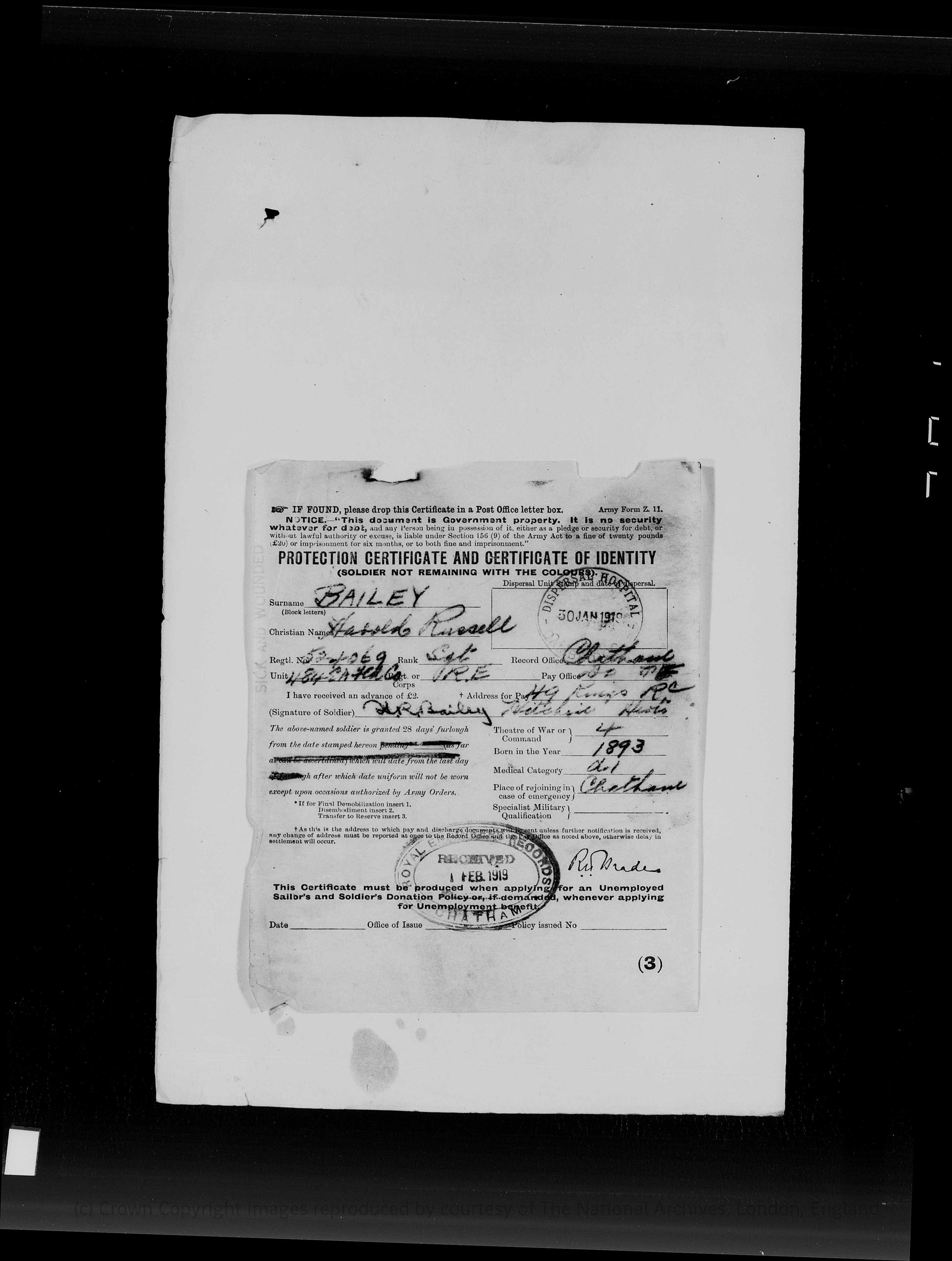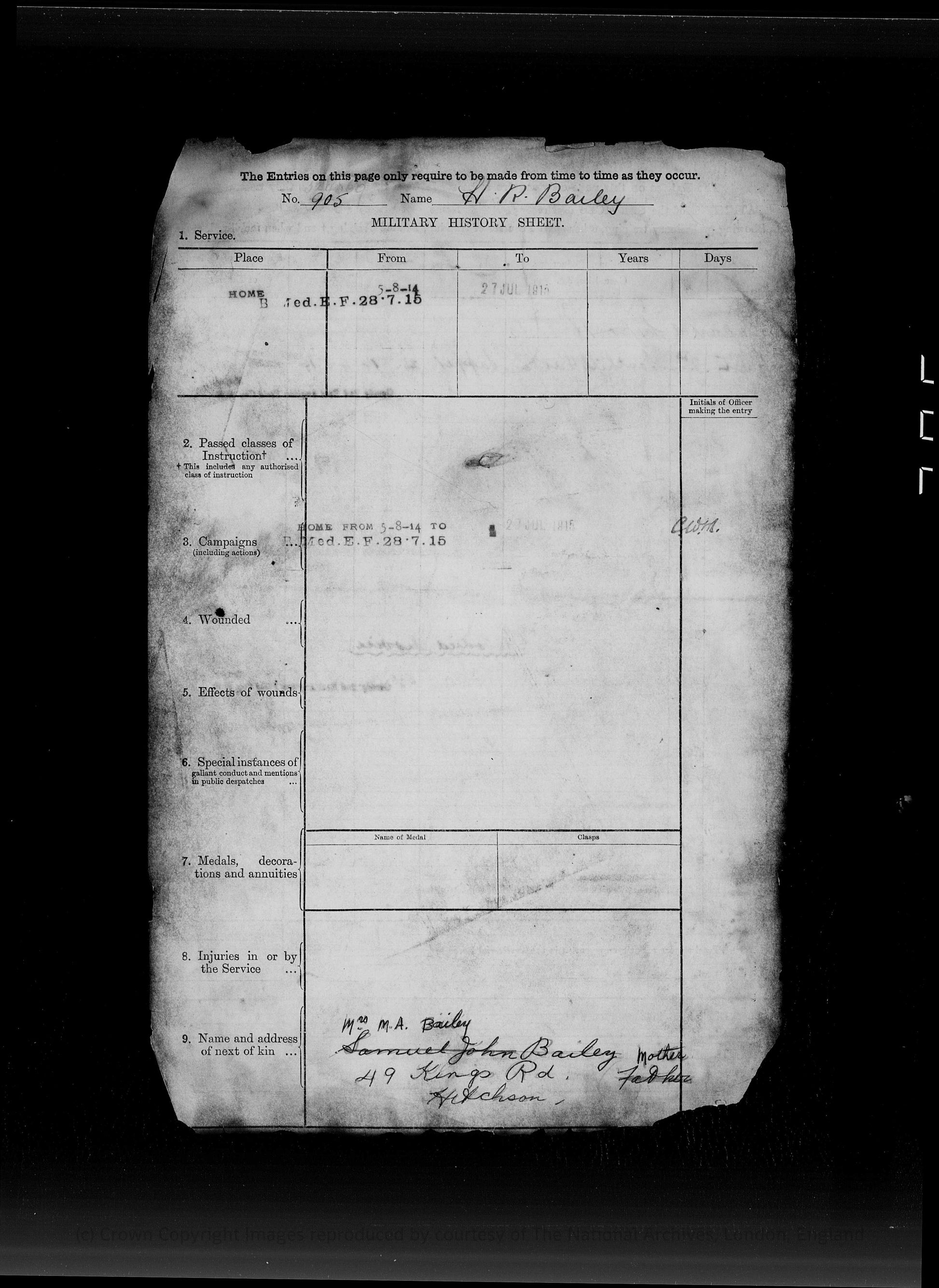 Following the evacuation of Gallipoli, Bailey continued his service in other theatres of war. While serving in the Middle East, he contracted malaria in Palestine in July 1918, a common and debilitating illness among troops operating in the region’s harsh climate. Despite this, his service record reflects steady progression and sustained commitment throughout the war. For his First World War service he was awarded the 1914–15 Star, British War Medal, and Victory Medal.