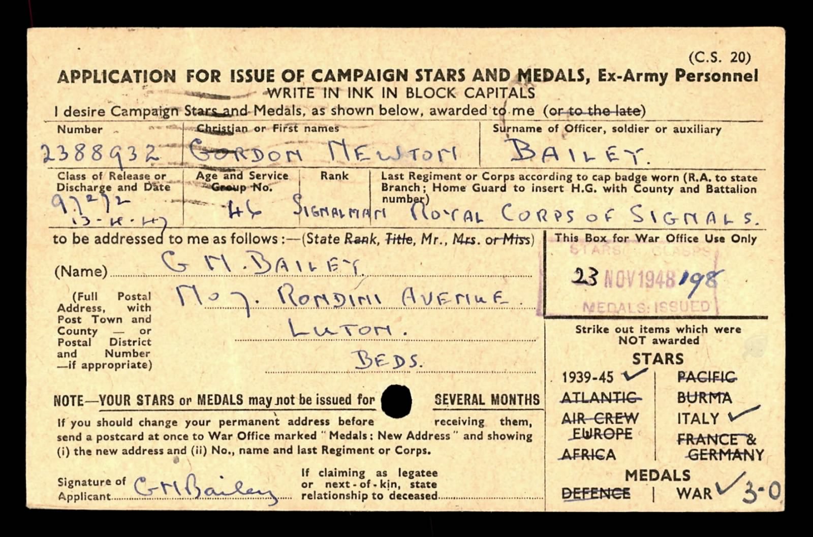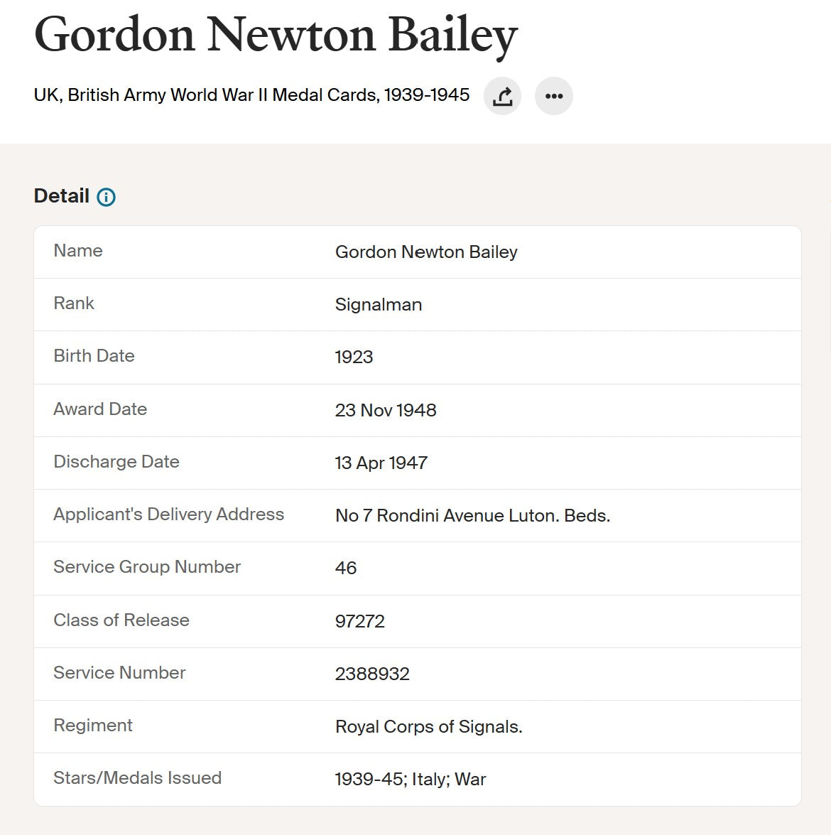 His son, Gordon Newton Bailey, was born at Luton, Bedfordshire, and came of age during the Second World War. He enlisted into the Royal Corps of Signals, serving as a Signalman, a role critical to the coordination and effectiveness of modern military operations. Signal units were responsible for maintaining communications between front-line formations, artillery, and headquarters, often under challenging and dangerous conditions.