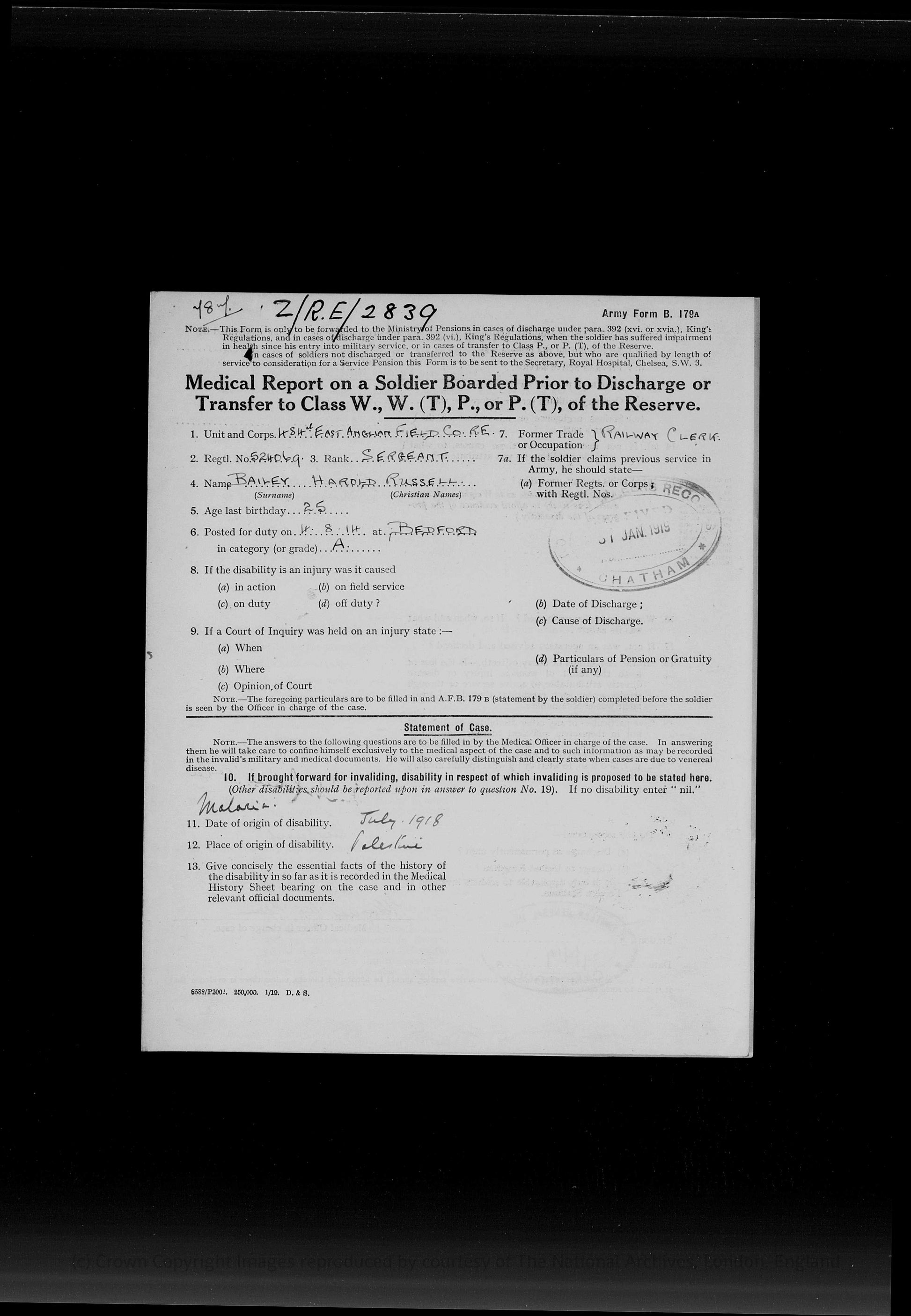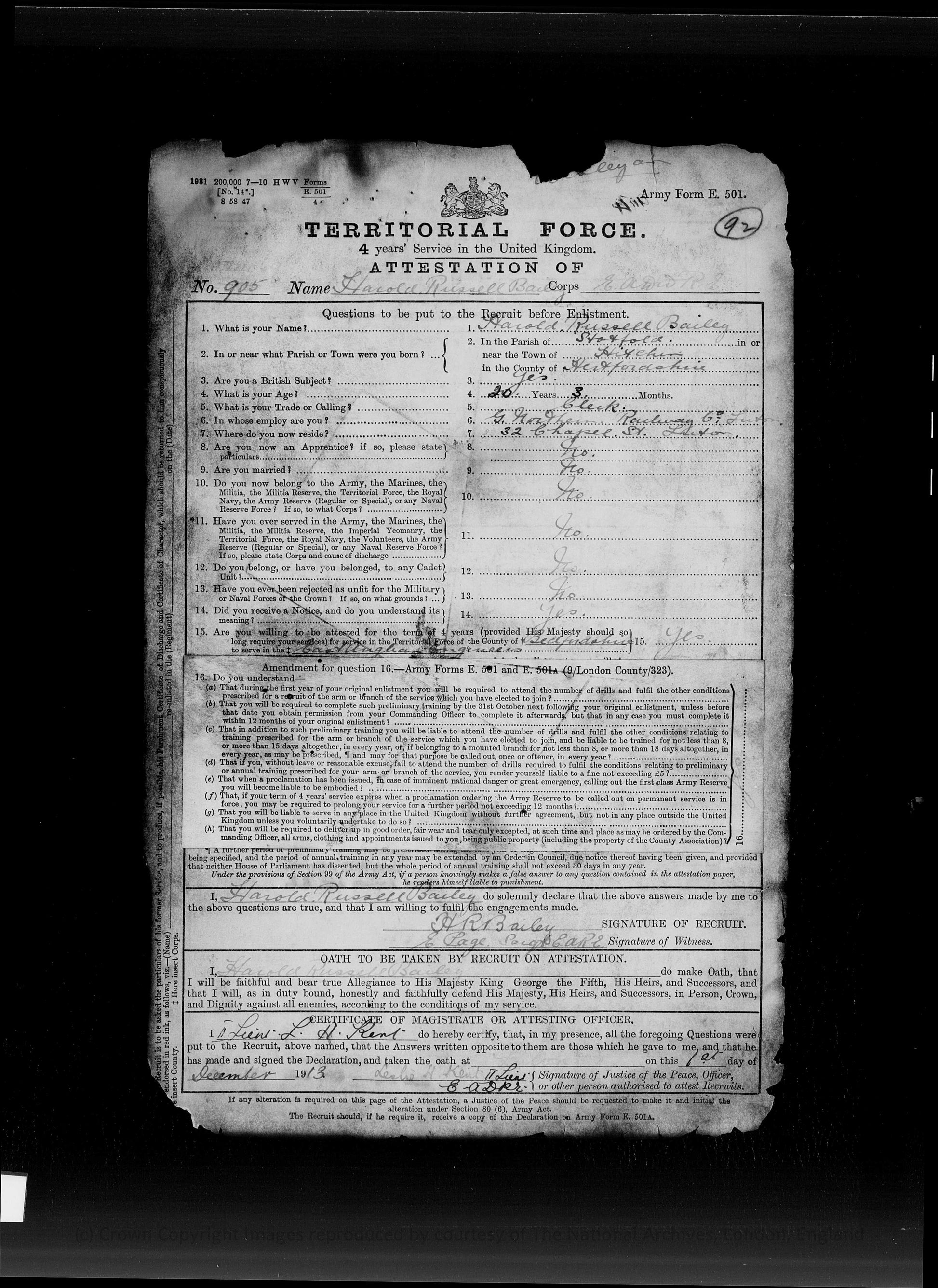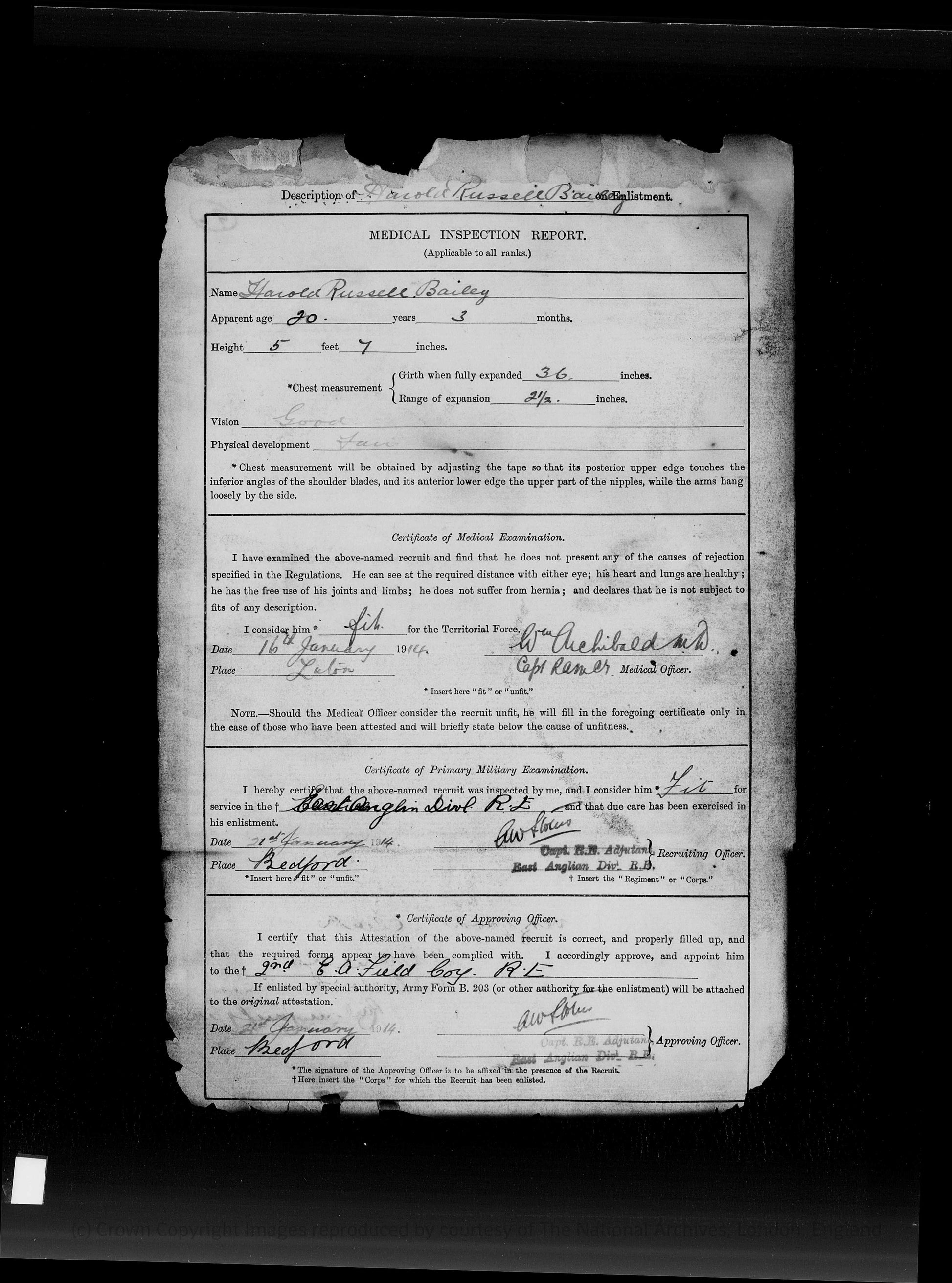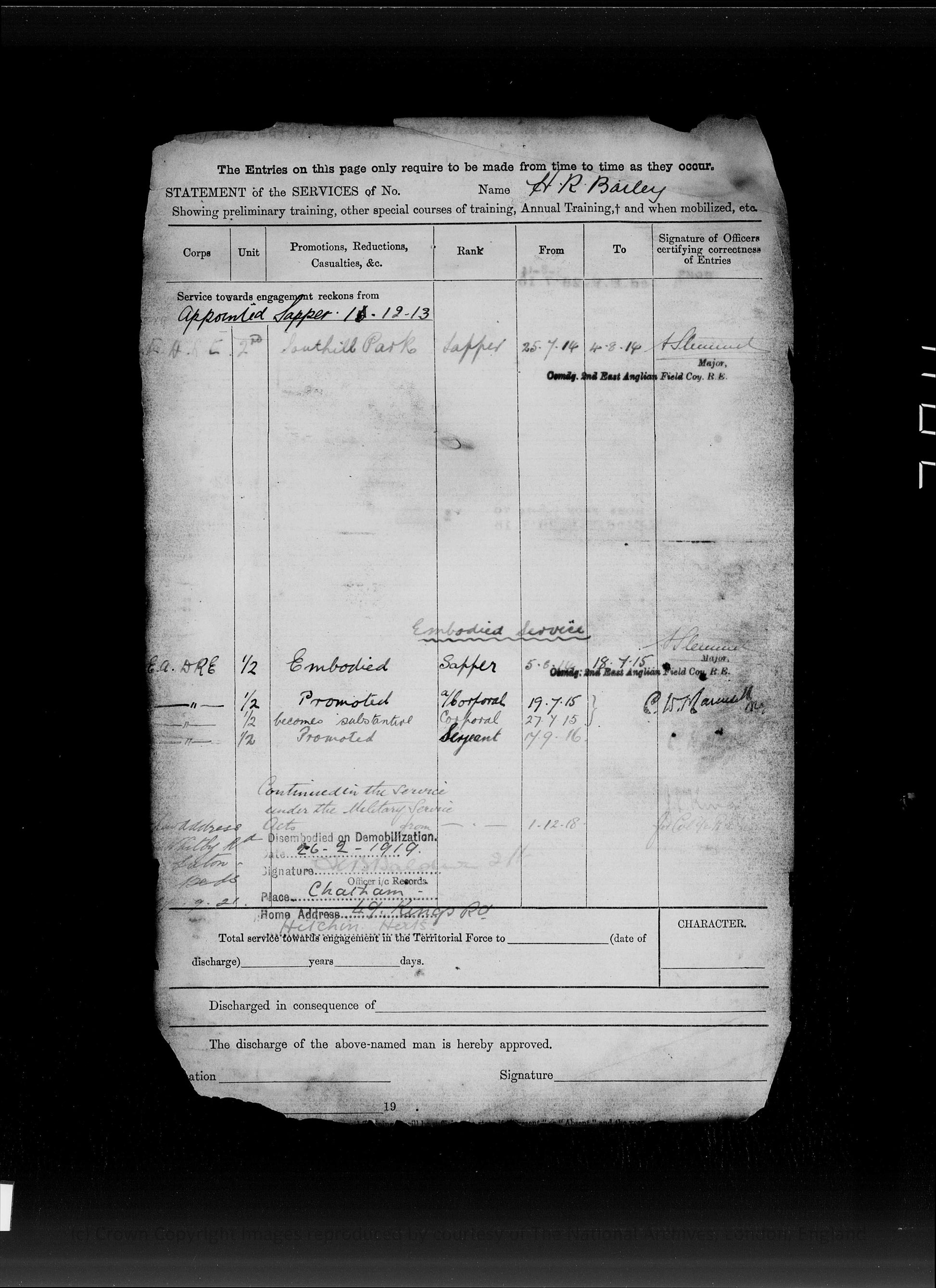 Harold Russell Bailey was born on 5 September 1893 at Stotfold, Bedfordshire, the son of Samuel John Johnson Bailey (1862–1918) and Martha Ann Russell (1858–1946). Prior to the outbreak of the Great War he was employed as a railway clerk, a skilled and responsible occupation that reflected the growing importance of Britain’s rail infrastructure in the early twentieth century. Bailey enlisted into the Territorial Force on 1 December 1913, joining the Royal Engineers, and was already serving when war was declared in August 1914.