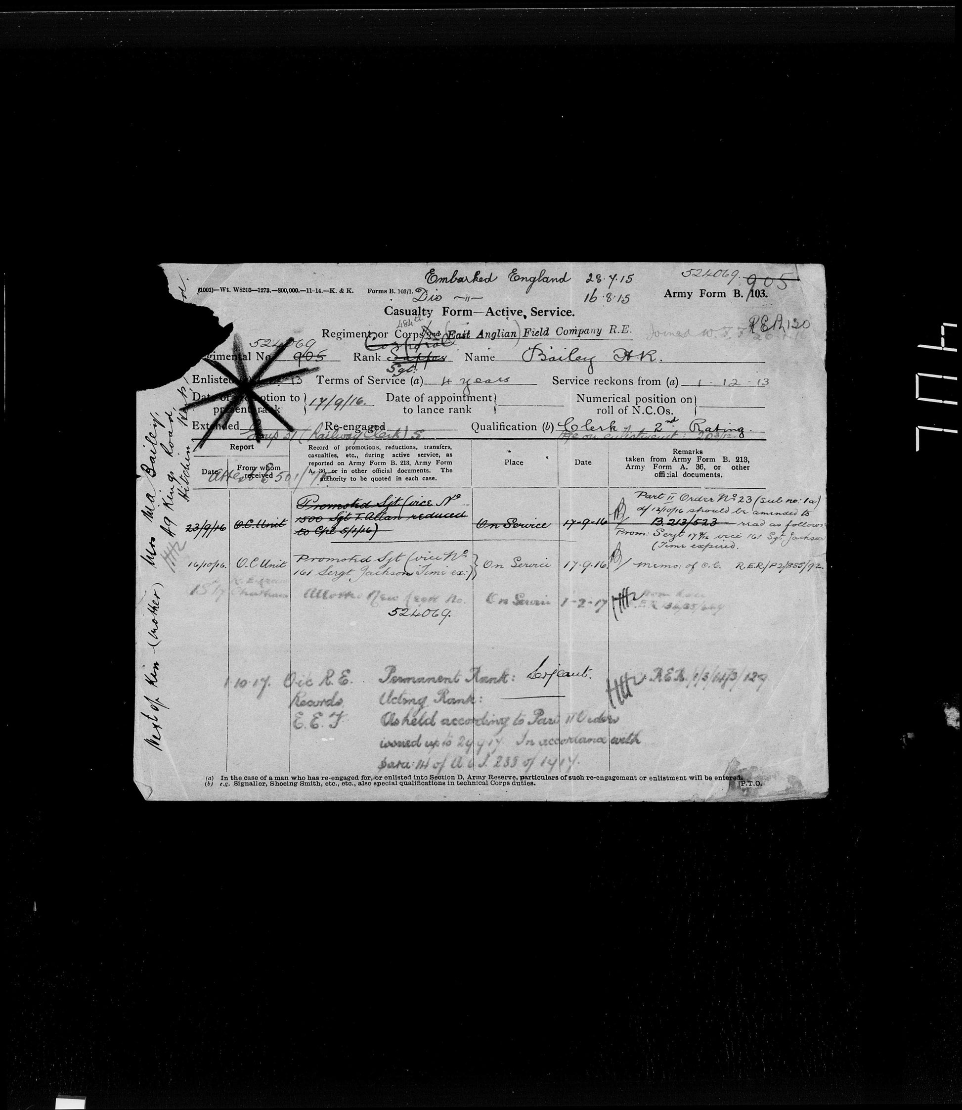 Initially holding the rank of Sapper, Bailey was promoted to Corporal on 27 July 1915, and later advanced to Sergeant on 17 September 1916. He served with the 484th East Anglian Field Company, Royal Engineers, a unit responsible for vital engineering tasks including fieldworks, road construction, water supply, and the maintenance of communications under fire. His overseas service began with the Gallipoli campaign, landing in theatre on 16 August 1915, during one of the most difficult phases of the operation, where Royal Engineer units were heavily engaged in improving defensive positions and maintaining supply routes under constant enemy pressure.
