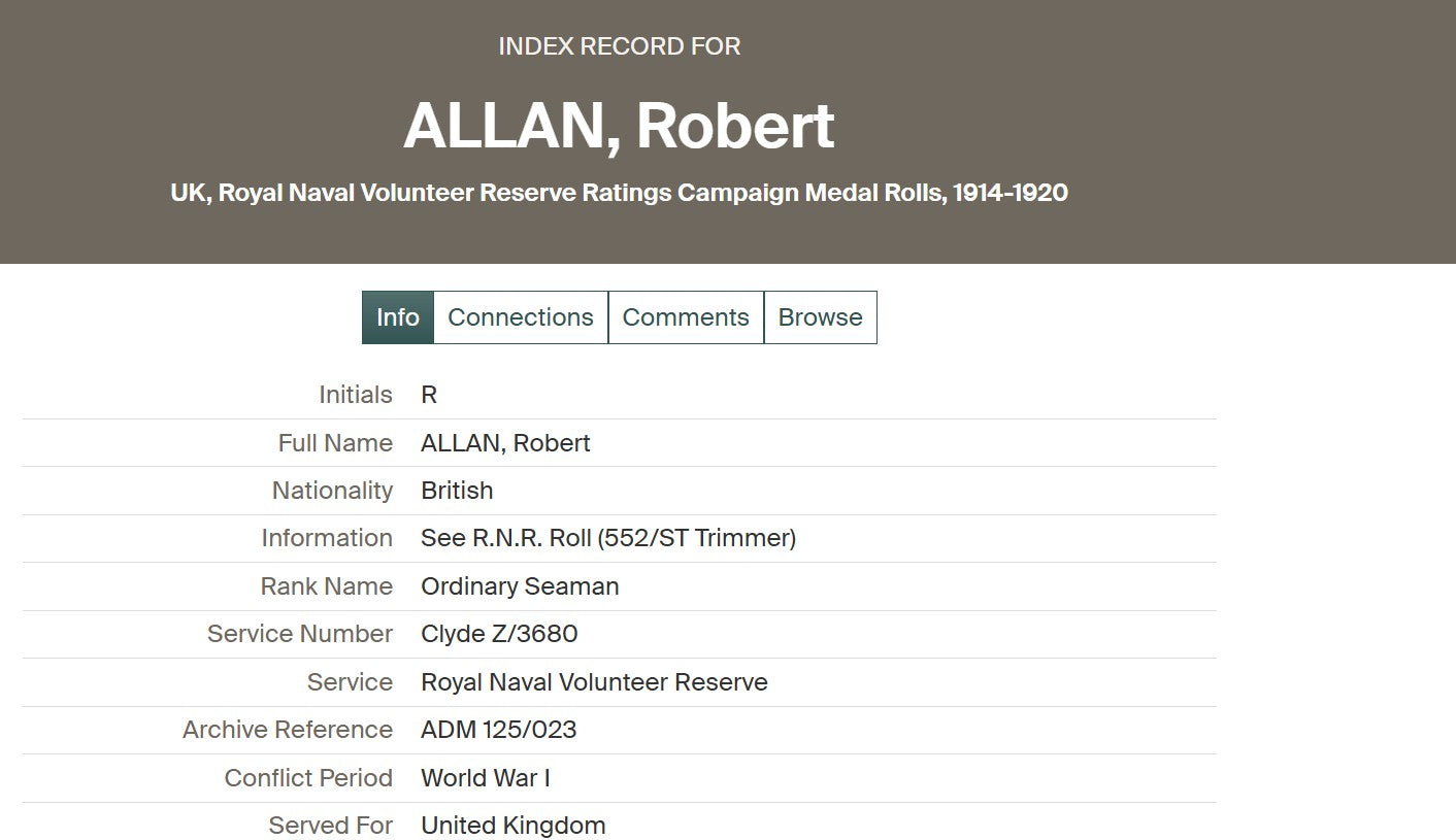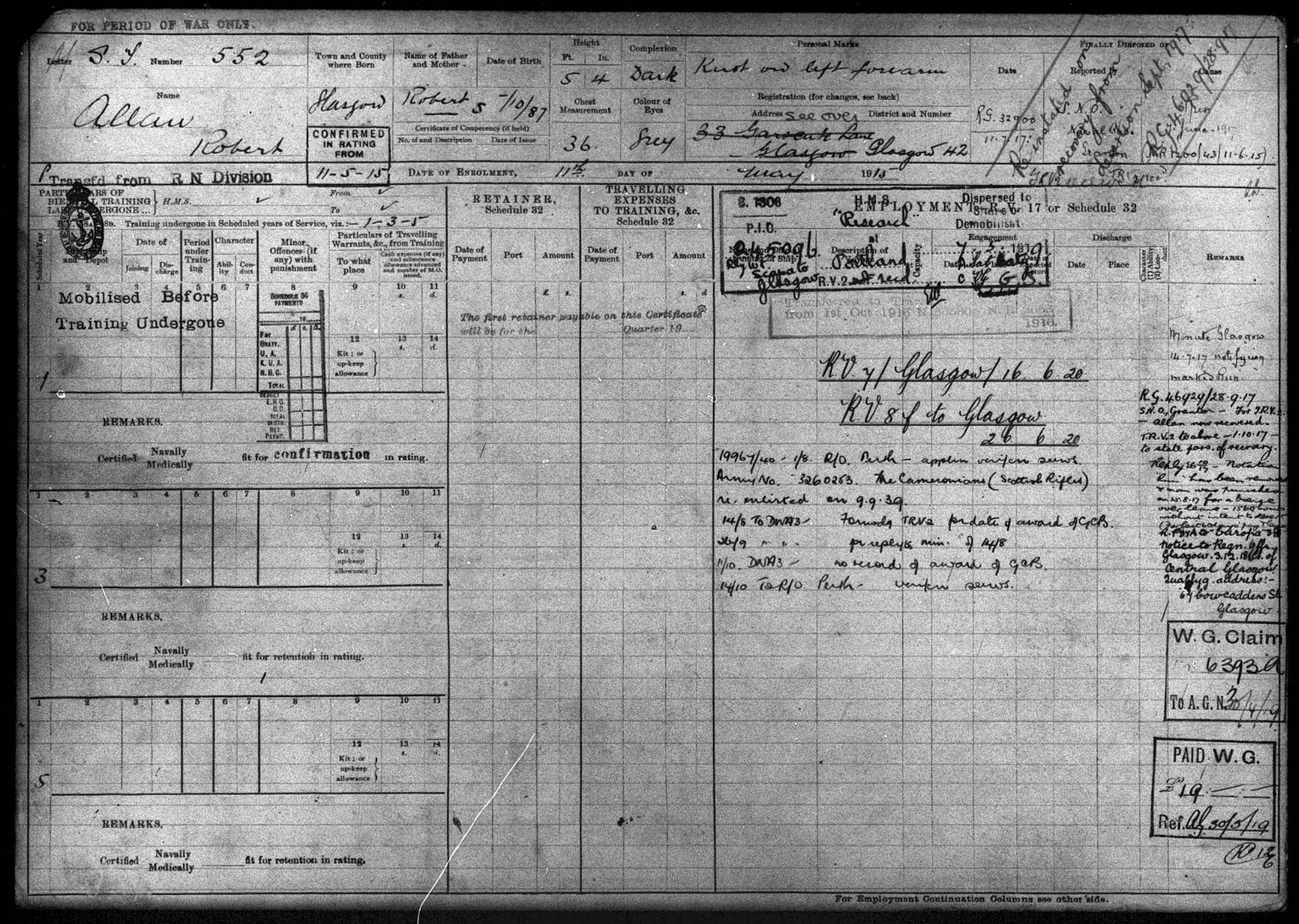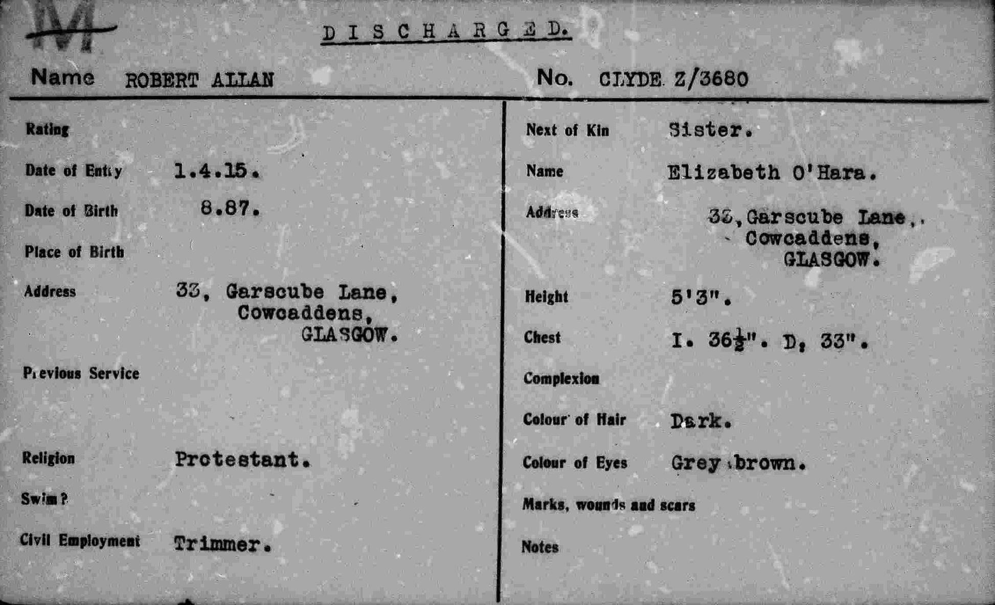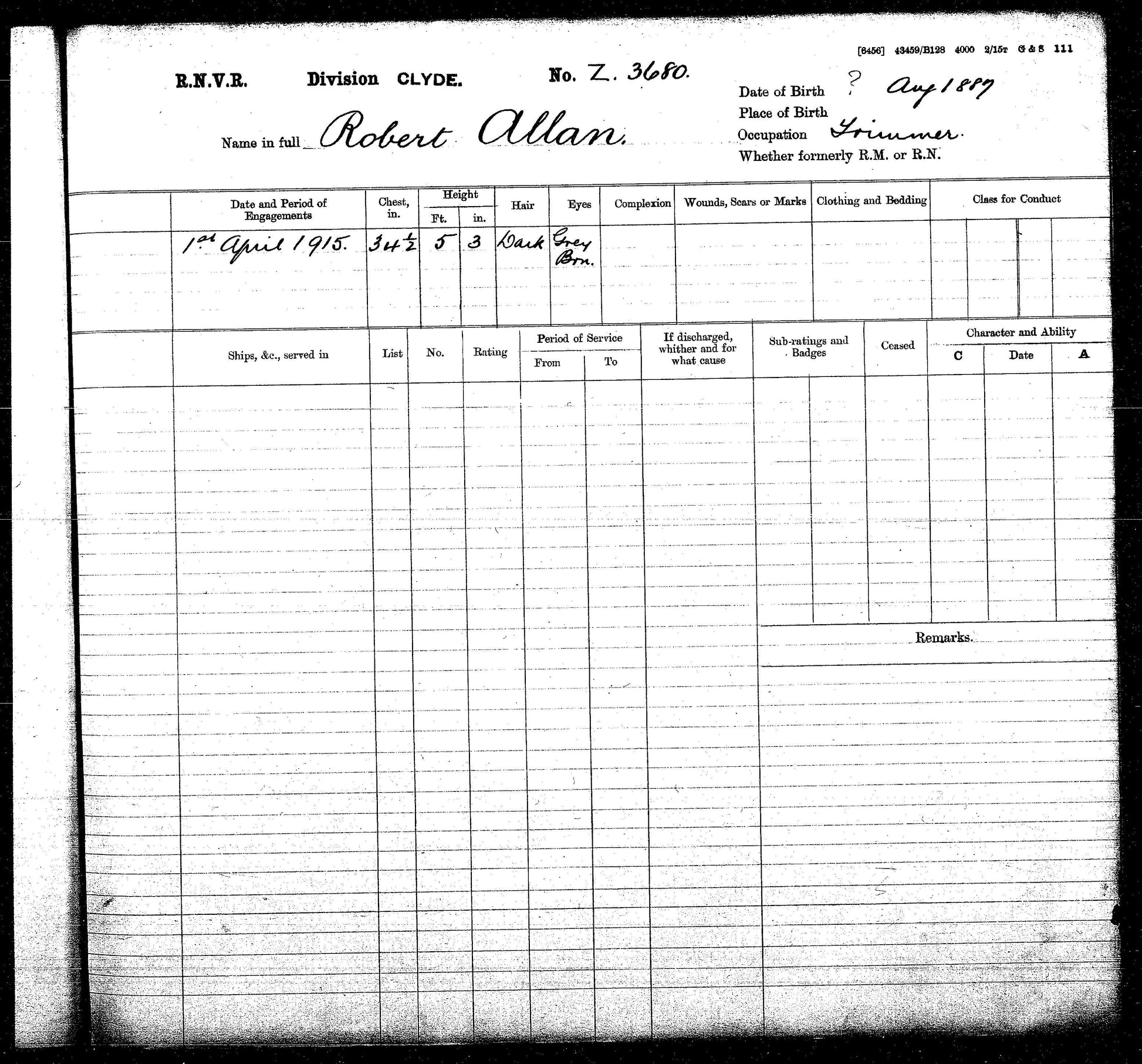Allan entered wartime service with the Royal Naval Volunteer Reserve, enrolling on 11 May 1915, and was rated Ordinary Seaman, serving under the service number Clyde Z/3680. His civilian occupation is recorded as Trimmer, a role closely associated with coal-fired steamships and one which translated directly into naval service during the war. His physical description notes a height of 5 ft 4 in, with dark hair and grey eyes, and he was medically assessed as fit for active service.