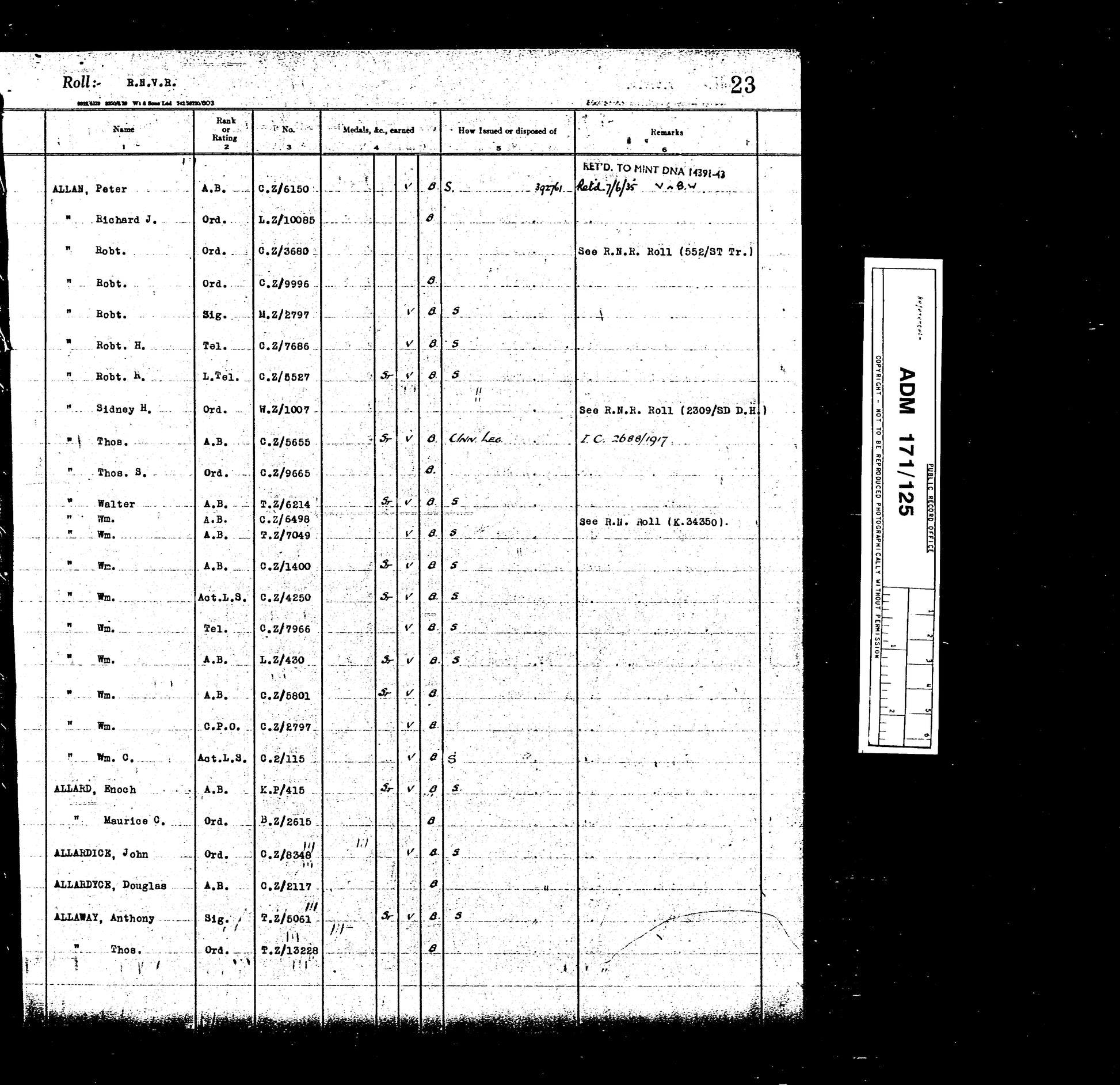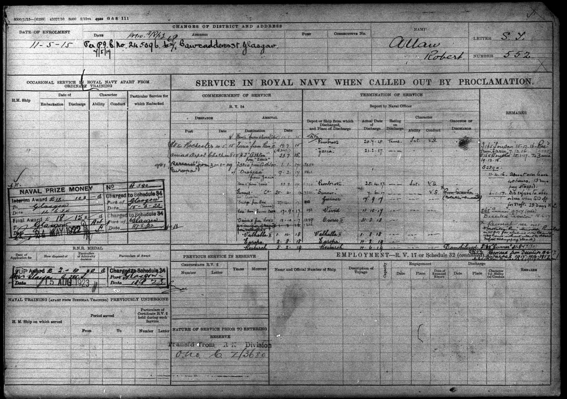 During the First World War Allan served aboard a succession of vessels and establishments, including HMS Pembroke, HMS Zaria, and HMS Vivid, with overseas service recorded in the Mediterranean theatre. His service record reflects continuous wartime employment afloat, and he also qualified for Naval Prize Money, confirming active operational service during the conflict.