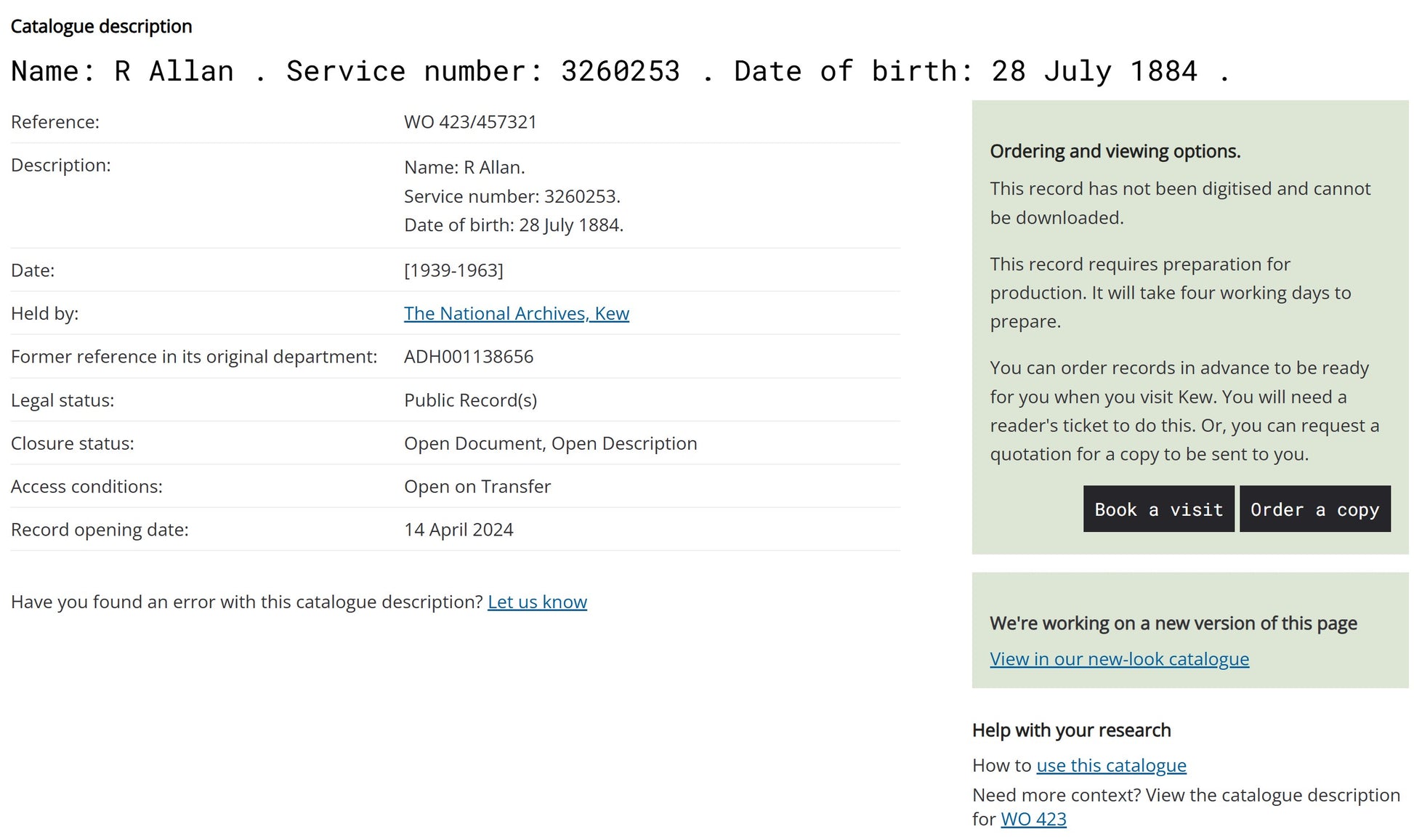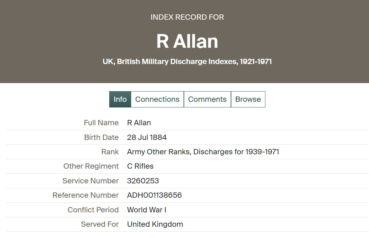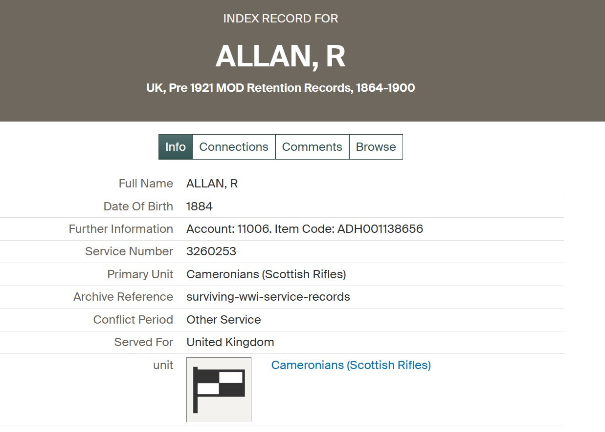 Following the Armistice, Allan returned to civilian life but later resumed military service. During the Second World War he served with the Cameronians (Scottish Rifles), enlisting on 9 September 1939, and serving under the service number 3260253. This later period of service demonstrates a continued commitment to military duty spanning both world wars.