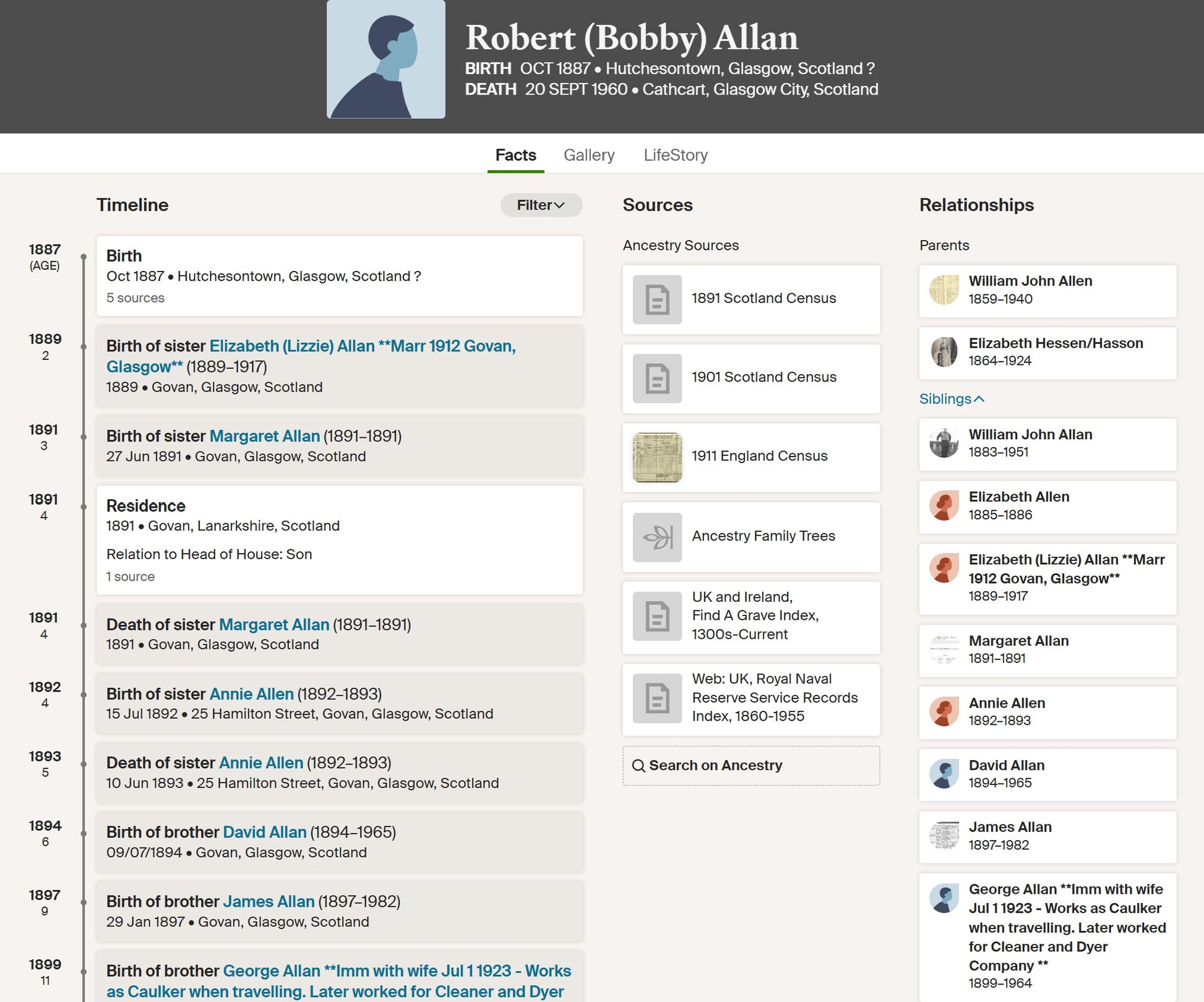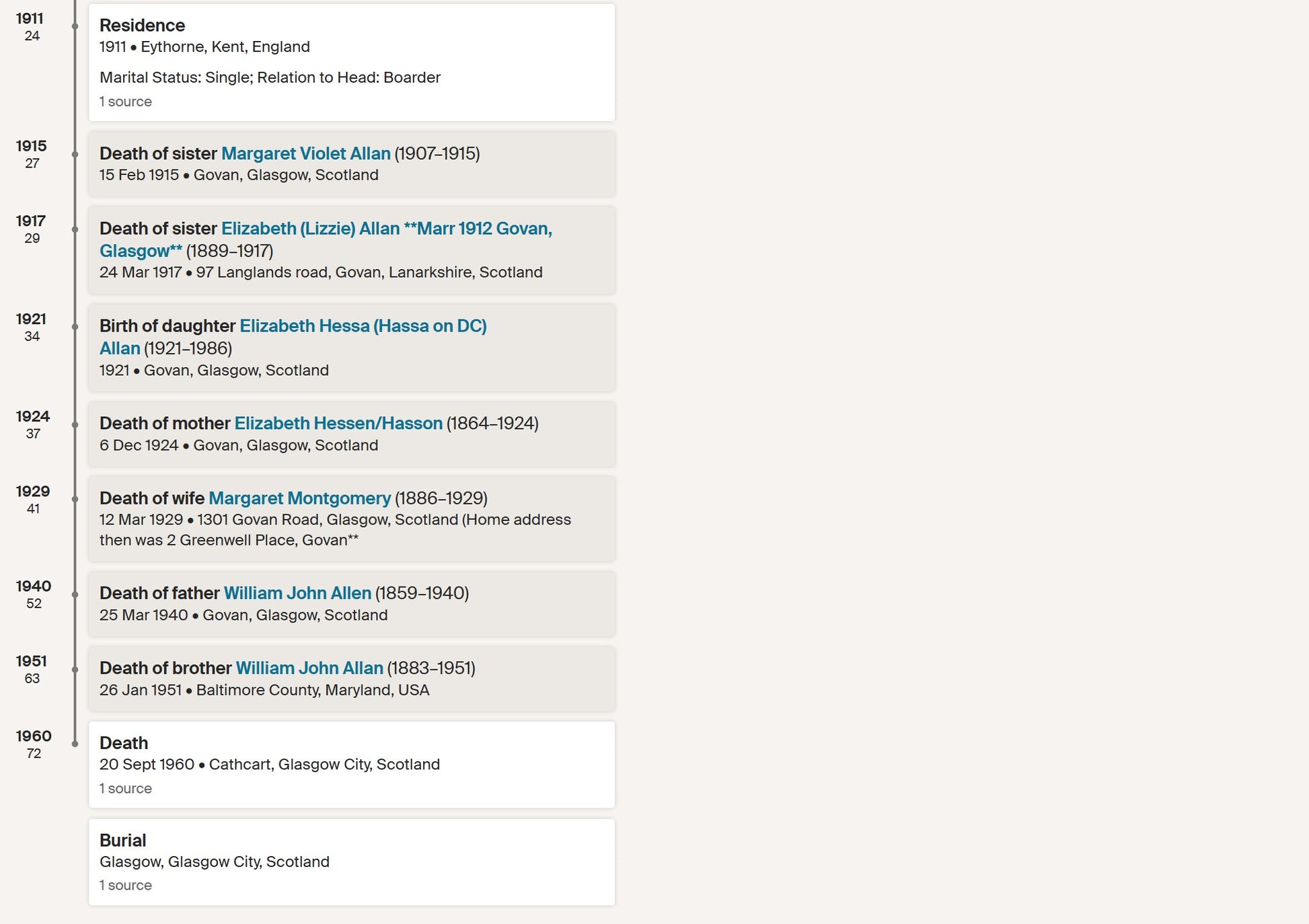 Robert Allan died on 20 September 1960 at Cathcart, Glasgow, aged 72.